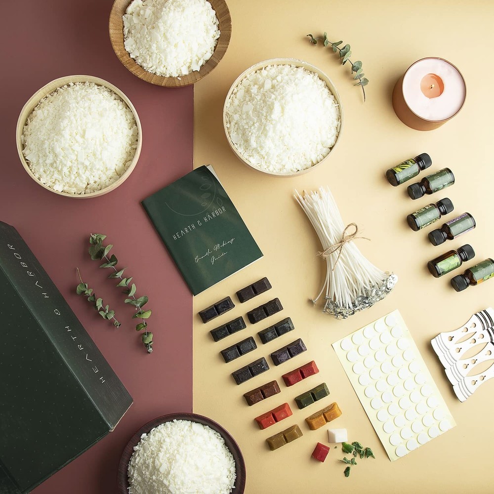 Hearth & Harbor Soy Candle Wax Flakes - Natural Soy Wax for Candle Making Premium 10 lb Bag, 50 Cotton Candle Wicks, 50 Wick Stickers, & 4 Centering Devices Product Details Size: Premium 10 lbs Brand: Hearth & Harbor MPN: VDS-HHDYICM15 UPC: 840284506917 EAN: 0840284506917 Brand: Hearth & Harbor Material: Soy Wax Global Trade Identification Number: 17 Manufacturer: Hearth & Harbor UPC Product Dimensions: 10 x 11 x 6 inches Item model number: VDS-HHDYICM15 Item Weight: 9.9 pounds Manufacturer: Hearth & Harbor Country of Origin: China Date First Available: March 4, 2021 PREMIUM CANDLE MAKING KIT: 50 cotton wicks, 50 glue stickers, 4 metal wick holders, 6 10ml fragrance oils, 16 color dye blocks. Includes Everything you need to make your own candles. EASY TO MAKE: The complete soy candle wax kit of Hearth & Harbor come with very well written and simple-to-follow instructions that will help every beginner make handmade candles at home with ease and total safety. PERFECT GIFT MAKING: Our candle making wax kit is made with premium quality materials and packaged in beautiful box, making it a great gift choice for your loved ones and for special occasions such as birthdays, Mothers Day or Christmas. PREMIUM QUALITY CANDLE WAX FOR CANDLE MAKING: We source top quality ingredients with pure fragrances and tools that are easy to use so that your candles look, smell and burn like premium candles. HEARTH & HARBOR PROMISE: Shop with confidence, because no matter what, we have a solution for you!