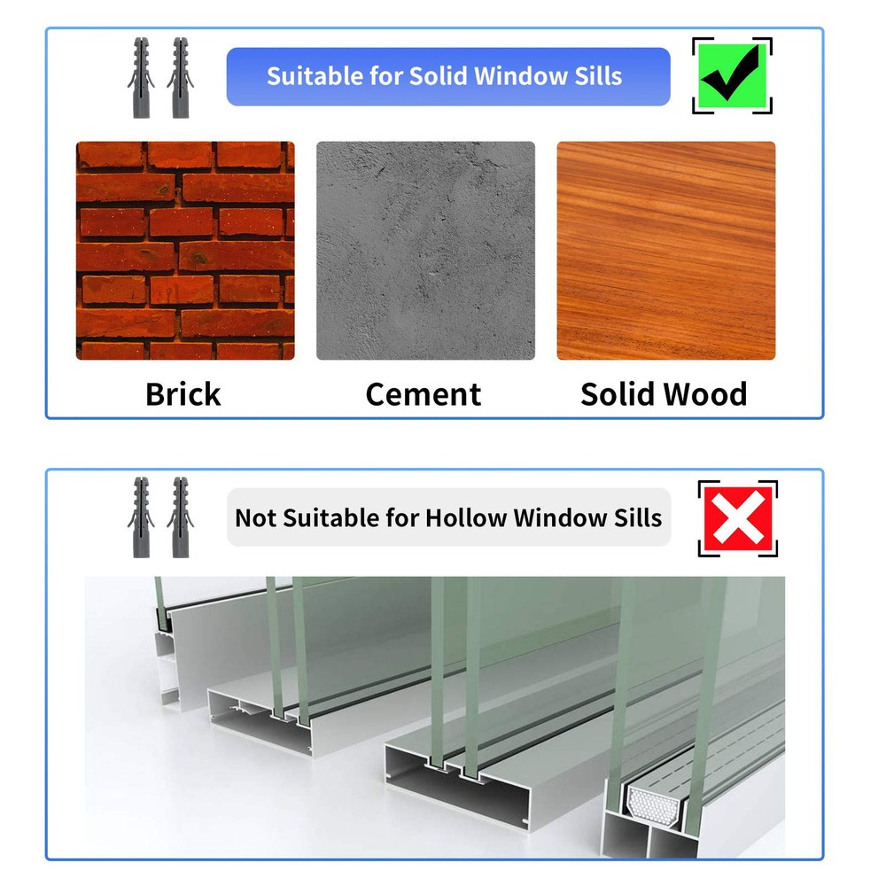 UNIVERSAL DESIGN - adapts to most window units (check description below for window requirements) INDOOR INSTALLATION - easy breezy install, without exterior work, just drilling into window sill RELIEVES STRESS ON THE WINDOW - Transfers the stress and weight from the window sill and sash to the support and window frame for safety FITS WALL THICKNESS from 2" to 15.2", exclusive built-in bubble level to correct mounting slope position ALL NECESSARY HARDWARE INCLUDED and all weather construction. Note: If you found feet pad of the leg cannot justly face the wall; please unlock it and turn it over, then fix it in the leg again. Patent No. US D989611