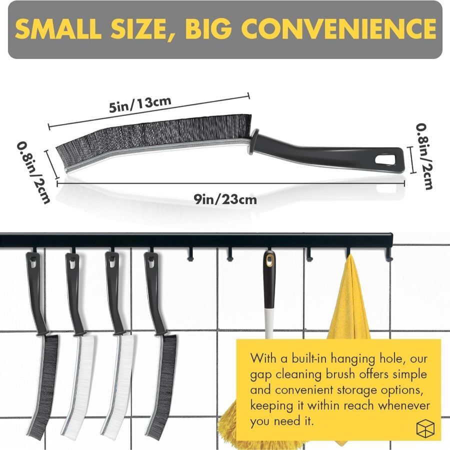 About this item Hard-Bristled Efficiency: Equipped with a robust hard-bristled brush head, this crevice gaps cleaning brush ensures maximum cleaning efficiency. The durable bristles effectively agitate and loosen stubborn dirt, allowing you to effortlessly scrub away the toughest stains and build-up. Experience the satisfaction of a thorough and deep clean every time. Durable Construction, Comfortable Grip: This hard bristle brush for cleaning is built to last, with a sturdy structure and ergonomic design. Its slim and elongated shape effortlessly reaches tight gaps and crevices, while the comfortable grip ensures easy and comfortable cleaning. Versatile Cleaning Tool: This small spaces cleaning brush is a must-have multifunctional cleaning tool that excels at tackling hard-to-reach areas and tight spaces. Whether it's narrow gaps, dead corners, or deep crevices, this crevice cleaning brush is specifically designed to remove dirt, dust, and grime with ease, leaving your surfaces spotless and immaculate. Safe for Any Surface: Worried about damaging delicate surfaces? Fear not! Our crevice cleaning tool brush is engineered to be safe for use on a wide range of materials. From bathroom tiles and kitchen countertops to window tracks and sliding door grooves, you can confidently clean without the risk of scratches or abrasions. Easy to Clean and Store: Cleaning up after cleaning is hassle-free with our small crevice cleaning brushes. Simply rinse the gap brush under running water or give it a quick wipe to remove any residue. Its compact size and ergonomic design make it effortless to store. Hang it up, tuck it away, or keep it within reach for easy access whenever you need to conquer those hard-to-reach areas. Dimensions: 9"L x 0.8"W x 0.8"H