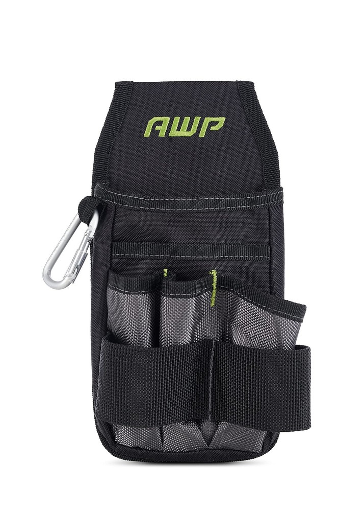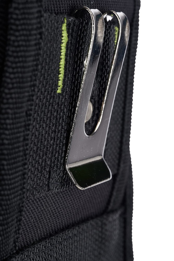 Tool Pouch with belt clip features 7 pockets and loops to ensure your tools are organized and close at hand Constructed from water-resistant reinforced polyester that is built to handle any conditions on the jobsite Includes carabiner snap hook for attaching small tools or keys. Also features interior elastic organization pockets, making it ideal as an electrician tool pouch, as well as for other worksite projects Attach the tool pouch to your tool belt with tunnel loop or metal clip The tool pouch features a black and green design