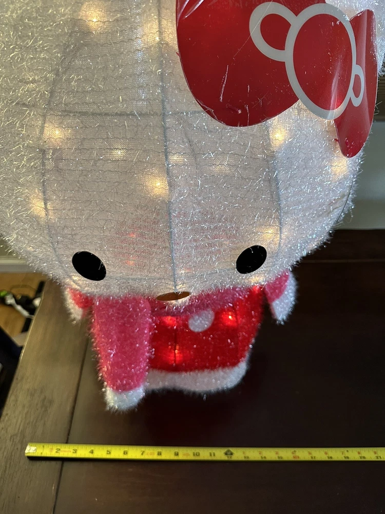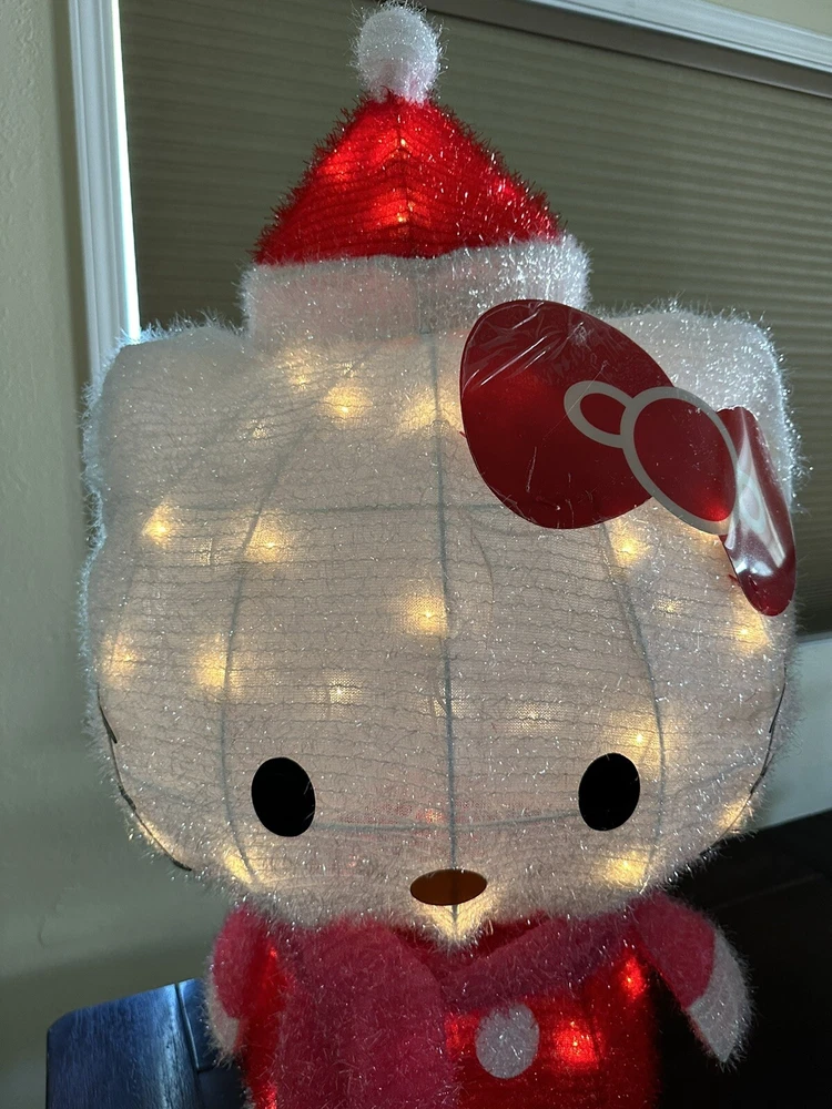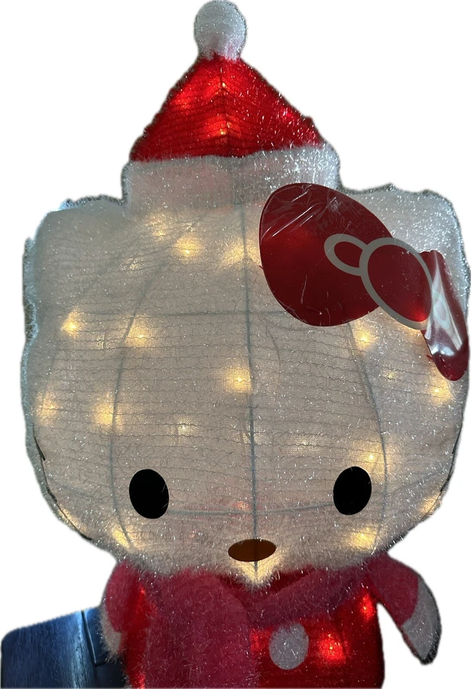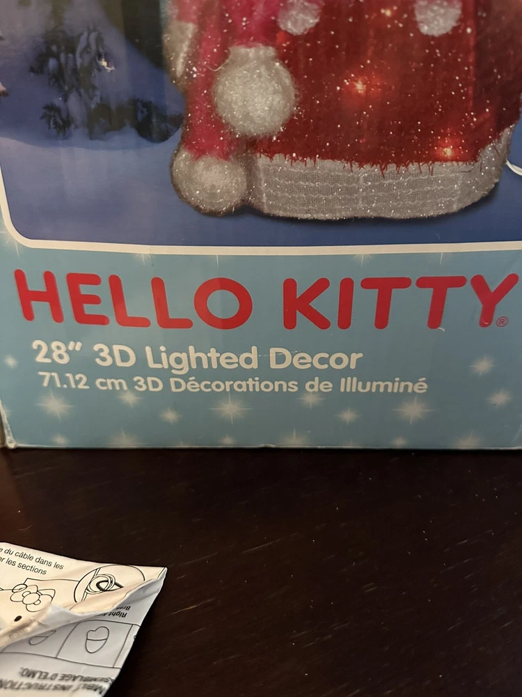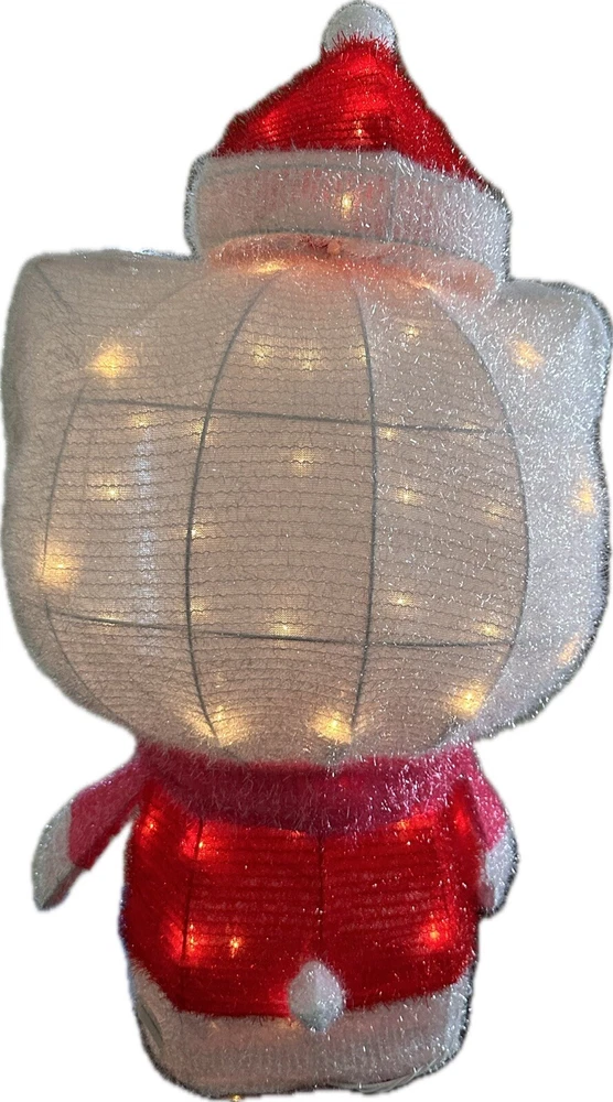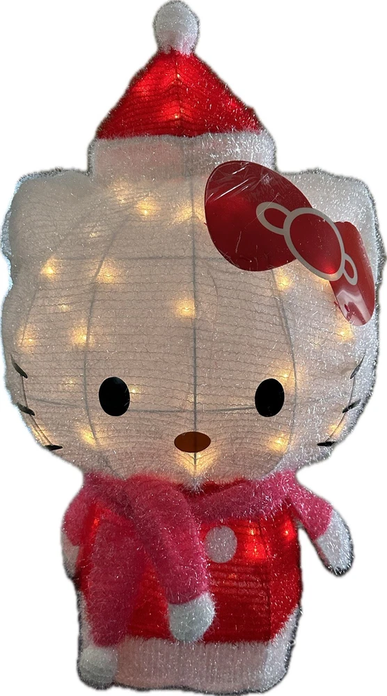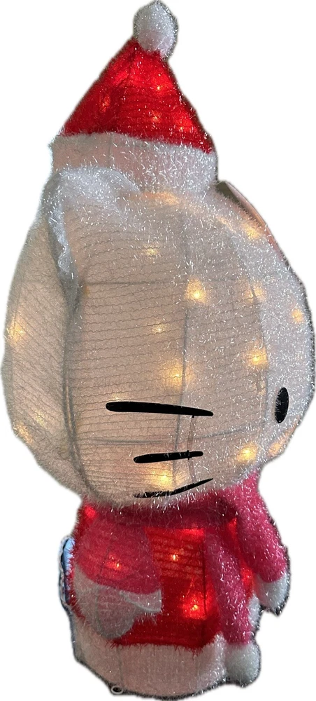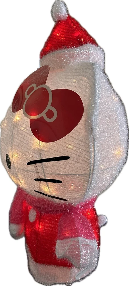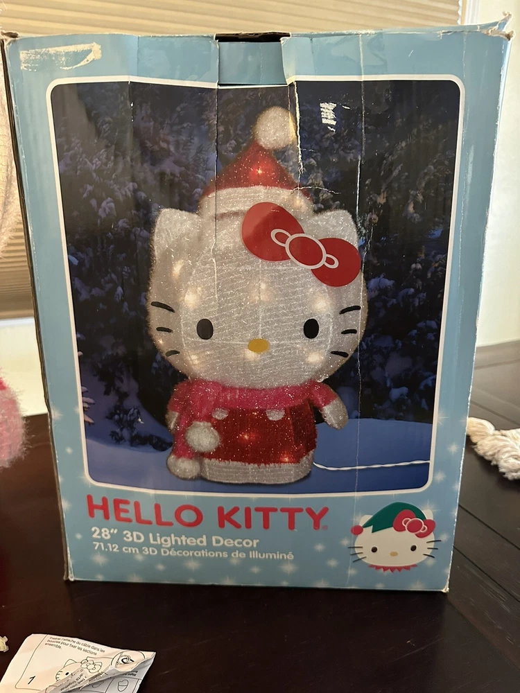 Add a touch of holiday cheer to your home with this rare and jumbo Hello Kitty Christmas 28" 3D lighted electrical figure. The beloved character, brought to you by Kurt Adler in collaboration with Sanrio, is dressed in festive attire and ready to spread some Christmas joy. The figure is made of high-quality materials such as fabric, wire, electrical wire, and plastic, ensuring durability and longevity. This collectible piece is perfect for fans of the Hello Kitty franchise and animation merchandise alike. Despite the box being damaged, the figure is in excellent shape and will make a great addition to any collection. Don't miss your chance to own this special 2012 edition of the Hello Kitty Christmas 28" 3D lighted holiday decor. Has never been used except to put together to take pictures. Included is the original zip ties, instructions, and ground stakes if needed. The clear plastic is still on the tin bow (see closeup picture) It was stored in the original box (box has lots of storage damage). Extremely hard to find!!