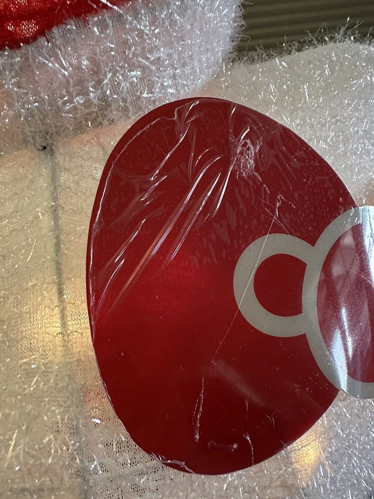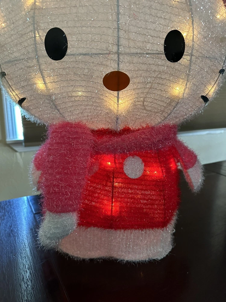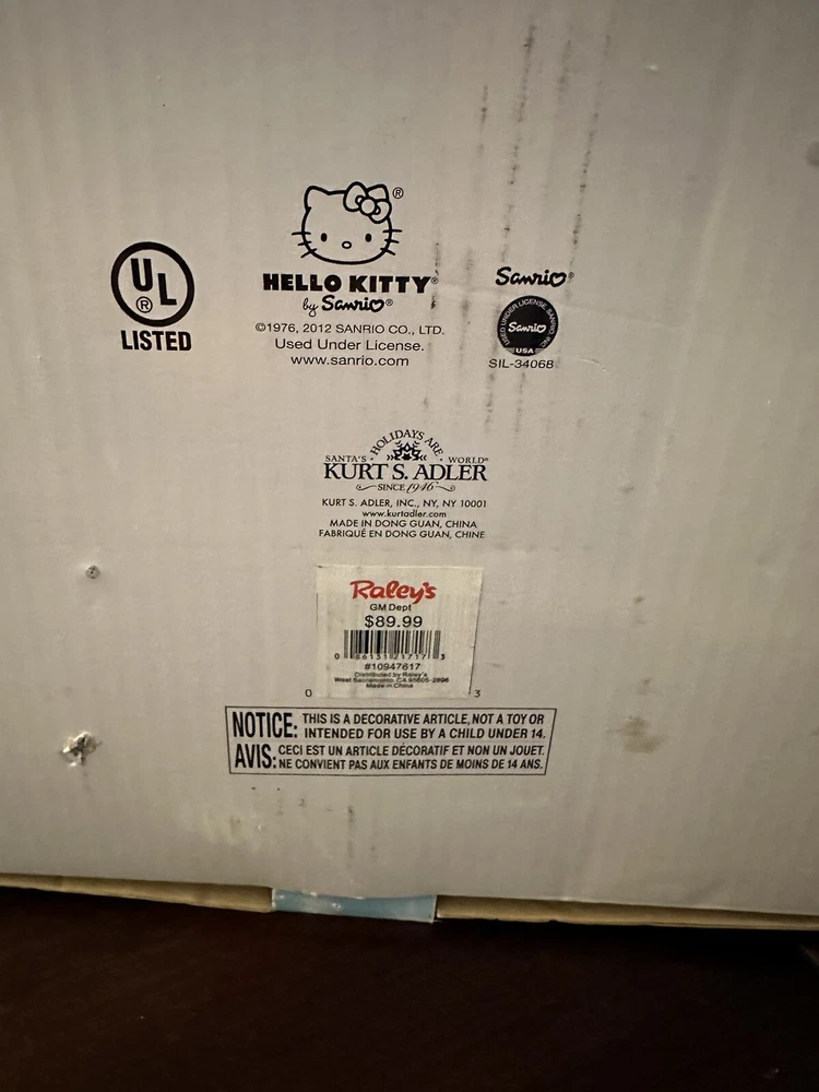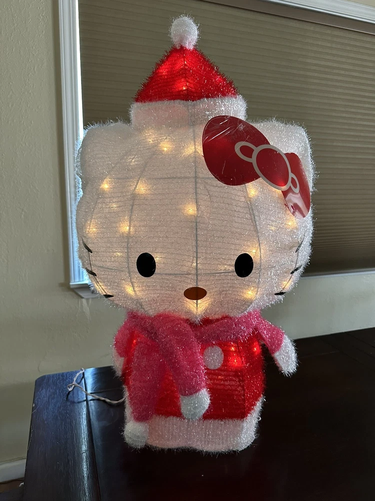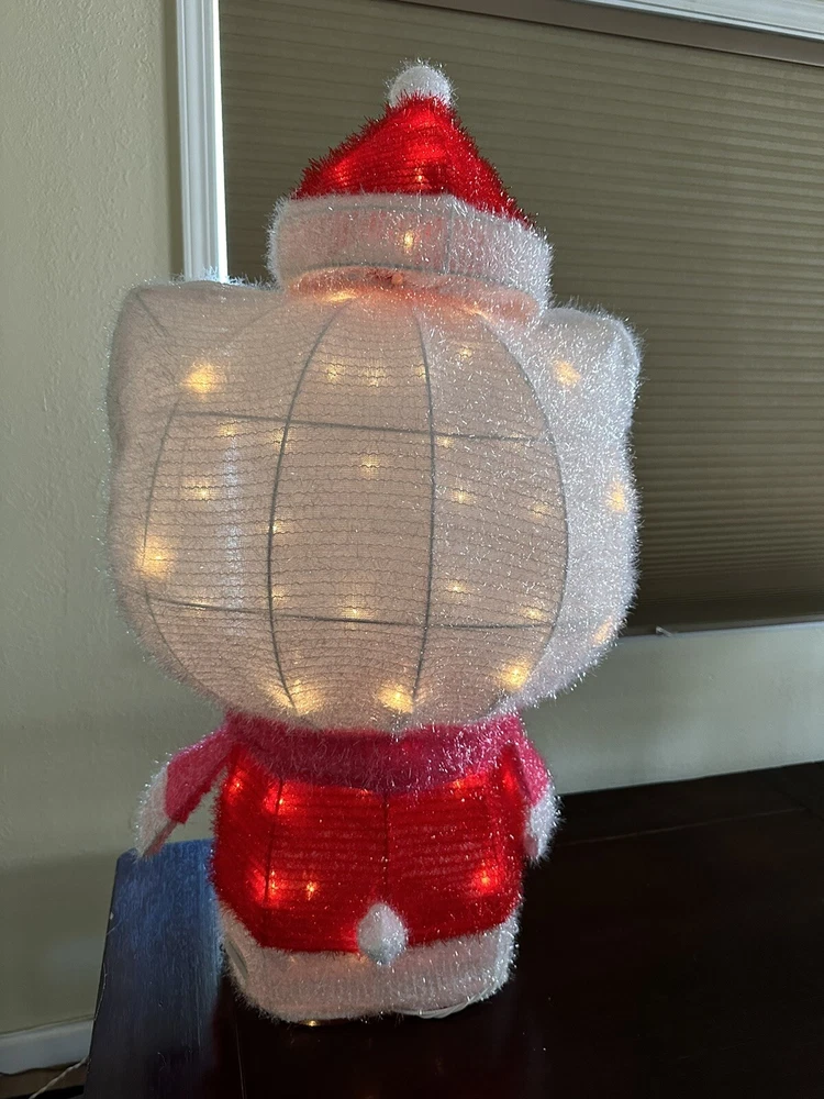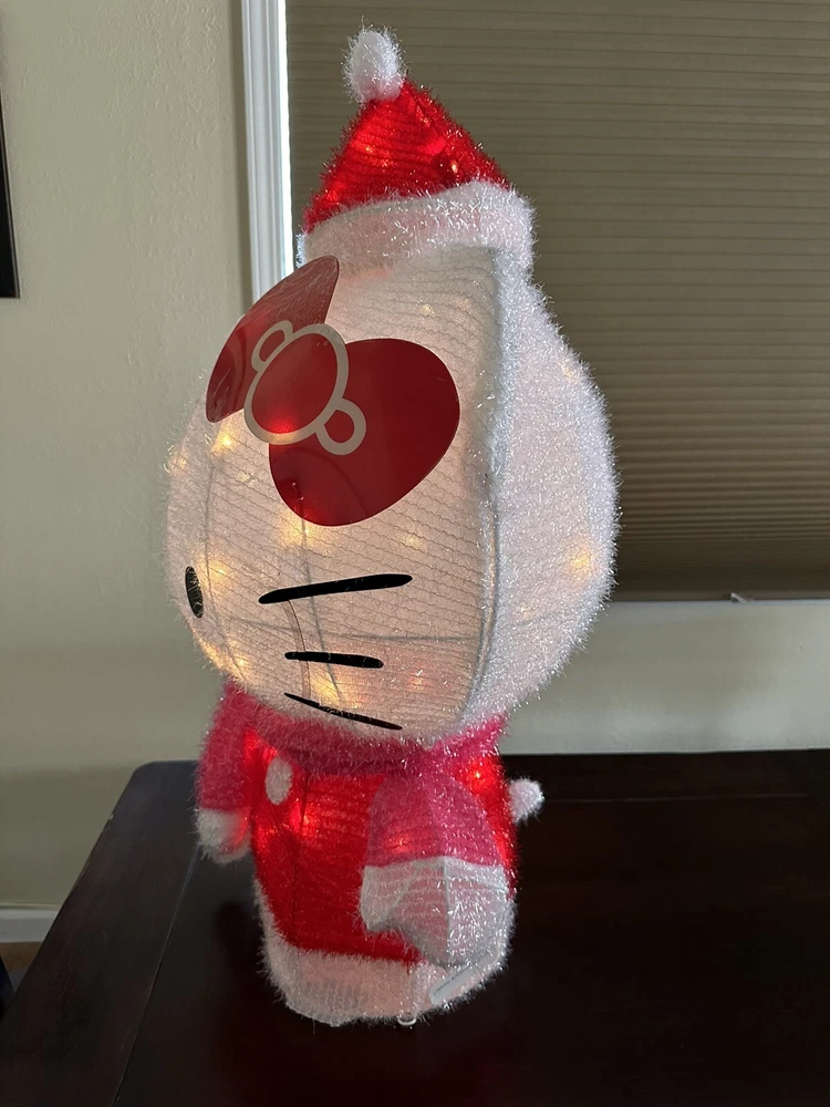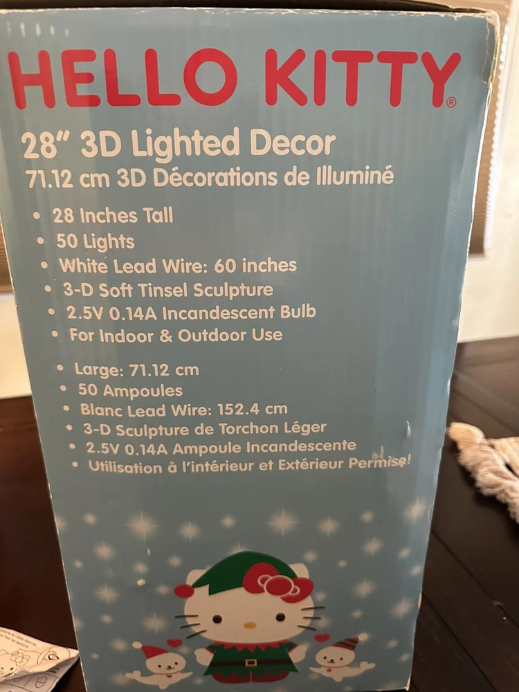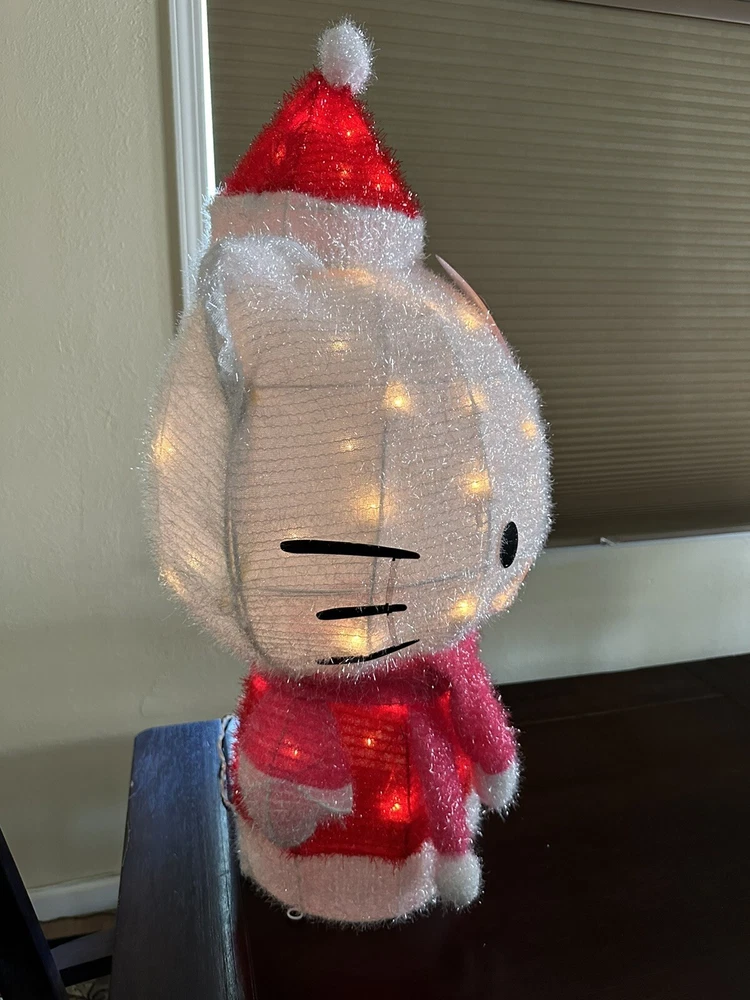 Add a touch of holiday cheer to your home with this rare and jumbo Hello Kitty Christmas 28" 3D lighted electrical figure. The beloved character, brought to you by Kurt Adler in collaboration with Sanrio, is dressed in festive attire and ready to spread some Christmas joy. The figure is made of high-quality materials such as fabric, wire, electrical wire, and plastic, ensuring durability and longevity. This collectible piece is perfect for fans of the Hello Kitty franchise and animation merchandise alike. Despite the box being damaged, the figure is in excellent shape and will make a great addition to any collection. Don't miss your chance to own this special 2012 edition of the Hello Kitty Christmas 28" 3D lighted holiday decor. Has never been used except to put together to take pictures. Included is the original zip ties, instructions, and ground stakes if needed. The clear plastic is still on the tin bow (see closeup picture) It was stored in the original box (box has lots of storage damage). Extremely hard to find!!