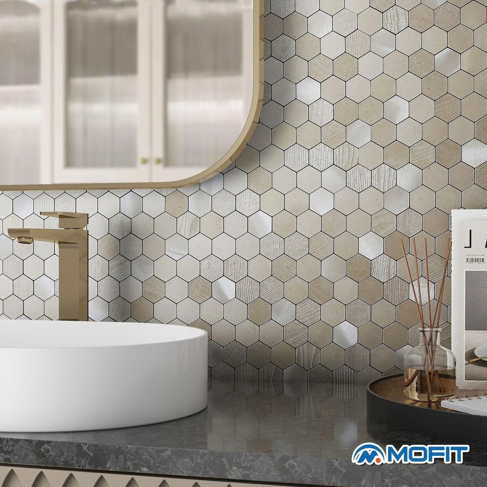 backsplash for kitchen wall honeycomb, honeycomb peel and stick backsplash, back splash stick on tiles for kitchen, self adhesive backsplash for kitchen, marble peel and stick backsplash Quality Hexagon Peel and Stick Backsplash:This peel and stick tile is great quality. It looks like a real stone tile and feels elegant in hand. The product is well made from aluminum composed material and mixed with brushed metal chips, matches your home appliances Thick and heavyweight than common ceramic tiles: Looks expensive tile job, beauiful texture and pattern. With mini gaps between chips, the sheets fits perfectly with each other. This wood-look tile is resistant to fading, water-proof, heat-resistant, great product material Strong Peel and Stick Backing:The stick on adhesive is very strong. Need to plan ahead for installation as it's peel and stick type. Once it sticks to the wall, not easy to readjust positions or take down. Applicable surfaces: flat painted wall, drywall, ceramic/glass/marble/tile, metal/plastic/acrylic surface, sealed/polished/painted wood Easy to apply:These are individual hexagon mosaic tiles making it easy to place them. Just peel and stick! No mess, No grout, Save cost and time! It is a quick resolution for your DIY project Easy to Cut:The stick-on backsplash tiles cut easily, scoring it with a box cutter and then bending/snapping it - once bent, cutting through the backing with heavy duty scissors worked great. A hand saw will make the cuts cleaner as these are made of a metal composed material