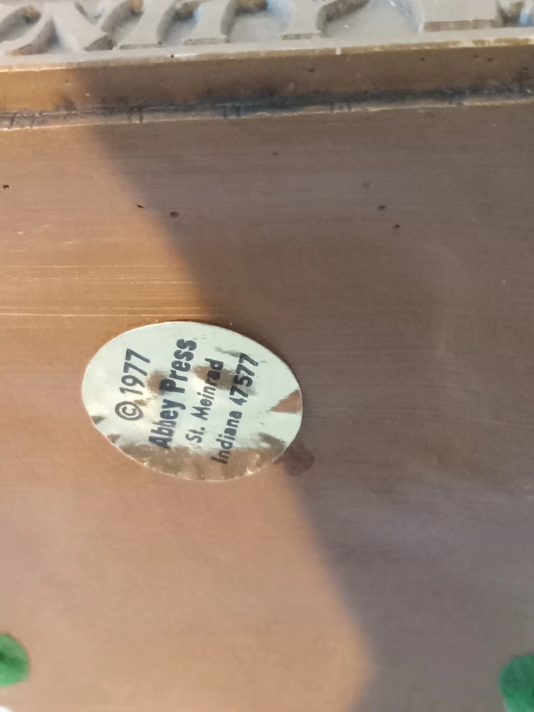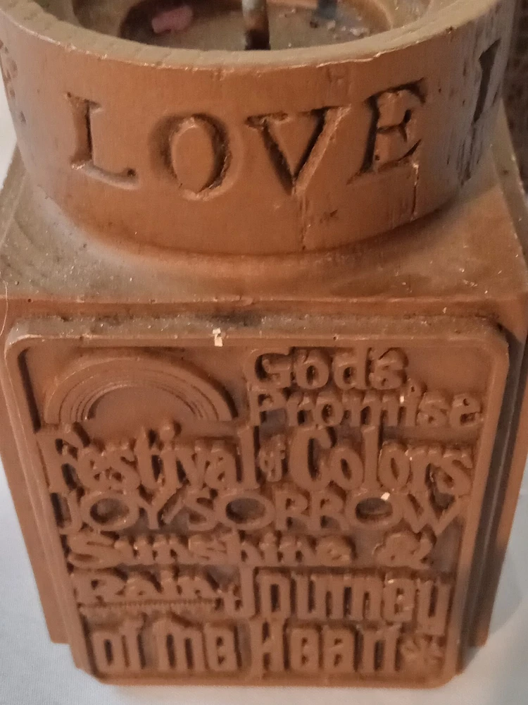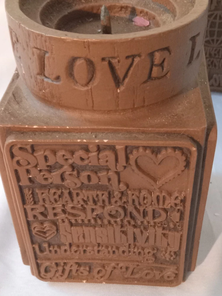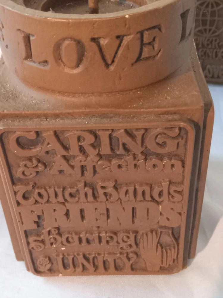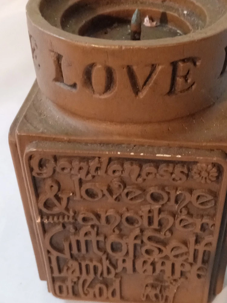 1977 Love Abbey Press Spiritual line of candle holders. Square shaped carved inspirational woods and sayings. Faux wood finish.
