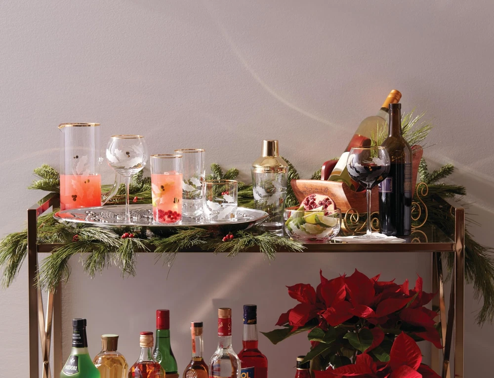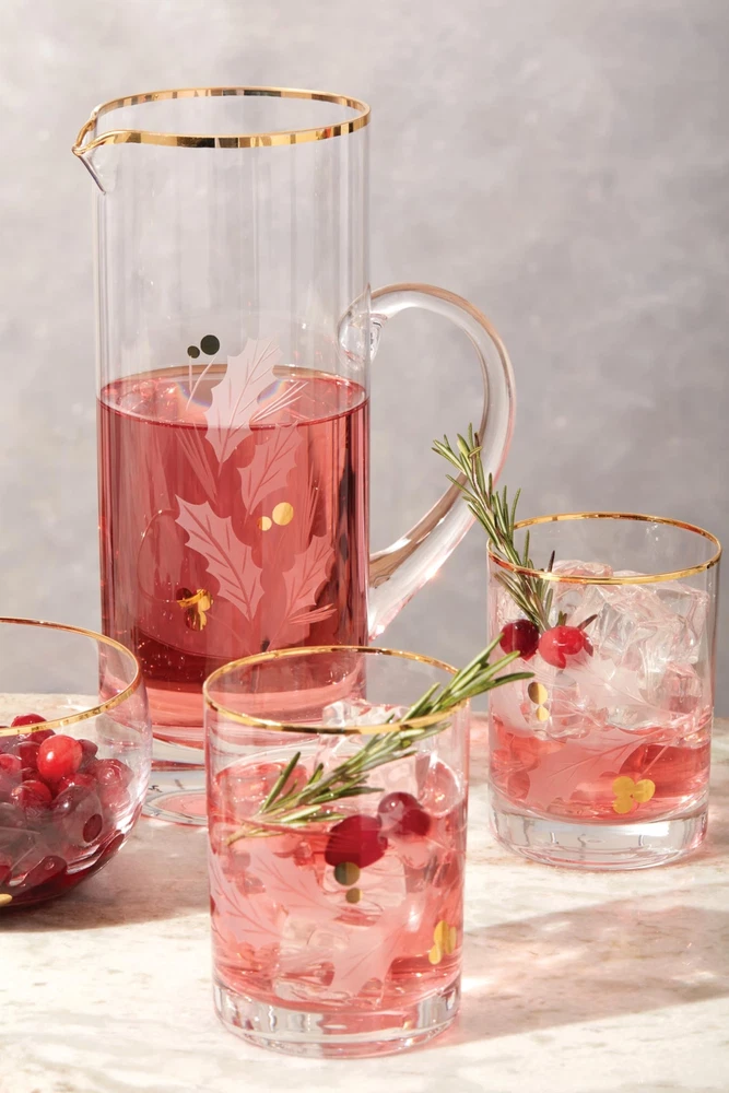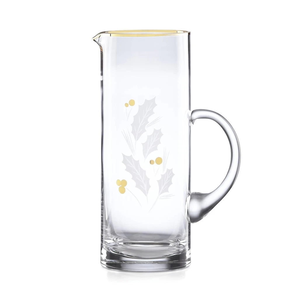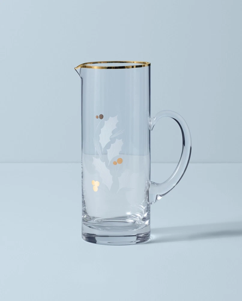 Etched holly leaves with golden berries form an elegant holiday pattern on this glass pitcher. A delicate gold finish creates a polished design around the rim. What's Included: beverage pitcher Breakage Program Capacity: 48 Ounce Height: 10 inch Material: Glass.Imported