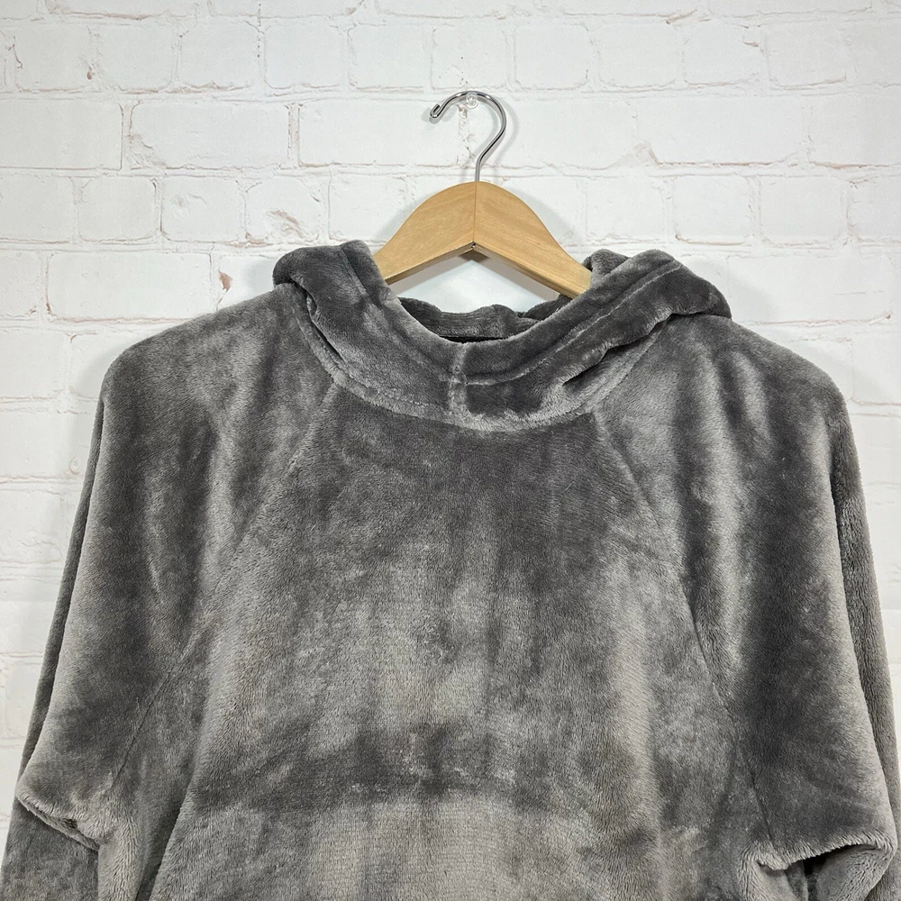 Hollister Hoodie Womens Size Small Gray Faux Fur Cropped Sweatshirt Sweater See measurements for accurate fit Pit to pit 20 inches Shoulder to hem 21 inches Measurements are done flat lay