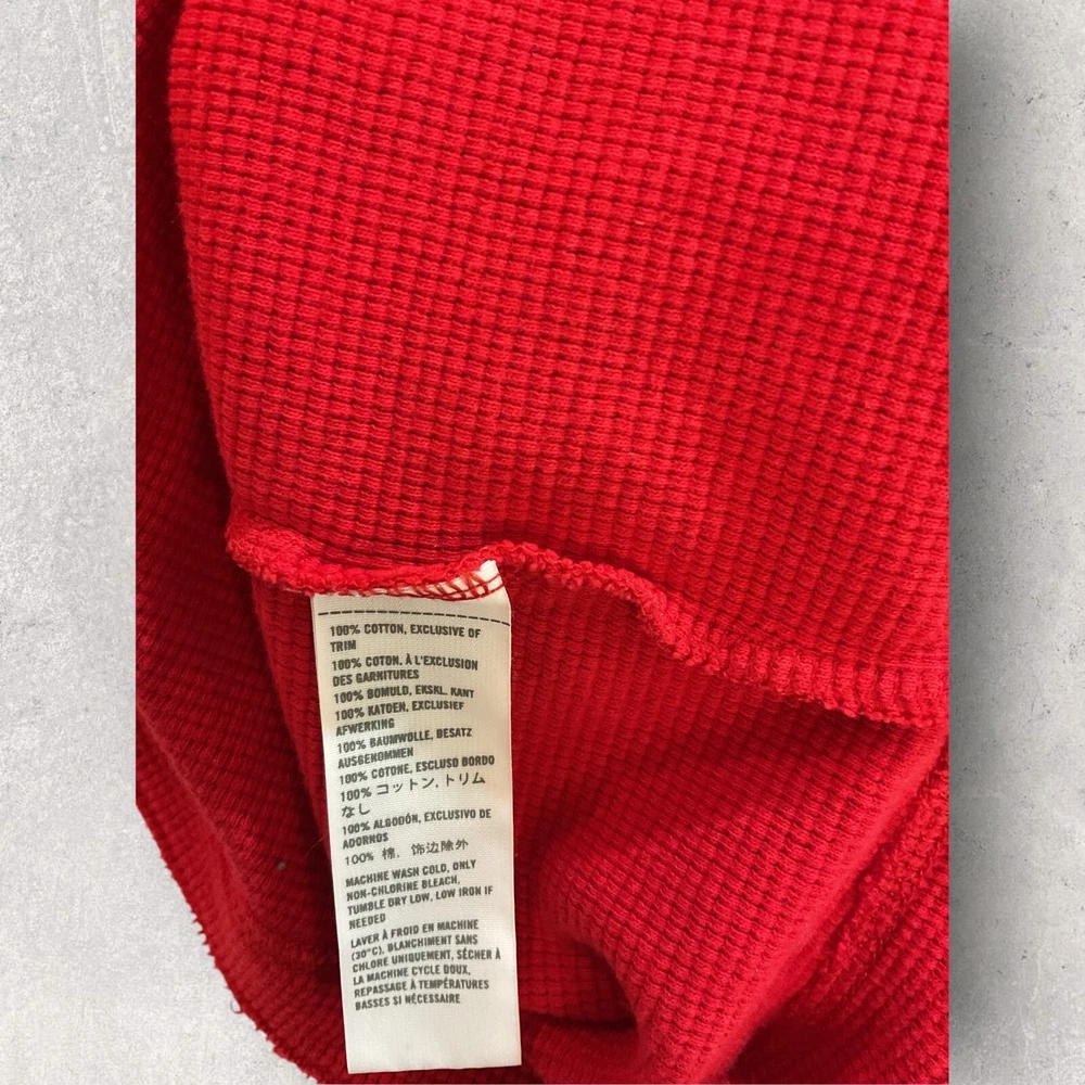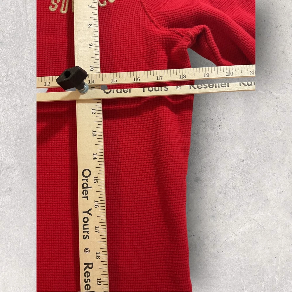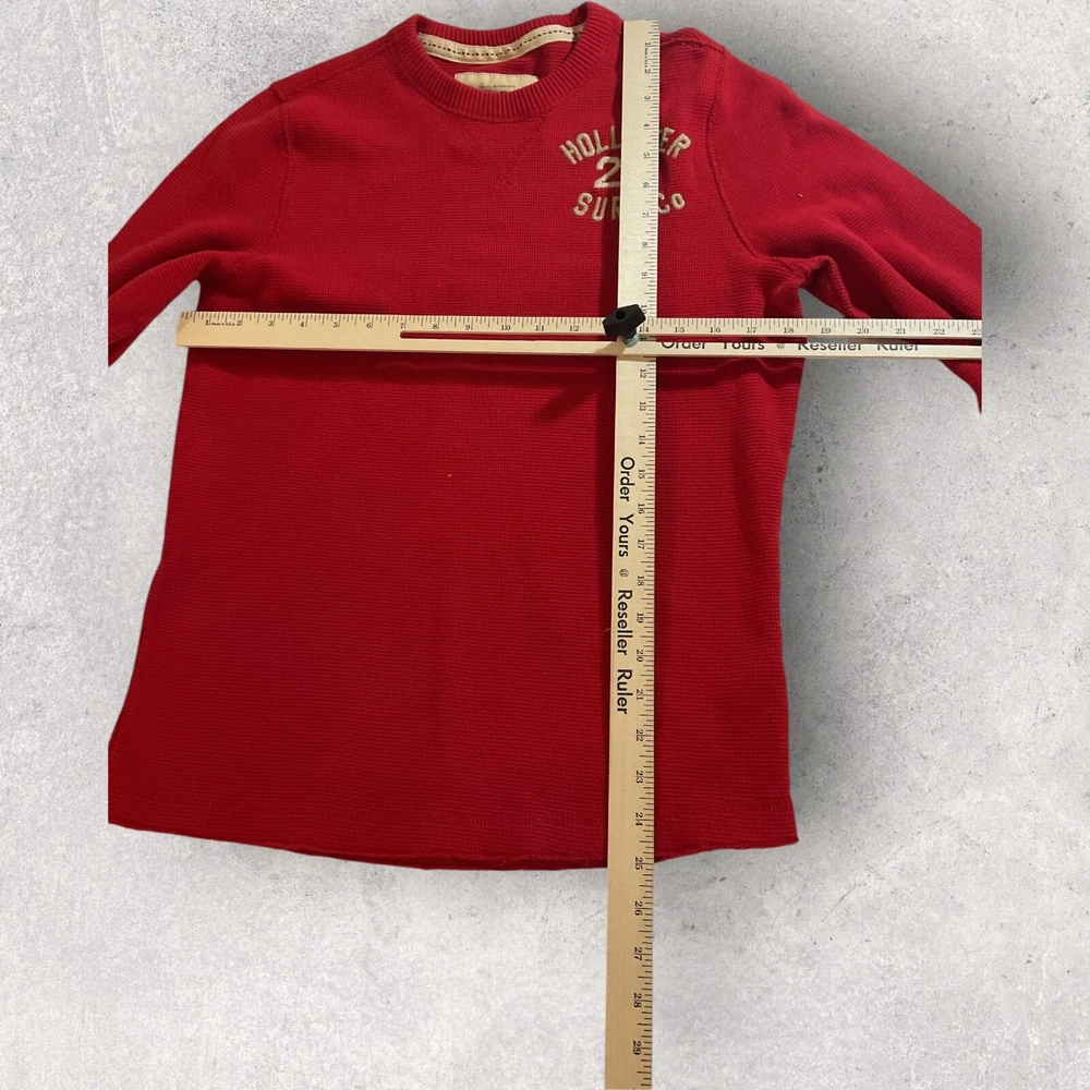 This Hollister sweater is perfect for a casual day out. Made of lightweight cotton material, it features a waffle-knit pattern with a solid design in a vibrant red color. The crew neckline and long sleeves make it suitable for both men and women, while the pullover style adds a touch of convenience. The sweater also includes a Hollister logo accent, adding a touch of branding to your outfit. No flaws. Fits small.