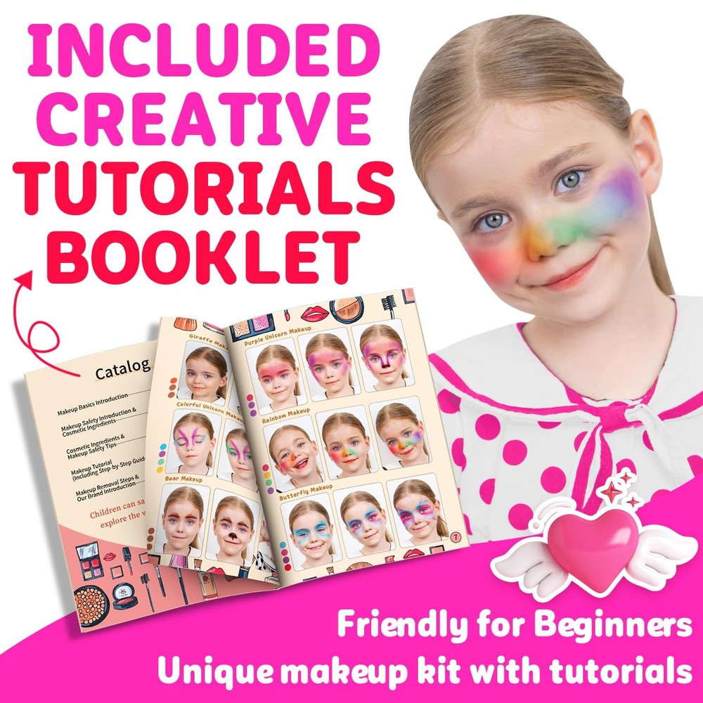 Well Designed Safety Makeup Toys - Best Gifts for 3 4 5 6 7 8 9 10 11 12+ Years Old Little Girls * Has your little girl asked for her first makeup kit? Are you looking for a safe children makeup kit for your child to play with? We have prepared the makeup set box with various colors and tools for you, which contains almost all the parts needed for makeup. * Kid's makeup set that has many options and stores away in a case that is easier to organize than a pouch case, the cosmetic case contains all the little girls need for makeup. It comes with a handle that can easily carry it to anywhere, makeup anytime you need! Kid-friendly & Washable Girls Makeup Kit Our makeup set is made of high-quality, enduring and renewable materials, every part meets the standards of international children’s toys(CPSIA, CPC, ASTM certificates) for safety, and have been tested on the skin before being sold, so children can use it with confidence. There is a slight fragrance when the package is first opened, but it is harmless to humans. It also can works well on delicate baby skin, also easy to use and wash off. Package Included: 8 Eye Shadows & 6 Gloss Shadows 2 Blushes & 1 Blush Wax 6 Lip Glosses 2 Lipsticks with 3 Colors 2 Eyebrows 1 Pressed Powder 9 Makeup Brushes 1 Nail File 1 Cosmetic Case with Mirror Please Note: * All parts for external only. * Please skin test for the first time. If skin sensitive, stop using it. * Do not use on areas with skin wounds. * Please store it in a cool place and stay away from the fire. * All items are strictly forbidden to be swallowed. 【Pretty Kids Makeup Kit for Girl】: Beauty makeup set with almost all needed for makeup and nail painting, including 1 makeup tutorial booklet, 14 eye shadows, 2 eyebrows, 3 blushes, 1 eye shadow wax, 12 lip glosses, 2 lipsticks with 3 colors, 1 pressed powder, 11 makeup brushes, 4 nail polishes, 1 nail file, 1 cosmetic case with mirror and more. Once girls have this makeup kit, they will become the most beautiful princess! 【Material Safety Makeup Toys】: Pretend makeup kit is made of high-quality and renewable material that meet the standards of international children’s toys(CPSIA, CPC, ASTM certificates) for safety, and have been tested on body, there may be a slight harmless fragrance when the makeup box is just opened, but it’s can be used with confidence. Easy to wash off with soap and water, won’t leave stains on skin, clothes or furniture. Friendly for kids to makeup themselves. 【Mess-free & Easy to Store】: This is a compact pink makeup set for girls, all the items come packed in a neat carrying case for easy storage. There are fixed colors in the cosmetic case, children can see all the colors at a glance so that they can choose favourite color, and it's not easy to lose and avoid breaking during carrying. 【Encourage Creativity & Entertainment】: Come with a makeup tutorial booklet. Play makeup can help child improve fine motor skill, with the little girl explore the beautiful endless possibilities meanwhile developing creativity and imagination. Provide family interactive and entertainment time that girl can pretend she’s putting on makeup like mommy and paint nail polish. 【Vanity Set Gifts for Girls】: From dress up, to parties and activities, or just princess time, there is a lot of makeup tools in this makeup box with a handle. Beautifully shaped, rounded and burr-free, it’s great for Birthday, Christmas, Halloween or other holidays makeup toys gifts for kids age 3 4 5 6 7 8 9 10 11 12 and up! They can have their own makeup to meet princess dream!