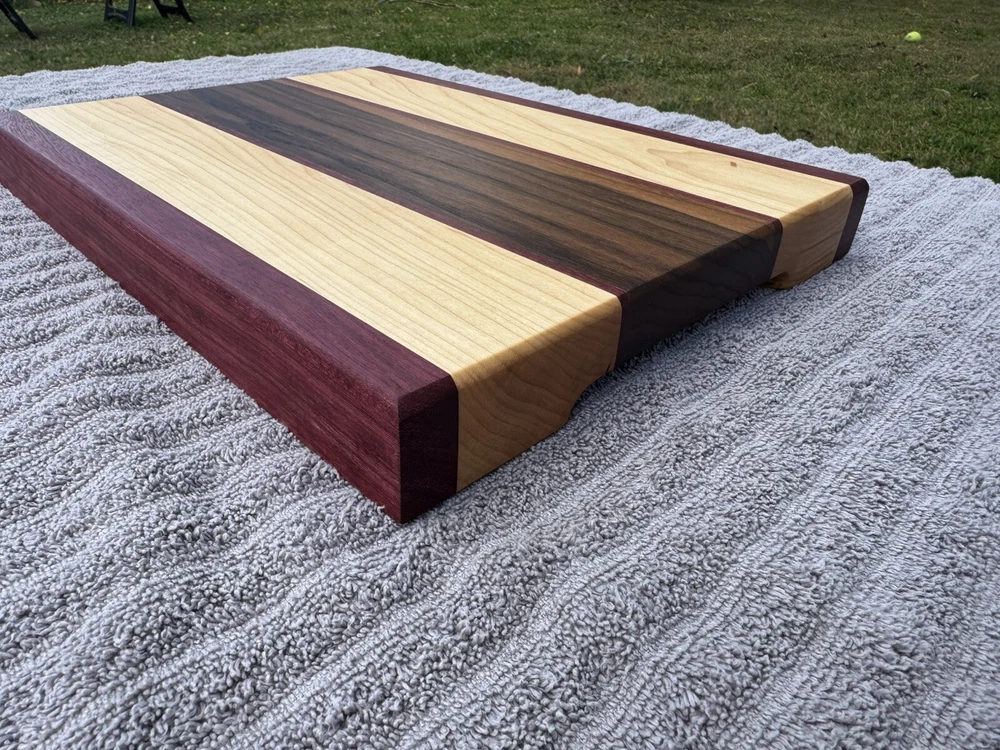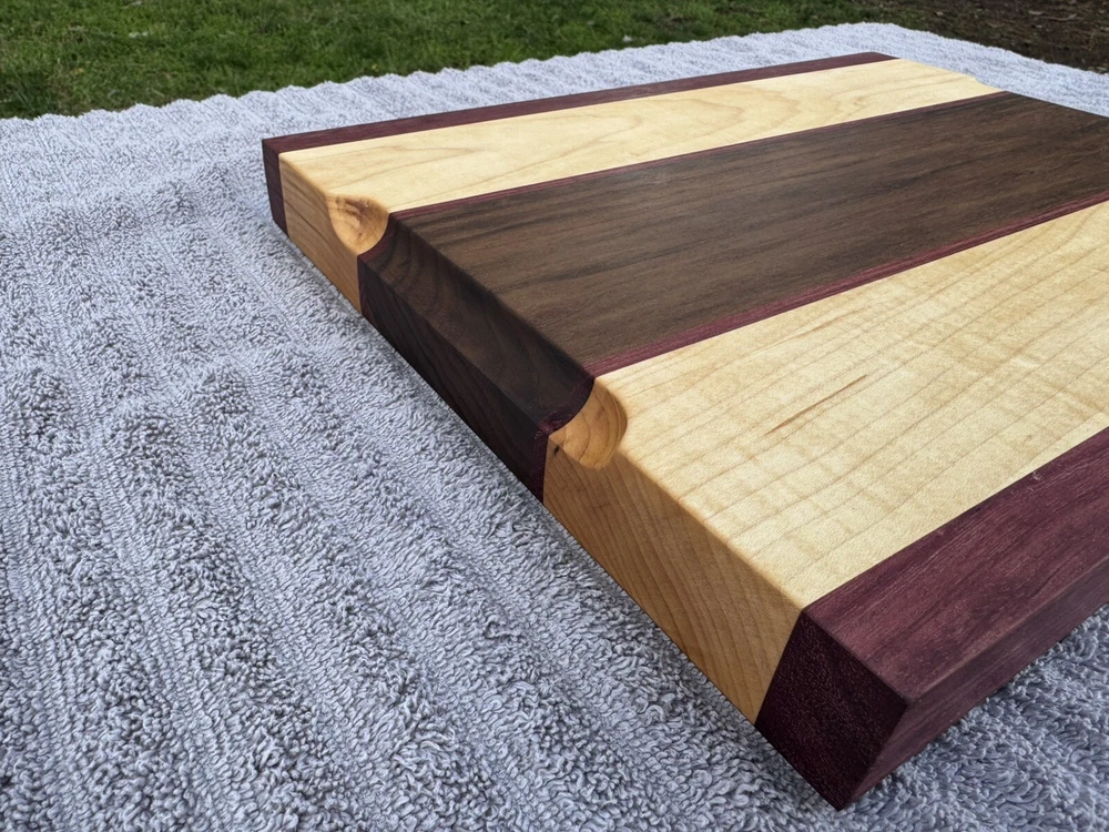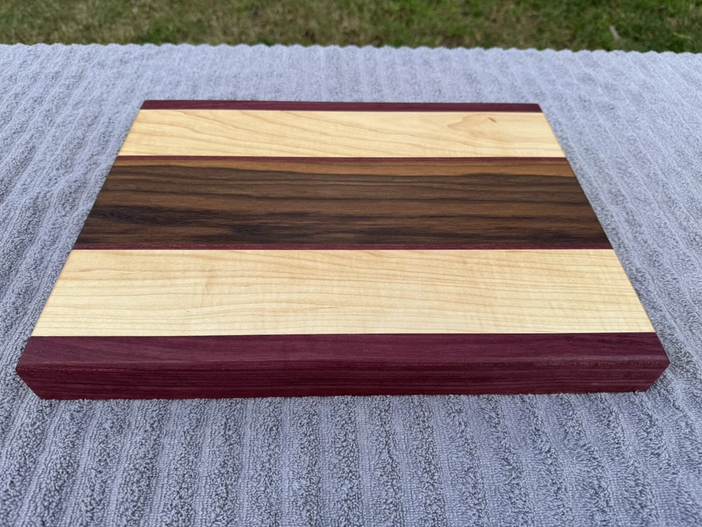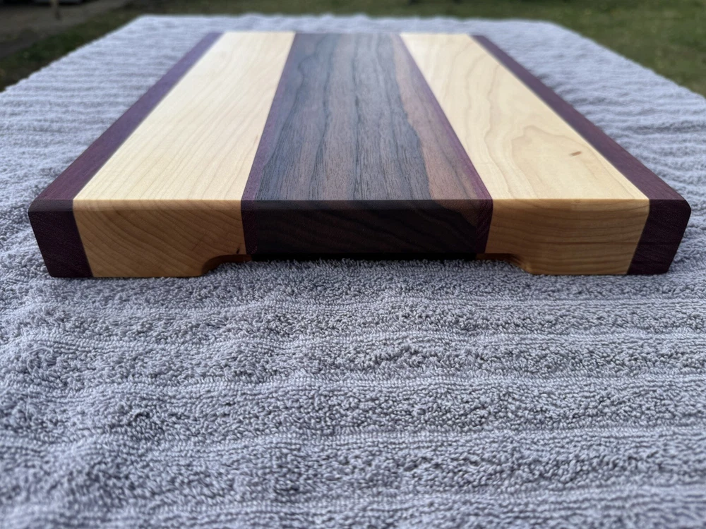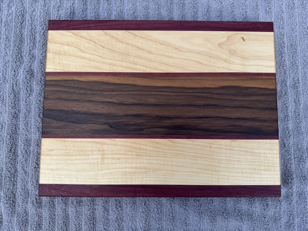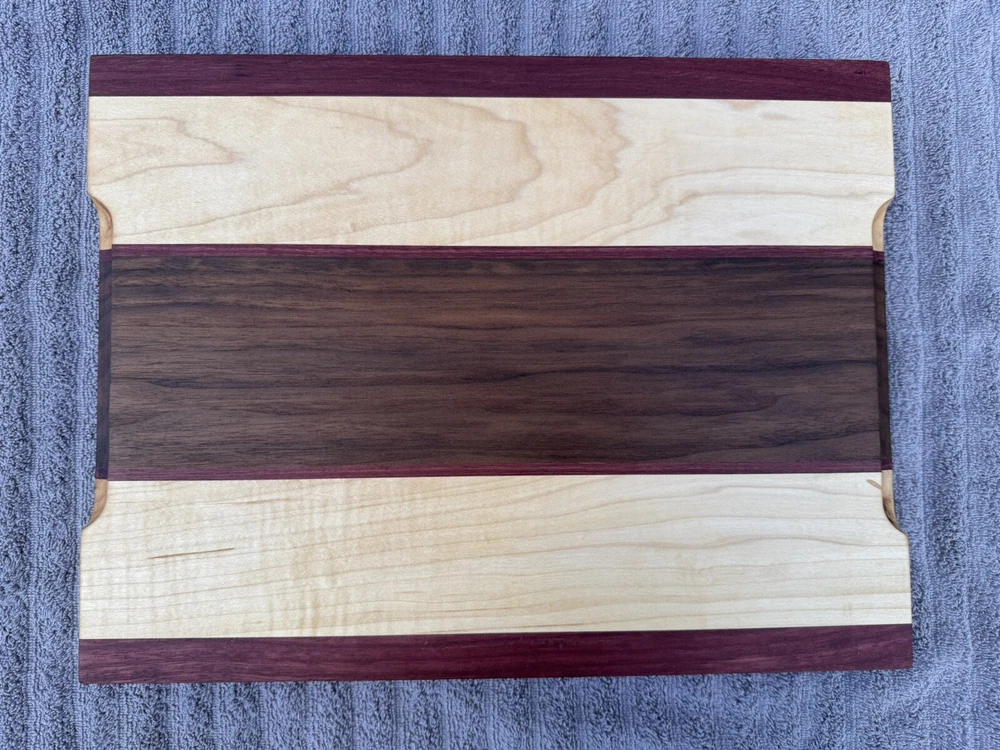 This handcrafted cutting board combines the rich, contrasting tones of black walnut, maple, and purpleheart wood for a striking and functional kitchen piece. -SIZE- L 15.5in W 11.75in H 1.5in All oil and wax used on the cutting boards are food safe and natural. -OIL USED- Bumblechutes woodworkers oil was used. -INGREDIENTS- Coconut Oil, Vitamin E Oil, Mineral Oil, and Lemon Oil. -CONTAINS- Tree Nuts (100% Pure, Fractionated Coconut Oil) -SHOP WAX- Bumblechutes shop wax was used on these cutting boards. -INGREDIENTS- Mineral Oil, Beeswax, Carnuba Wax, Vitamin E Oil, Lemon Oil.