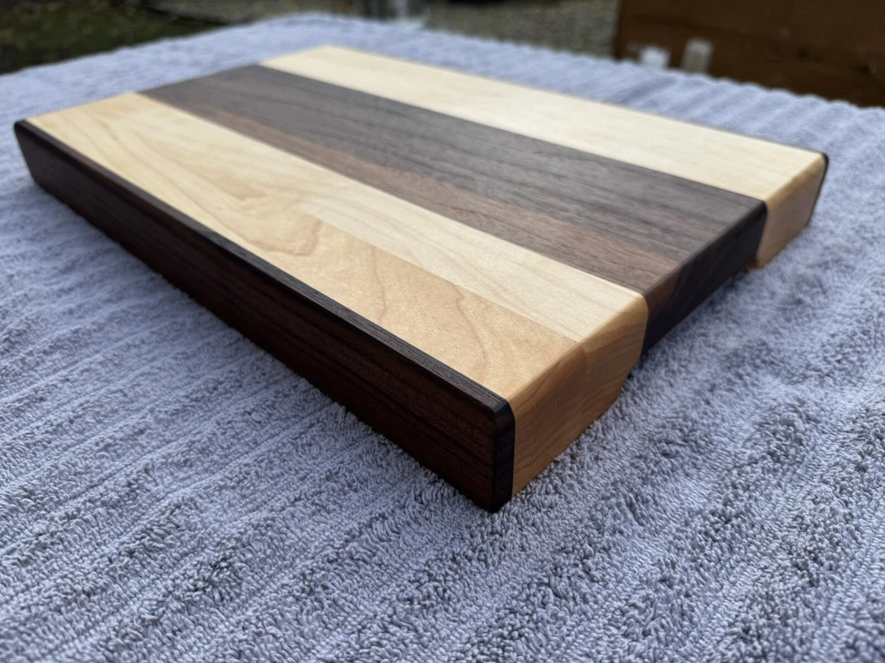 This cutting board showcases the natural beauty of two stunning hardwoods: rich, golden maple and dark, earthy black walnut. The smooth, polished surface reveals the intricate grain patterns of both woods, with the lighter tones of the maple contrasting beautifully against the deep walnut look. The seamless blend of these woods creates a striking visual appeal, while the board’s solid construction promises durability for years of use. Ideal for both food prep and as an elegant serving platter. -SIZE- L 15.5in W 10in H 1.5in All oil and wax used on the cutting boards are food safe and natural. -OIL USED- Bumblechutes woodworkers oil was used. -INGREDIENTS- Coconut Oil, Vitamin E Oil, Mineral Oil, and Lemon Oil. -CONTAINS- Tree Nuts (100% Pure, Fractionated Coconut Oil) -SHOP WAX- Bumblechutes shop wax was used on these cutting boards. -INGREDIENTS- Mineral Oil, Beeswax, Carnuba Wax, Vitamin E Oil, Lemon Oil.