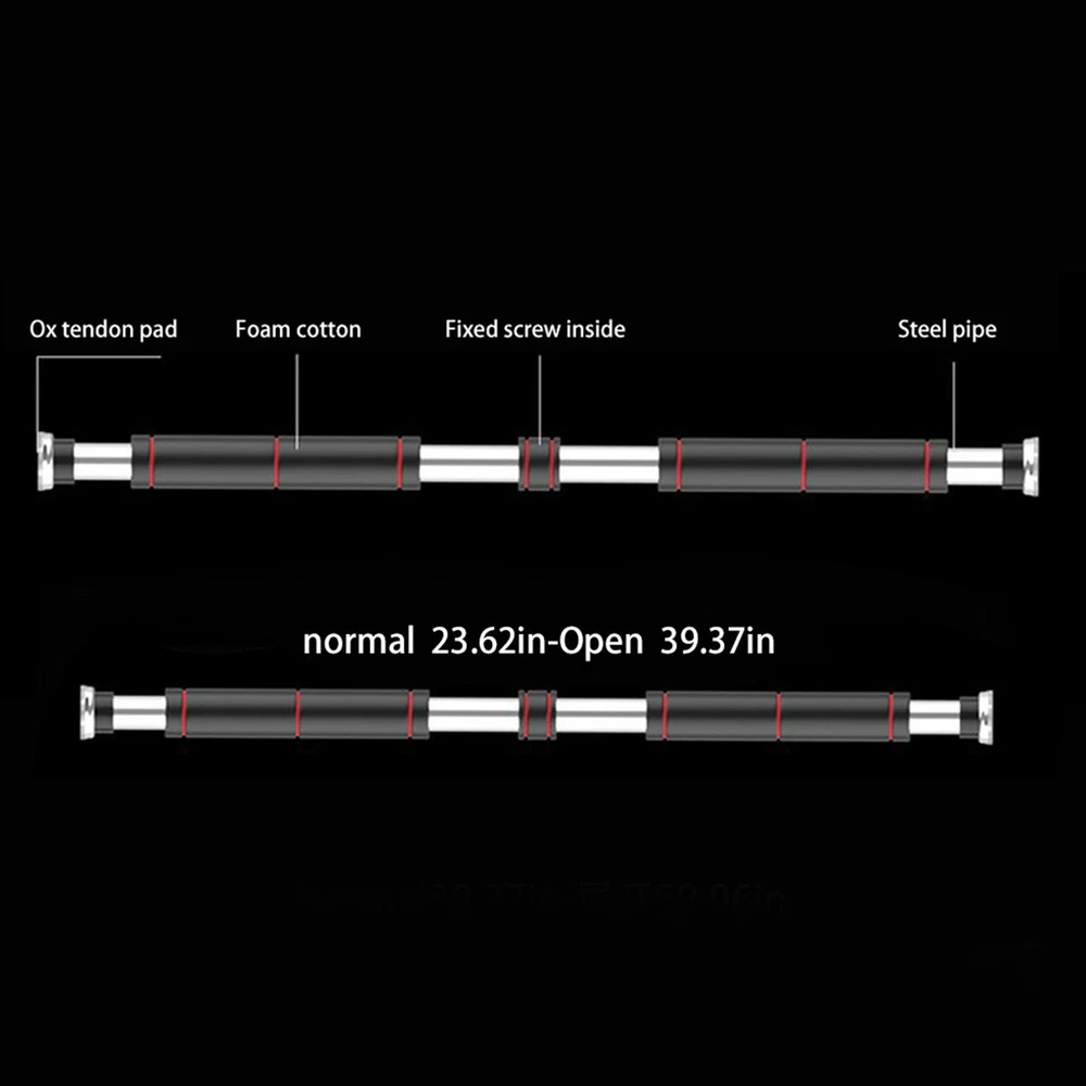 Description: Material:Steel pipe + foam Product color: black + red Product load: 440lbs (200KG) Product size: 60~100cm (23.6~39.3in) Features: Good structural components are metal riveting process, no need to be fixed by nuts, no falling off, and safer to use. Product features: Pull-ups, sit-ups, squats, sit-ups, triceps sag, leg lifts, etc. New design lever : This new pull-up lever will protect the door frame from scratches. The non-slip mat is made of rubber to ensure safety, reliability, and non-toxicity. The good structural components are metal riveting technology, which does not need to be fixed by nuts, will not fall off, and is safer to use. Multi-function use : This lever is suitable for pull-ups, sit-ups, squats, sit-ups, triceps stretching, leg lifts, etc. Reduce clutter, save space and stay healthy. Steel construction and non-slip rubber feet ensure stability and safety during pull-up. Comfortable handle : The foam handle of the drawbar is very comfortable, the sweat-absorbing outer layer, the tear-resistant lining and the anti-slip layer on the inner wall, and the non-slip handle provides extra comfort of the tension bar to minimize hand fatigue. Easy to install and no drilling : Our door frame pull rods are easy to install and the steel tube to stretch and contract (no drilling required). You don't even need a screwdriver! The package includes: 1 x Horizontal Bar