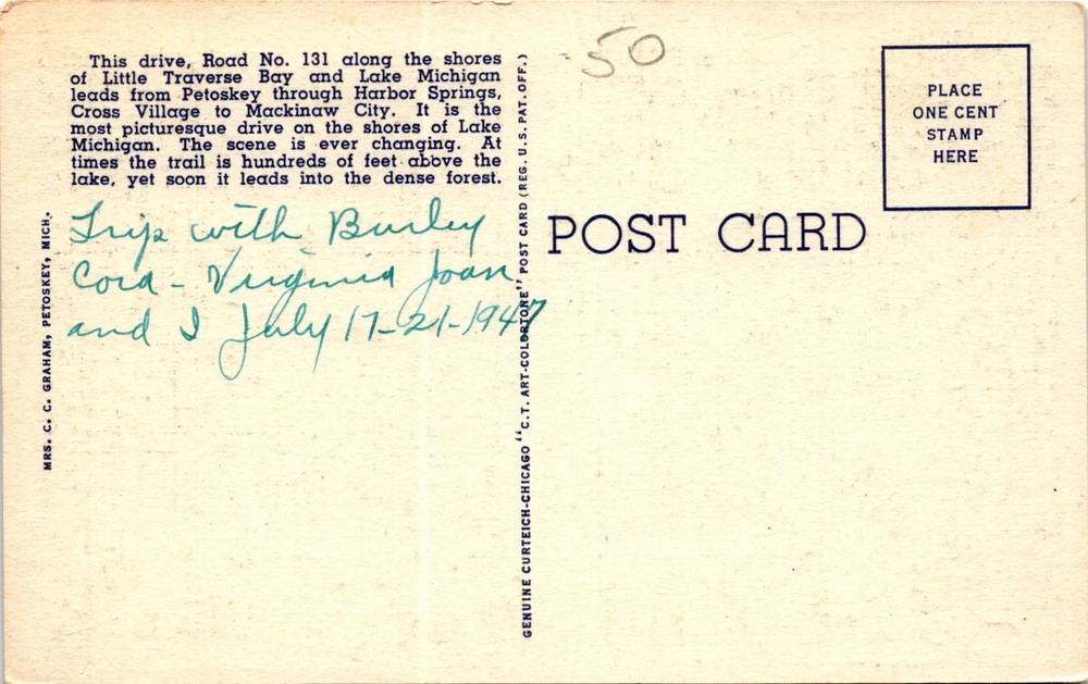 MAKE AN OFFER. THE MORE YOU BUY THE BETTER DEAL I WILL ACCEPT The postcard depicts Horseshoe Bend on Lake Shore Drive in Northern Michigan, specifically along Road No. 131 which runs along the shores of Little Traverse Bay and Lake Michigan. This scenic drive stretches from Petoskey through Harbor Springs, Cross Village, to Mackinaw City.