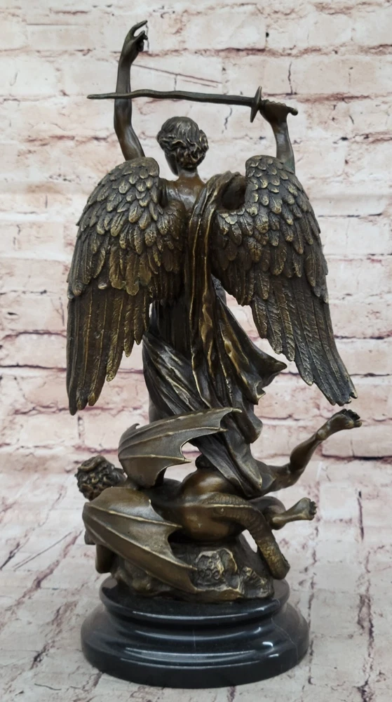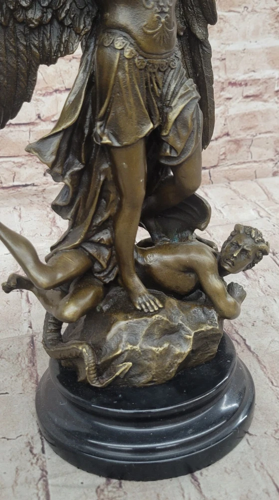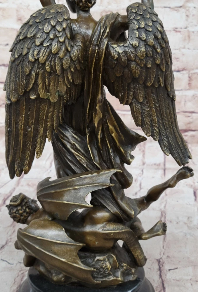 Hot Cast Archangel St Saint Michael w/ Shield Sword Color Bronze Figurine Gift Hot Cast Archangel St Saint Michael w/ Shield Sword Color Bronze Figurine Gift Condition : This sculpture is in perfect condition Bronze Dimensions with Marble Base: Height 15.5" X Width 8" Marble Dimensions: Diameter 6" Height without base:14" Weight:14 LBS Inventory:68Y4628286 Mythical Majesty in Bronze: St. Michael Slaying the Dragon This striking bronze sculpture vividly depicts a mythical figure with a dragon's tail, large wings, and a sword, standing tall with one finger raised in the air. The larger figure, exuding an imposing presence, towers over a smaller winged man who appears both frightened and awestruck, seemingly being stepped over by the dominant figure. The interpretation of this dramatic scene is left to the viewer's imagination – does this figure represent good or evil? The powerful stance and fierce appearance certainly suggest a commanding and formidable presence. Craftsmanship and Symbolism Crafted from 100% solid bronze, this sculpture captures the essence of mythological storytelling and artistic mastery. The intricate details of the figures, from the texture of the wings to the tension in their poses, highlight the artist's skill and attention to detail. The larger figure's dominating posture over the smaller winged man evokes a sense of power and conflict, inviting viewers to ponder the underlying narrative. A Statement Piece for Any Space Mounted on a black marble base, the sculpture gains a sense of weight and importance, enhancing its overall impact. Whether you are an art collector, a mythology enthusiast, or simply someone who appreciates the beauty and craftsmanship of bronze sculptures, this piece is sure to impress. It stands as a stunning work of art that adds character and depth to any space it occupies, making it a focal point and conversation starter. Signed Carpeaux Good Vs Evil Angel Striking Devil Bronze Marble Sculpture Statue www.bronzhaus.com Video will open in a new window Using the eBay App? Paste link into a browser window: [isdntekvideo] Shipping Terms : Most of our items are shipped via USPS (United States Postal Service) mail or UPS. Most orders are shipped within 24-48 hours of purchase. Please be aware that not all items are available for USPS shipping due to size and weight. We do ship to Hawaii, Alaska, Canada, Puerto Rico, APO/AE, and U.S. Virgin Islands, however, an additional charge may be required. Please contact us before making any purchases in these areas. For Non-USA customers, you may be responsible for all duty, tax, brokerage fees that may be due upon delivery (shipping costs cover freight charges only). We also ship internationally. Please refer to the "Shipping and Handling" chart for the rates for each area. Payment : We accept just about any form of payment. PayPal, Master Card, Visa or American Express credit cards. Money orders, cashiers checks, and even personal or business checks. For governmental institutions, we will also accept a purchase order. Please understand that for personal or business checks we have to wait for the check to clear (usually 7 days) before shipping. Condition : New Detailed Hand Crafted Hot Cast Bronze Satisfaction Guaranteed. This is Stock Photo, Slight Color Variation!! Listing and template services provided by inkFrog