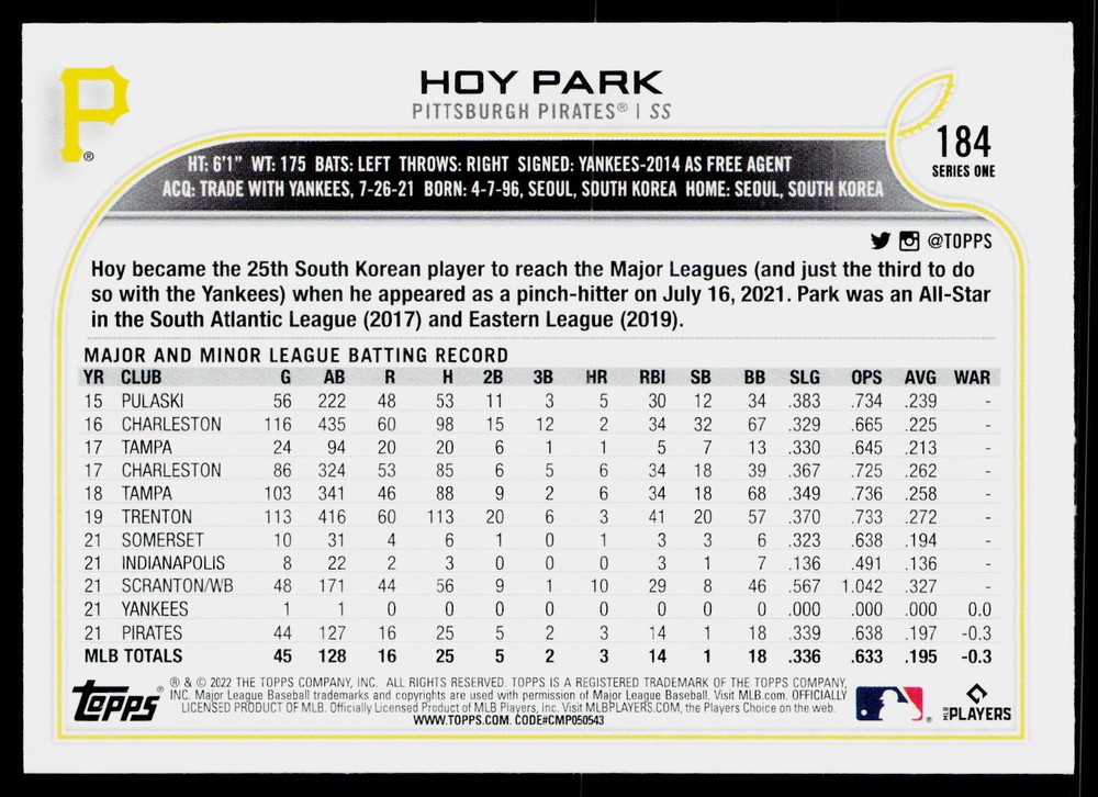 You will receive a , Hoy Park 2022 Topps #184 Pittsburgh Pirates Near Mint or Better condition. Please note i am not a professional card grader the condition of raw cards can be very subjective. Please refer to the high quality pictures to determine condition yourself any questions at all please feel free to ask!! we take pride in the quality of cards we sell and ship, all cards will be shipped in a penny sleeve and top loader for added protection. be sure to save us as a seller, as we are growing and listing daily THANK YOU FOR YOUR BUSINESS