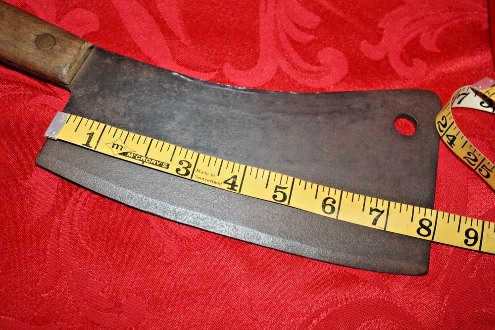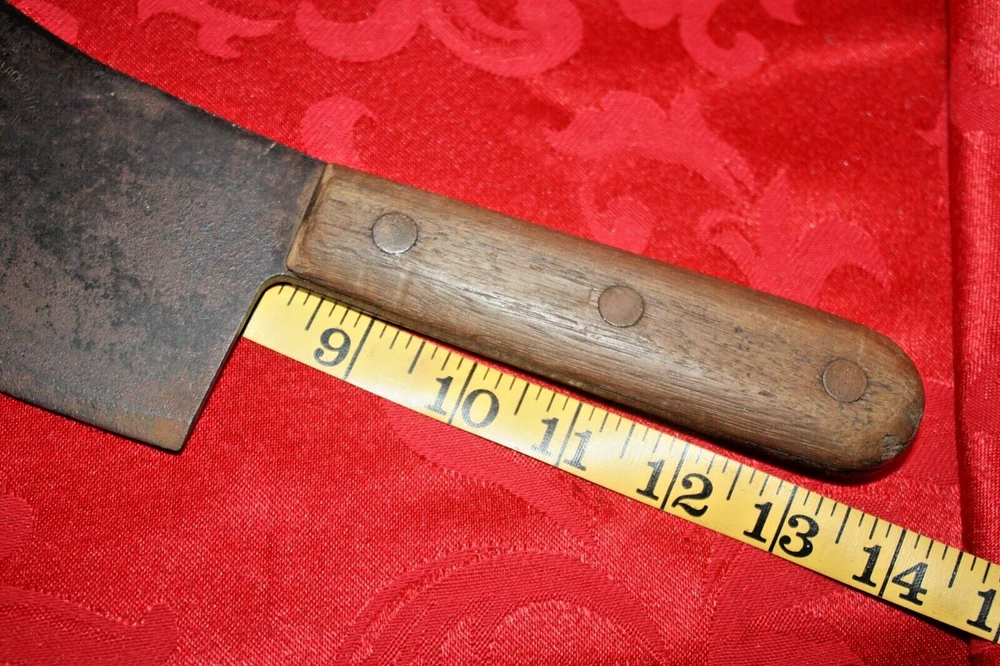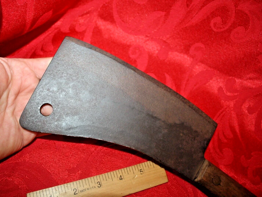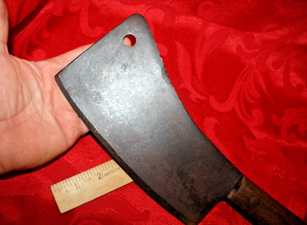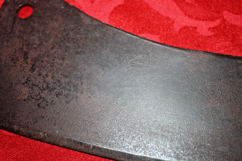 Nice old big heavy meat cleaver that is marked in center of blade VILLAGE BLACKSMITH WATERTOWN WIS in all capital letters. Its hard to read because the surface is a little rough and probably needs restoration to see clearly. No big issues. Handle is in good shape too. It measures a bit under 14" overall and the blade is apx 8" in length. See all pictures and my other listings. The last photo shows a couple of tiny dings along the very top edge. No big deal but they will be there when it arrives at your house should you buy it now for 65$ with 6$ well packaged shipping. Thank you and Good Luck! Rick