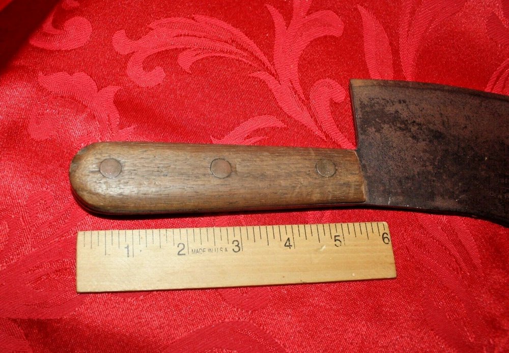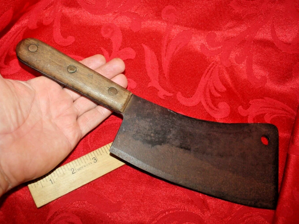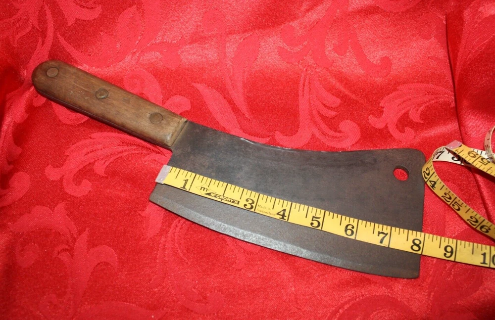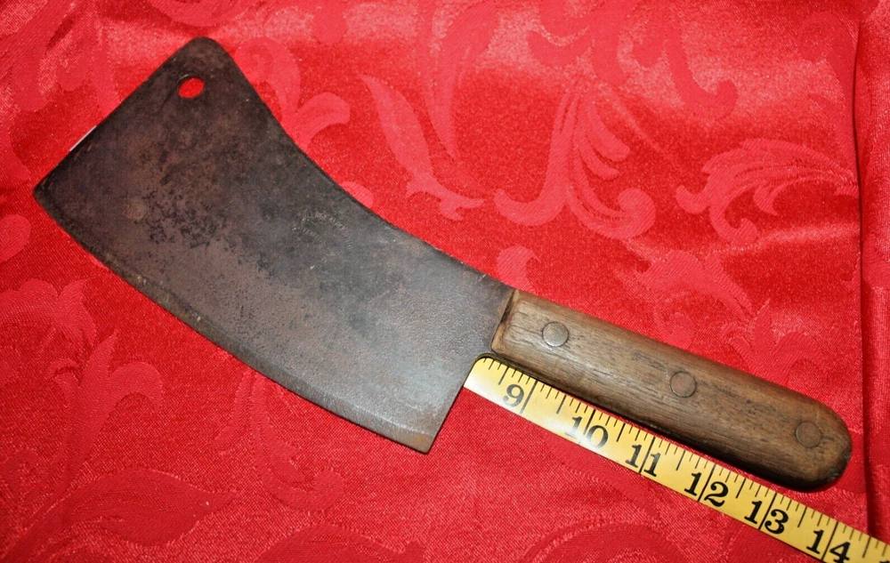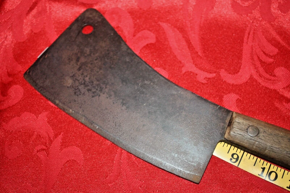Nice old big heavy meat cleaver that is marked in center of blade VILLAGE BLACKSMITH WATERTOWN WIS in all capital letters. Its hard to read because the surface is a little rough and probably needs restoration to see clearly. No big issues. Handle is in good shape too. It measures a bit under 14" overall and the blade is apx 8" in length. See all pictures and my other listings. The last photo shows a couple of tiny dings along the very top edge. No big deal but they will be there when it arrives at your house should you buy it now for 65$ with 6$ well packaged shipping. Thank you and Good Luck! Rick