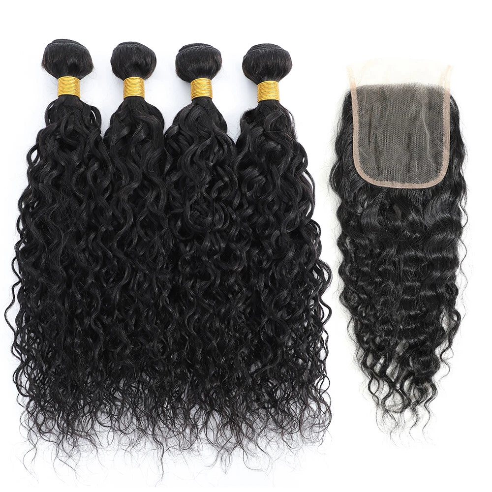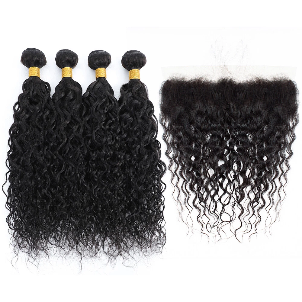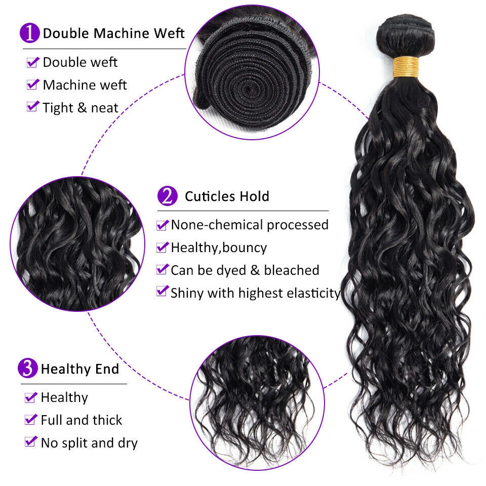 Human Hair Bundles with Lace Closure Water Wave Bundles with Lace Frontal Hair Hair Material: 100% Brazilian Virgin Human Hair Hair Grade: 10A Hair Color: Natural Black, Can be dyed at any color you like Hair Bundles Length: 12" 14" 16" 18" 20" 22" 24" 26" 28"inches Hair Bundles Weight: 100g per bundle, 100g=1Bundle 3 00g=3Bundles Hair 4*4 Closure Length: 12" 14" 16" 18" 20" inches Hair 4*4 Closure Weight: 45-55g/piece Hair 13*4 Frontal Length: 12" 14" 16" 18" 20" 22" inches Hair 13*4 Frontal Weight: 50-75g/piece Handling Time: No more than 2 Business Day. Delivery Time: It usually takes 2 -5working days to be delivered by USPS FREE SHIPPING Refund Policy: 30 days no reason to return Hair Feature: 1. 100% Real Human Hair extensions 2. Soft and Thick, Smooth, Full Cuticle 3. Natural Hair, No Shedding, No Tangle, Machine Double Weft Q: Why are my hair extensions getting tangled? A: Your hair extension tangle due to dryness, oil&dirt built-up, salt water, chlorine and not combing(wide tooth comb) out hair daily. Make sure to wash&Condition your hair at least once a week,twice a week is better. Use olive oil to moisten it smoothly or consult your stylist for more help. Q: Can I dye the hair? What should I can pay attention to? A: Treat the hair as if it is your own. Use a flat iron/ straightener or tongs, even when fitted, but as with your own hair, never use hot tools too often as you could dry the hair and it will not last as long. Q: How to tell human hair with synthetic hair? A: human hair has natural protein . It is easy to tell by burning and smell: human hair will be ash , which will go away after pinching. human hair will smell foul . When burning , the human hair will show white smoke. While synthetic hair will be a sticky ball after burning and will show black smoke . Moreover, human hair may have very few gray hair and split end. It is normal and not a quality problem. Q. Can I dye /color the hair? A: Yes. The hair can be colored. As a general rule it is easier to darken the hair than to lighten the hair. We recommend to dye darker , not lighter since the hair extension has been processed and colored, it is difficulty to fade the original color. Improper dying will ruin the hair. We highly recommend having your hairdresser dye the extensions as you will get the results you want, coloring them yourself always poses a high risk of not coming out the shade you want. If you can't get to a salon, always use a good quality hair dye and test a small sample first. Virgin hair is not processed chemically and it keeps cuticle intact. you can dye it any color, either darker or lighter. Q. Can I wash & blow-dry the hair extensions? A: You can wash them as you would your own. Shampoo and conditioner. We also recommend using a hair treatment on them every few weeks, because the hair is not attached to your scalp, it is not getting the oils it should be. Using a treatment/hair mask will help keep them looking healthier and shiny for longer! You will find that you don't need to wash your extensions too much, about every 3 weeks. The extensions can be blow-dryed on low setting, but it is not recommended to do it too often. It is best to let your hair extensions dry naturally after washing them. please comb from bottom to top.