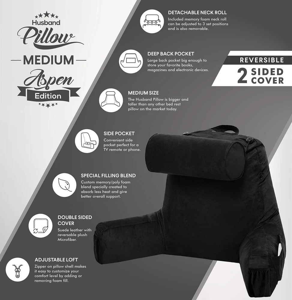 Husband Pillow Medium Aspen Edition Stable Black, Sit Up Reading & Bed Rest with Arms, Ultra-Comfy, Detach Neck Roll - Premium Shredded Memory Foam Backrest, Reverses to Micro: Suede or Plush Product Details Size: Medium Aspen Edition Color: | Stable Black | Brand: Husband Pillow MPN: MINIHUSB-COW-SMSblack UPC: 632726096083 EAN: 0632726096083 Brand: Husband Pillow Special Feature: Removable Cover Color: | Stable Black | Size: Medium Aspen Edition Fill Material: Memory Foam Brand: Husband Pillow Special Feature: Removable Cover Color: | Stable Black | Size: Medium Aspen Edition Fill Material: Memory Foam Shape: Wedge Age Range (Description): Adult Recommended Uses For Product: Reading Use for: Back Material: Memory Foam Item Firmness Description: Medium Product Care Instructions: Machine Wash Number of Pieces: 1 Pattern: Solid Item Weight: 2 Pounds Fabric Type: Microplush/Microsuede UPC: 632726096083 Manufacturer: Hit Notion Product Dimensions: 8.5 x 15 x 31.5 inches Item Weight: 2 pounds Country of Origin: China Item model number: MINIHUSB-COW-SMSblack Date First Available: March 28, 2020 Generous comfort scaled to suit: if youre looking for a big, cozy reading pillow that wont overwhelm you or your bed, this is your guy. The just-right husband pillow offers the same outrageous comfort as its big brother, but its tailored to perfectly fit smaller people and spaces. The aspen editions reversible cover means you get two styles in one amazing reading pillow. Enjoy smooth microsuede or fuzzy microfiber, whichever surface matches your mood and decor. Pockets for everything: remote, tablet, glasses, phone - spacious side and back pockets mean there is space for all your most essential items. Theres even room to stash your favorite energy bar. Although with this relaxing bed rest pillow in your life you may be tempted to skip that evening run. Bikers and other exercise enthusiasts will love the detachable neck roll which makes a great bolster for tired knees or feet. Your kids will love this: homework can actually be fun when youngsters have a cozy reading pillow with arms to keep them company. The shredded memory foam fill provides plenty of back support, and a cuddly pillow is a happy addition to any child or teens room. Family movie night is twice as nice when everyone has a pillow thats just the right size. Grab the popcorn and skittles and enjoy. If someone in your family is college-bound, this bed pillow makes any dorm feel a little more like home. An array of choices: happiness is all about choices, and this pillow gives you plenty of them. A hidden zipper allows you to add or remove memory foam to adjust the loft, so you have just the right amount of back support. Easily switch the reversible cover from microsuede to microfiber for another change of pace. And, if you redecorate, your favorite pillow will still look perfect. Covers are available in an array of colors and styles. Comfort Guarantee: The superior quality and workmanship of the husband pillow is backed by our promised to resolve all issues . This pillow is taller and wider than the leading backrest pillows available, measuring a generous 23 inches in height. In addition, we sell extra covers, should you ever want to change colors or replace the cover.