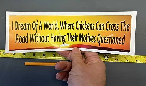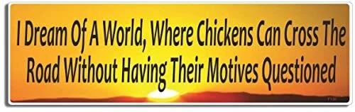 Return Policy Fast Delivery Trusted seller - I Dream of A World, Where Chickens CAN Cross The Road without Having Their Motives Questioned - Funny Bumper Sticker - 3 X 10 inches - Professionally Made in The USA - Vinyl Car Decal Product Description Brand new, hilarious bumper sticker decal. The highest quality durable print. Rain, snow, heat, or cold, this sticker will look new for many years! Strong adhesive will keep it w you put it for as long as you want it t! Shipped stapled to chip board to maintain perfect condition through shipping. Makes the perfect gift for someone with a great sense of humor! 10" X 3" (25cm X 8cm) Not overbearing but easy to read from a distance. Shipping Returns Payment Shipping Shipping is FREE to all addresses other than APO/PO boxes in the lower 48 states. All our stock ships from US-based warehouses. Shipped via USPS or UPS (depending on location and package weight) Unless stated otherwise, all orders will ship within 24-72 hours of your payment being processed. Check our feedback to see the great reviews of FAST shipping we offer. Returns Seller does not accept returns Payment We currently accept payment via eBay managed payments only. Once payment is cleared, we will dispatch your shipment within 1-3 business days. Please refer to the "Shipping" tab for more information regarding shipping speed to your destination.