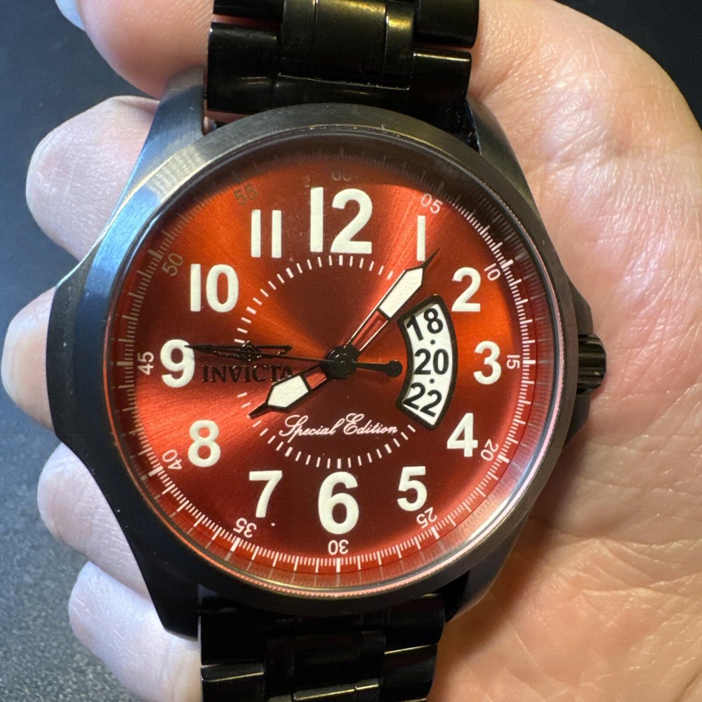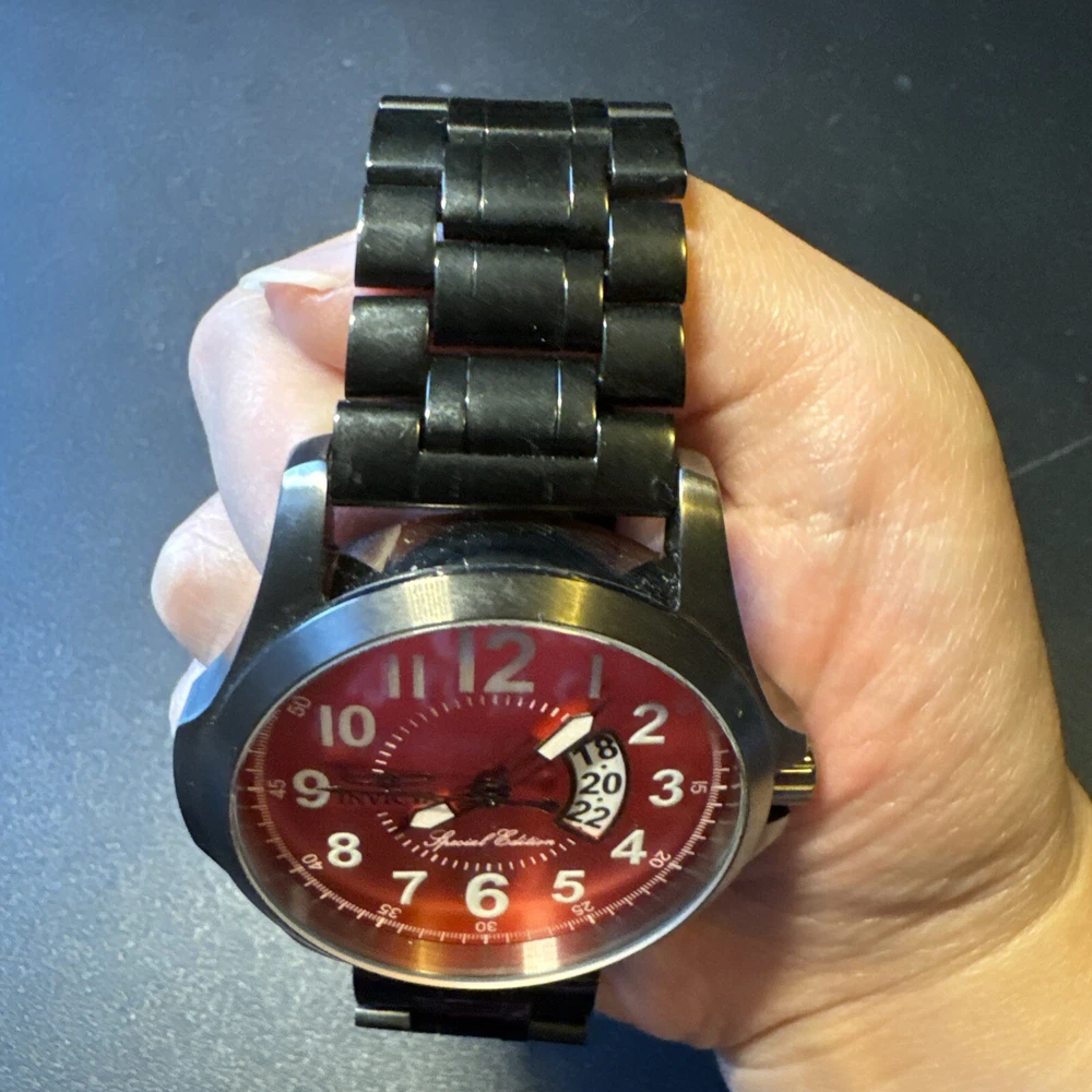 Elevate your style with this stunning red Invicta Force wristwatch. Crafted from high-quality steel, this special edition timepiece boasts a sleek analog display and powerful quartz movement. With a water resistance of up to 100 meters, this watch is perfect for the adventurous man. The reference number 18985 adds a touch of sophistication to the design, making it a great addition to any collection. Ever since its founding in 2008, Invicta has been known for its high-quality watches that are designed to impress. This wristwatch is no exception, with its striking red case and elegant design. It's perfect for men who want to make a statement with their accessories. Add this incredible timepiece to your collection. Personal used condition in collection. Not currently running. NEEDS NEW BATTERIES! Bought couple years back and it's been in storage. No box. Just the watch itself with the band. Very good pristine condition. Currently sold out at retail value on official site rare to find. offers welcome.