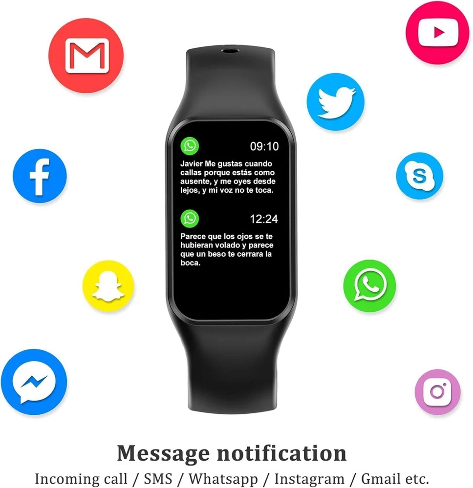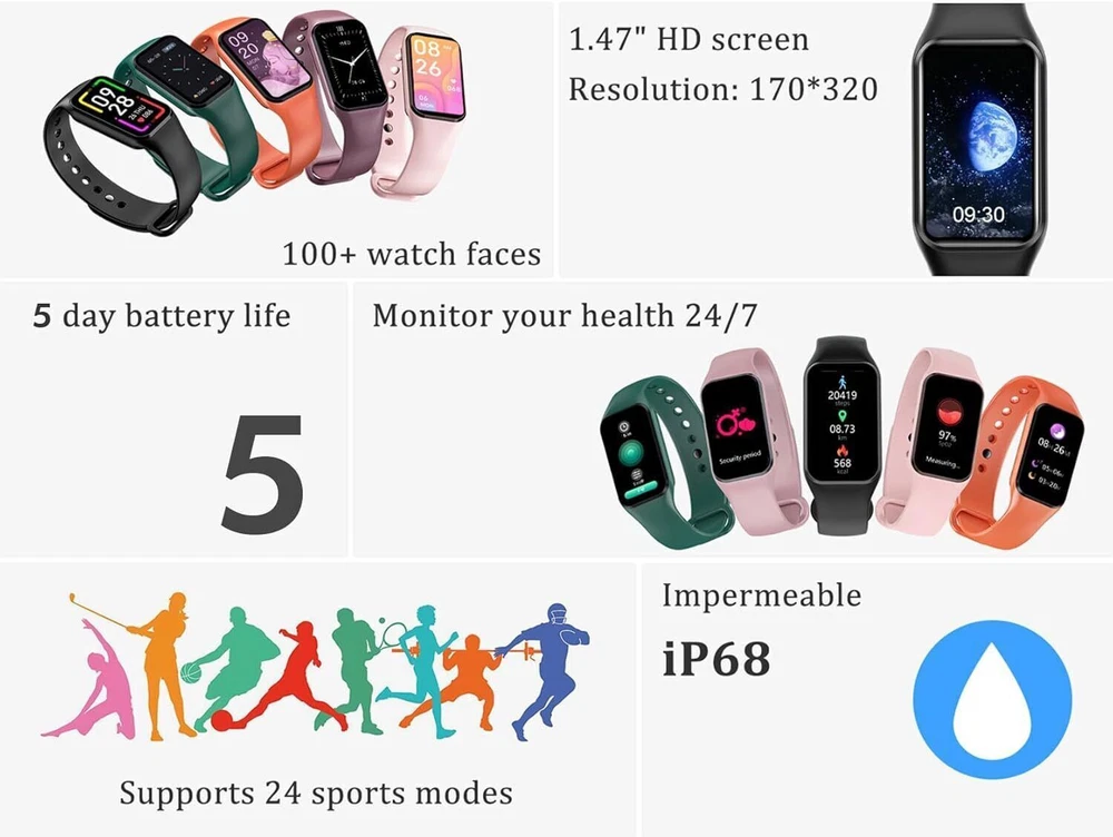 đăSmart Watch for Men WomenăThe R1 smart watch consists of a 1.47" HD color display perfectly paired with a skin-friendly fitness silicone strap and easy to wear. The ultra-thin bezel outlines on-screen content, drawing attention to your favorite features. 150+ online watch faces to change freely and define your style. đăHealth MonitorăEquipped with advanced HR sensor, and measure your heart rate and check blood oxygen levels in real time 24/7. Automatic sleep tracker can monitor your sleep status and provide a comprehensive sleep quality analysis (deep sleep, light sleep, and wake-up time), allowing you to develop a good sleeping habits. NOTE: The data displayed on this smartwatch is for reference only and is not intended for medical use. đă24 Sports Modes and WaterproofăThe sports watch can record your daily activities, such as steps, distance and calories burned. Furthermore, the digital watch has 24 sports modes, including walking, running, cycling, skipping, badminton, basketball and football.With IP68 waterproof rating, no need to take off the watch when you wash your hands or rainy days, which is convenient for your daily use. *Note: Please don't use the watch in a HOT WATER environment. đăIntelligent Notification CenterăAfter connecting the smartwatch to your phone, the fitness watch vibrates to notify you of text messages, emails and messages from apps (Facebook, WhatsApp, etc.). You can also hang up a call from your smartwatch. The Fitness Watch lasts 5 days on a 2-hour charge and has 20 days of standby time. You can also adjust the brightness and duration of the sports watch's screen brightness. đăExperience Convenient Smart LifeăDownload the "GloryFit" app to unlock more useful functions for your smartwatch: music playback, weather forecast, remote camera, alarm, stopwatch, chronograph, sedentary reminder and more. Our smartwatch fitness tracker is designed to help you face every day well and is compatible with almost all smartphones such as Samsung, iPhone etc.