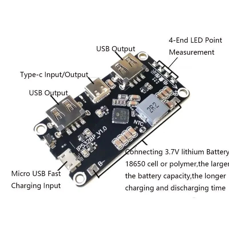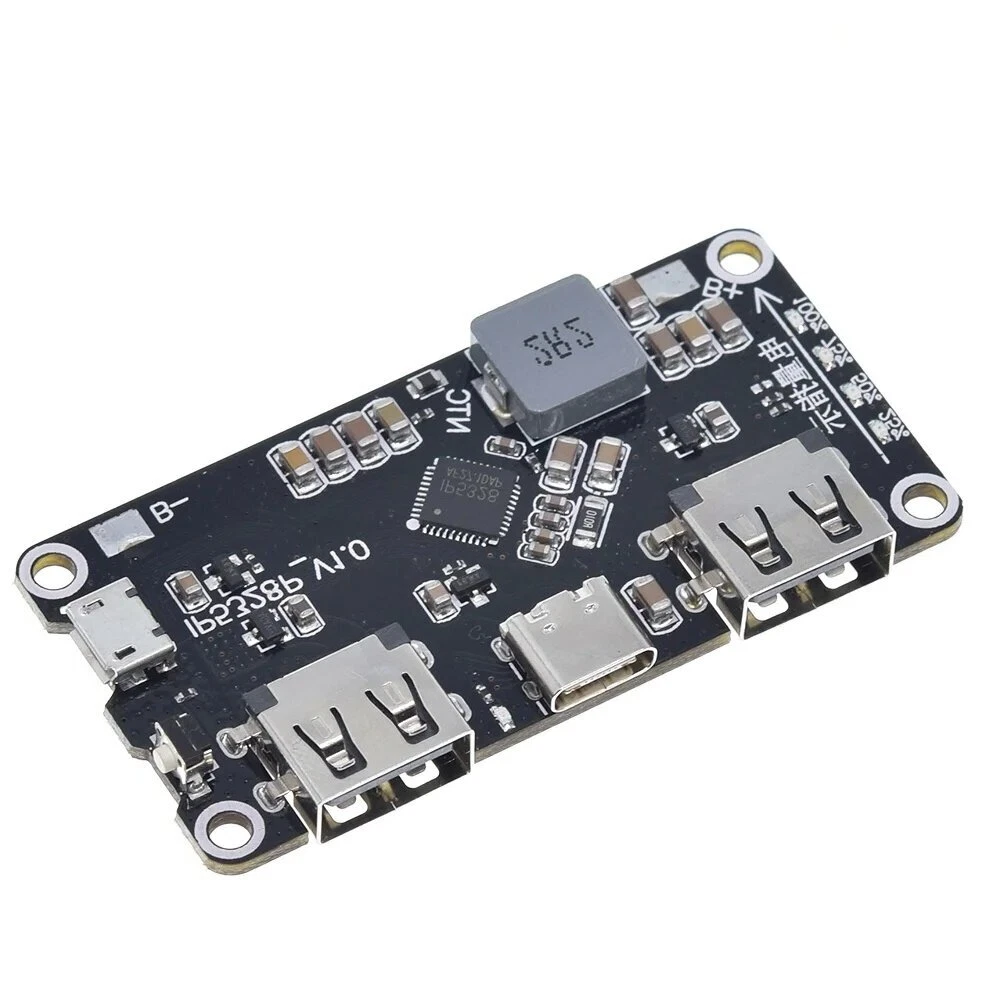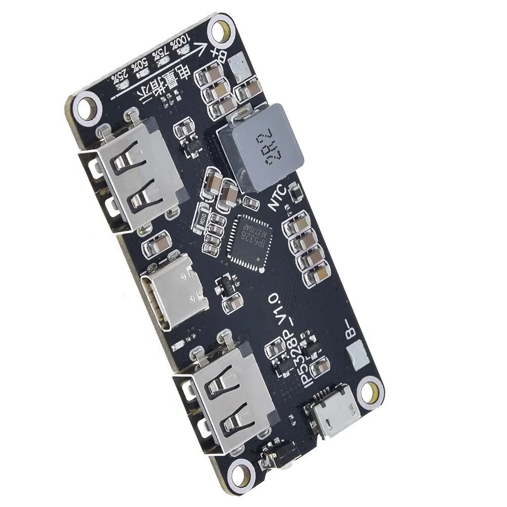 IP5328P Dual USB 18650Battery Charger treasure Tpye-c 3.7V to 5V 9V 12V Step up Fast Quick Charger Circuit Board QC2.0 QC3.0 Description Adopt Infinix IP5328P mobile power solution, four layers of gold plate, optimized layout and wiring, support multiple fast charging protocols, bidirectional 18W fast charging, a total of 4 charging interfaces can be supported: 2 USB-A output interfaces, 1 USB-C interface, 1 Micro USB interface, 4 interfaces all support fast charge, 2 USB-A ports support QC3.0, FCP, AFC, MTK, SFCP fast charge output, power up to 18W; support Apple, Samsung, BC1.2 agreement. The USB-C port supports USB PD bidirectional fast charge, and is compatible with FCP, AFC, SFCP fast charge input and QC3.0, FCP, AFC, MTK, SFCP fast charge output. MicroUSB supports FCP, AFC, SFCP fast charge input. Product module parameters:Size: 65mm*32.5mm ultra-thin corner hole diameter 3mm Output interface: USBA+USBA+TYPE-C supports fast charge output (see specification for details of fast charge protocol) Input interface: MICRO + TYPE-C supports fast charging input (see specification for details of fast charging protocol) Battery type: 3.7V battery (collection or 18650 lithium battery) connected in parallel in a single cell, the capacity is not limited, the larger the capacity, the longer the charge and discharge time, please add a protection board for safety, the motherboard has positive and negative points, the battery is not allowed If the connection is reversed, the motherboard will be burned at your own risk! ! ! Quick charge indication: input and output high voltage fast charge indicator Conversion efficiency: 95% efficiency (varies in power efficiency at different voltages) See the specifications for details Press the key: The duration of the key is longer than 60ms, but less than 2s, which is a short press action. Short press will turn on the power indicator and boost output. Pressing for longer than 10s will reset the entire system. There will be no response to key presses less than 30ms. Mobile phone insertion automatic detection function: IP5328P automatically detects the phone plug-in, immediately wakes up from standby, turns on the boost 5V to charge the phone, saves the key operation, and supports the keyless solution. Function description:Low battery lockout and activation When the IP5328P is connected to the battery for the first time, no matter what the battery voltage is, the chip is locked, and the lowest bit of the power light will flash 4 Prompt again; in the non-charging state, if the battery voltage is too low to trigger a low power shutdown, the IP5328P will also enter the locked state. In the locked state, in order to reduce static power consumption, the IP5328P does not have a mobile phone insertion detection function, nor can it be activated by pressing a button. this When the key is pressed, the boost output cannot be activated, but the lowest position of the power light will flash 4 times to prompt. In the locked state, you must enter the charging state to activate the chip function. Charge IP5328P has a constant current, constant voltage lithium battery charging management system that supports a synchronous switch structure. Can automatically match different charging power Pressure specifications. When the battery voltage is less than 3V, use 250mA trickle charging; when the battery voltage is greater than 3V, enter the input constant current charging, the battery terminal maximum charging Electric current 5.0A; when the battery voltage is close to the set battery voltage, enter the constant voltage charging; when the battery terminal charging current is less than about 300mA and the battery When the cell voltage is close to the constant voltage, stop charging. After charging, if the battery voltage is lower than 4.1V, recharge the battery. IP5328P adopts switch charging technology with a switching frequency of 500kHz. Normal 5V input charging, the maximum input power is 10W; fast charging input When charging, the maximum input power is 18W. The maximum charging current of the battery can reach 5.0A, and the charging efficiency is up to 94%, which can shorten the charging time by 3/4. IP5328P will automatically adjust the charging current to adapt to different load capacity adapters. IP5328P does not support the same charge and discharge, and the output discharge port will be closed in the charging state to prevent the input high voltage from damaging the charged device. Boost IP5328P integrates a synchronous switching converter system that supports high voltage output, supports a wide voltage range output of 5V~12V, negative The load capacity is 5V-3.1A, 7V-2.4A, 9V-2.0A, 12V-1.5A. The switching frequency is 375KHz. Built-in soft start Function, to prevent failure caused by excessive inrush current at startup, integrated output over current, short circuit, over voltage, over temperature and other protection functions, Ensure stable and reliable operation of the system. The output current of the boost system can be automatically adjusted with the temperature to ensure that the IC temperature is below the settemperature.