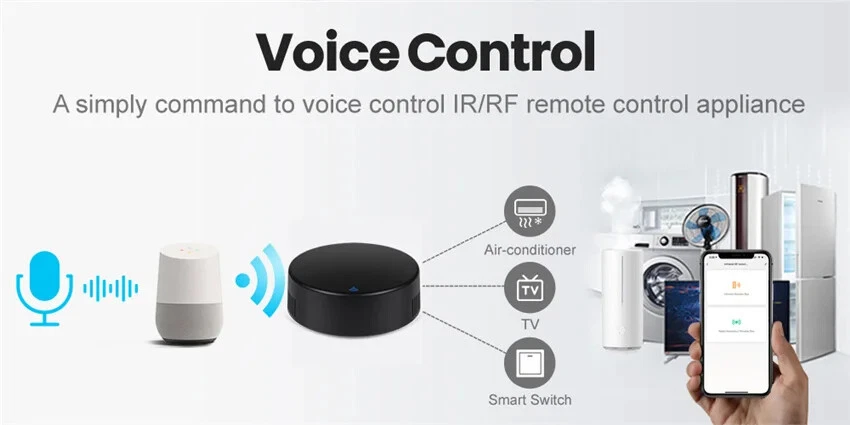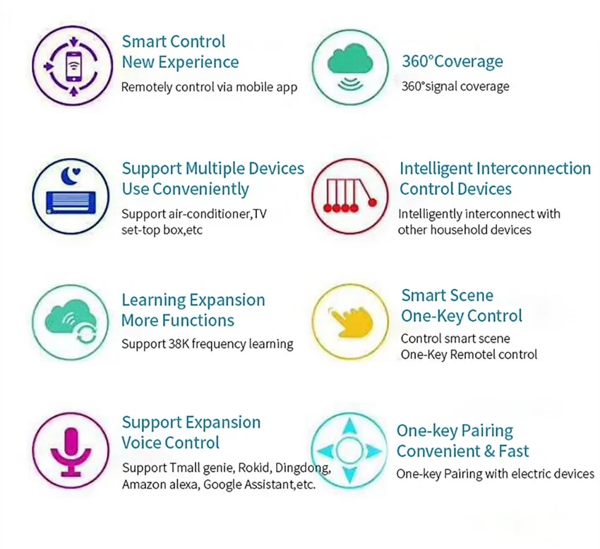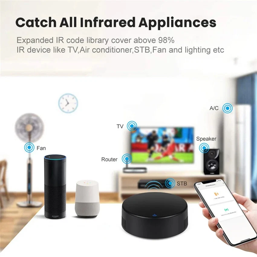 Product Features: With this Universal IR Remote Control, you can use your smart phone to control home appliances, such as STB(Set-Top-Box), TV Box, TV, Air Conditioner, Fan, DVD, and RF devices etc. Compatible with most of brands, for details, please refer to the supported brand list in App. Besides, it has LEARNING FUNCTON, allows you to copy the key function of original remote control to App. Note: Not compatible with the home appliances which use RF used Rolling coding or BLUETOOTH remote control. 1. Massive IR Code Database Support 4000+ brands, 50000+ IR Code on cloud, supported devices library is constantly being updated by the cloud. 2. RF(Radio Frequency) Copy and Repeat Support RF Copy and Repeat. So it can support Curtanins, Roller Shutter, Window Pusher,Hanger, Projection Screen, Garage Door, Retractable Door, RF Switch, and even customized button. 3. App Remote Control Remote Control your home appliances by using "Tuya Smart" App in your smart phone anywhere anytime. For example: Switch on home A/C in advance, enjoying the comfortable temperature once you get home. 4. Easy to install and connect to APP Use the latest Tuya chip. After power is supplied to it, the APP will automatically find it through Bluetooth. You can connect it to the "Smart Life" APP with just a few clicks on the screen. 5. Voice Control By connecting Intelligent speaker, such as Amazon Alexa, Google Home, you are able to control your home appliances by voice. 6. DIY Customizing buttons in the Tuya Smart App if your home appliances brand is not in the list or not supported. Product Parameter: * Input: DC 5V/1A(Micro USB NO Adapter) * IR(Infrared Frequency): 38KHz * RF(Radio Frequency): 433MHz and 315MHz * IR Remote Control Distance: 10m (Unobstructed environment) * RF Remote Control Distance: 100m(Unobstructed environment) * Connection: Wi-Fi 2.4GHz * App: Smart Life * Material: ABS Why choose this product? Say goodbye to use remote controls for each of the IR home appliances such as TV, Air-Conditioner , TV box, light, Fan, Audio, etc. You can remotely control these devices with the tap of your finger on the mobile App, also you control RF-enabeld devices like curtain, rooler shutter, garage door, RF switch, etc. Please kindly read the user manual carefully before usage and keep it for future reference.