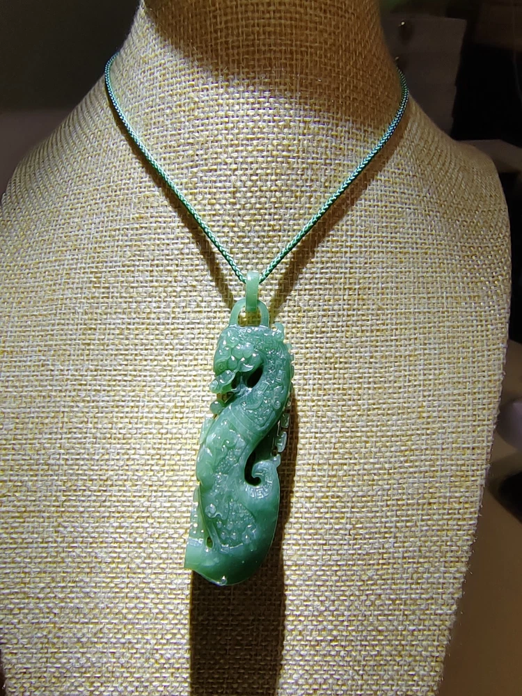 Natural Ice Bluish Green Jadeite Jade Dragon Pendant Fine Hollow Hand Carving Icy Ice Bluish Green Natural Jadeite Jade Dragon Pendant for Prosperity and Longevity With certificate (Authentic Type A Jadeite) 天然翡翠 - 镂空精雕活环冰种蓝水天然翡翠吉瑞祥龙牌子 / エメラルドドラゴンペンダント 备证书 (A货天然翡翠) *Certificate No - GFR00200714381 *Materials - 100% Natural Jadeite Jade *Refractive Index - 1.66 ( spot measurement ) *Jadeite Size - appr ox - 79.70mm/22.20mm/11.60mm *Weight - 36.97 grams *Carat - 184.85 carats *Original - Guatemala / Carved and Refine in China *Package - 1 X Pendant with String / 1 X Gift Box / 1 X Certificate *Delivery - Worldwide Free Shipping Video Display Link :- https://youtu.be/VfGPDp4u5_4 Only One Unit Available ************************************************************************ This jadeite pendant is an exceptionally rare and finely handcrafted treasure, belonging to the icy bluish green variety of jadeite. Crafted with meticulous skill, it features delicate hollowing and intricate carving, forming the image of an auspicious dragon. This exquisite piece comes with a certificate, verifying its status as Grade A natural jadeite. Its dimensions are approximately 79.70mm/22.20mm/11.60mm, with a weight of 36.97 grams, equivalent to 184.85 carats. Jadeite, as a precious gemstone, is highly sought after for its rarity. This pendant not only holds significant collectible value but also represents a fusion of carving art and jewelry craftsmanship. The auspicious dragon symbolizes authority and good fortune, making this pendant not only an artistic masterpiece but also a symbol of luck and blessings. Its presence not only provides visual enjoyment but also embodies people's aspirations for beauty and happiness. This exquisite piece can truly be described as a crystallization of carving art and jewelry. A slight difference in color compositions as shown in the photos may occur as with all colored gemstones. Color changes under different lighting conditions, for example indoors or outdoors, and even the time of day can make the stone's color look slightly different. We do our best to display the colors as we perceive them. Color perception is highly personal, some people perceive more colors than others, and colors may appear differently on different screens and devices due to differences in screen hardware and device display settings. Kindly take this into consideration before purchasing. The Rarity and Collectible Value of Natural Jadeite Jadeite, often referred to as "imperial jade" due to its historical association with royalty, is a gemstone of unparalleled rarity and enduring collectible value. Its captivating allure lies not only in its exquisite beauty but also in its remarkable geological formation, making it a treasure sought by collectors and connoisseurs worldwide. 1. Geological Rarity : Natural jadeite is exceptionally rare, originating from remote deposits in Myanmar (Burma), where geological conditions of high pressure and low temperature over millions of years have given birth to this magnificent gemstone. It is estimated that less than 1% of jadeite mined globally meets the stringent quality standards for fine jewelry and investment-grade pieces. 2. Vivid Color Palette : Jadeite is celebrated for its diverse and vibrant range of colors, from the iconic imperial green to mesmerizing lavender, radiant white, and fiery reds. The vividness of these hues is unparalleled, and collectors are often drawn to the challenge of acquiring specific colors and shades. 3. Transparency and Texture : The transparency and texture of jadeite are equally important factors contributing to its desirability. Fine jadeite possesses a crystalline clarity that allows light to penetrate and illuminate the gem from within, creating a luminous, almost ethereal quality. 4. Cultural Significance : Throughout history, jadeite has held immense cultural significance in various civilizations, including China, where it symbolizes virtue, integrity, and longevity. This cultural reverence adds an additional layer of allure to jadeite, making it a cherished symbol of heritage and tradition. 5. Investment Potential : Beyond its intrinsic beauty, jadeite is increasingly recognized as a solid investment option. Its scarcity, combined with growing global demand, has resulted in significant appreciation in value over the years. Savvy collectors and investors view jadeite as a tangible asset with the potential for long-term capital appreciation. 6. Expertise and Certification : Due to the nuanced nature of jadeite, it is essential to rely on reputable gemological expertise and certification when acquiring pieces. Certificates from recognized gemological laboratories authenticate the quality, origin, and natural properties of the gem, instilling confidence in both collectors and investors. 7. Heirloom Quality : Jadeite is often considered an heirloom, passed down through generations as a symbol of family heritage and prosperity. Its durability and timeless appeal ensure that it remains cherished for centuries. In conclusion, the rarity and collectible value of natural jadeite extend far beyond its aesthetic appeal. Its geological formation, captivating colors, and cultural significance make it a gemstone that transcends time and borders. For collectors and investors alike, jadeite represents not only a beautiful adornment but also a tangible piece of history and an enduring store of value. Jadeite Dragon - Dragon have been a auspicious totems since ancient times. Ancient kings were symbolized by dragons, Dragon symbolize power and dignity. In ancient times the jadeite culture is the perfect combination with a lot of culture, like Maya and Chinese culture. The dragon was only used by the royal family but in modern times, people still regard it as a symbol of bravery, strength, authority and even auspicious. The dragon is a representative of long