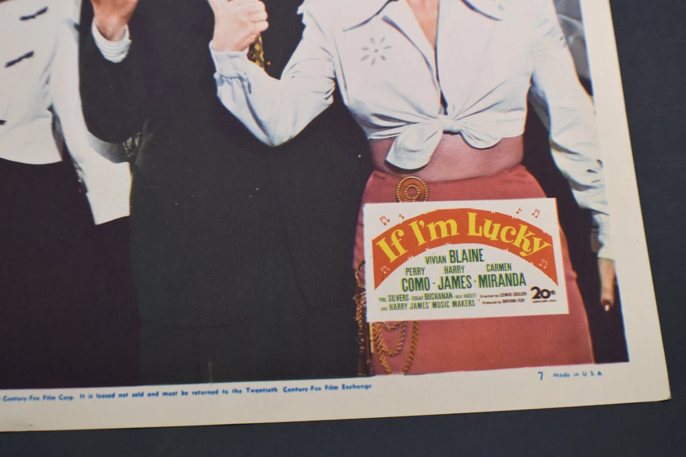 If I'm Lucky ORIGINAL Lobby Card #7 *Perry Como*Carmen Miranda*Harry James* 11 x14 inches See photos for condition details. Due to high loss in shipping to certain countries, insurance is required for shipping to a location that does not provide tracking PLEASE READ THE RETURN POLICY BELOW: RETURNS are seldom made, I have been on for many years and Buyers satisfaction is important to me. This is why I provide good description, detailed photos and request questions from you to help you make the right choice to eliminate returns. Please read the description and view detailed photos. Please ask questions if you have particular needs or need clarification. Communication is important, this helps eliminate returns and any confusion or buyers with particular needs, so please do not assume I know what you are looking for unless you tell me. NOTE: If purchasing multiple items, please do so by using the Ebay Shopping Cart, then select "Request Total for Seller" for the corrected shipping on a new invoice. Do not pay for the items before receiving this corrected invoice.