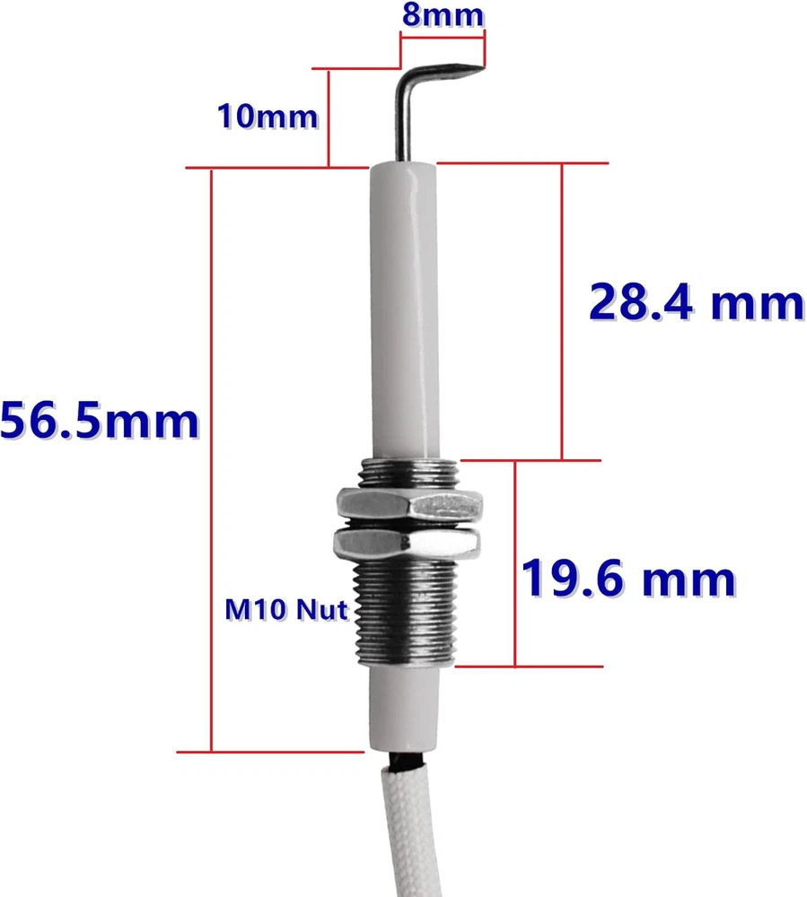 2 Pieces :27.56 inch(700mm) Ignitor Wire with M10*1 Ceramic Electrode length 55mm,product high temperature 200°C Universal spark with M10*1 thread includes two nuts to fix on your fire pit pan plate Please note that the connection to the igniter is circular, suitable for pressing the igniter;The end of the terminal is in round with 2.3mm insert, If yours is square, try to stamp it and connect your current igniter to get a signal Igniter ceramic electrode universally fit for many fire pit table pan,also fit BBQ grill burner, gas stove, grill, heater.Please check and compare dimensions with your original parts before place order Made of high quality material ensure safe and long-lasting performance. There is a heat resistance coating over the wire to ensure safe use. will guarantee you 100% satisfaction of the Ceramic Electrode Assembly Igniter Ceramic Electrode Replacement Part .27.56-inch Ignitor Wire &Ceramic Spark Plug Ignition Electrode for Fire Pit Burner, Gas Grill Burner