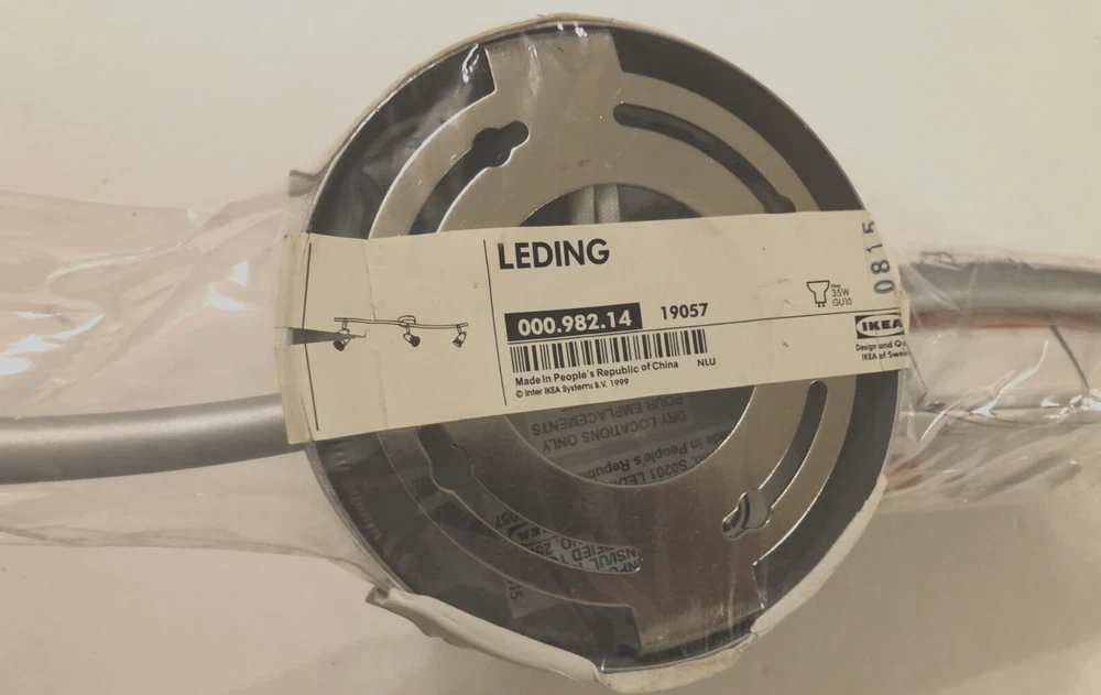 Country/Region of Manufacture:ChinaItem Length:28"Light Direction:Downwards, IndirectSensor Type:LightMPN:19057UPC:Does not applyItem Width:5 1/8" across mounting plateFeatures:3-Lightgtin13:Does not applyManufacturer:IkeaItem Height:5" with pin spots not extendedShade Shape:ConeMaterial:Stainless SteelBrand:IKEAPower Source:HardwiredManufacturer Warranty:NAModel:000.982.14Room:Kitchen/Bathroom/Living room/OfficeNumber of Lights:3Style:ModernType:Track LightingInstallation Area:IndoorLighting Technology:HalogenProduct Line:LedingColor:Silver