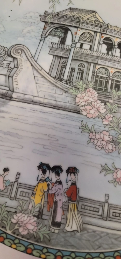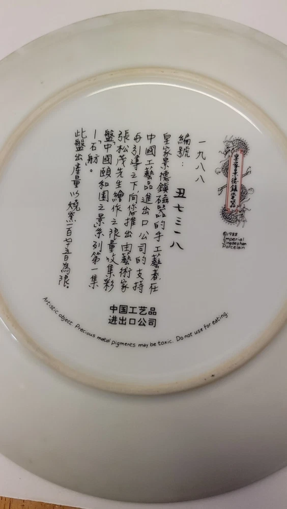 The Imperial Chinese Jingdezhen Porcelain collector plate features a floral design inspired by the Marble Boat at the Summer Palace in China. This round plate, measuring 8.5 inches in diameter, is a vintage piece from the late 20th century, specifically produced in the 1980s. Made of porcelain, this decorative plate showcases intricate detailing and vibrant multicolor accents, reflecting the imperial Chinese style of Jingdezhen porcelain craftsmanship. The brand, Imperial Jingdezhen, is known for producing high-quality, collectible porcelain items that capture the essence of Chinese culture and history.