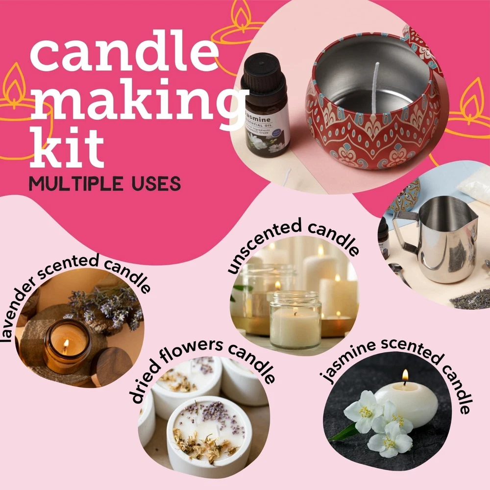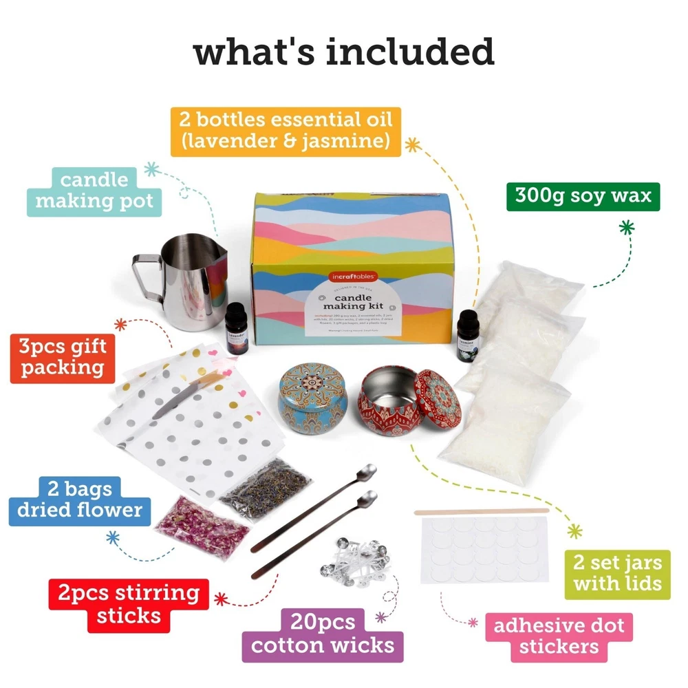 VALUE PACK: Incraftables candle making starter kit includes Soy wax: 300g, Essential oil: 2 bottles, Jars with lids: 2 sets, Cotton wicks: 20pcs, Stirring sticks: 2pcs, Dried flower: 2 bags, Gift packing: 3pcs, Candle making pot & Bag. MICROWAVABLE CANDLE WAX: Our soy wax melts perfectly in the microwave and requires minimal equipment. This is great for those wanting small batches of candles. Try soy wax beads for candle making without the mess. Simply melt them down and mix at 120 degrees fahrenheit to get started; if you want to add dyes or scents, raise the temperature to 180 degrees fahrenheit (or 185 degrees fahrenheit if the dyes do not fully melt). ECO-FRIENDLY CANDLE WICKS: Our wax will burn clean and non-toxic, it is 100% cotton with no lead and zinc so there’s no bad smell during burning. FUNDING USA SCHOOLS: In partnership with the DonorsChoose, a leading education non-profit, a portion of every Incraftables sale goes towards much needed funding at USA public schools to donate arts & crafts supplies so that teachers don’t have to pay for them from their own pockets. FOR CRAFTERS, BY CRAFTERS: Incraftables isn’t just a brand; it’s a passion project born from two NY parents of two young crafters. It’s guided by a Creative Council of 50 artists, teachers, and makers who help select the best supplies for each kit. PERFECT GIFT: Soy wax candle making kit is a perfect gift for your kids, teens, young adults and grown-ups which will provide hours of at-home fun. Perfect gifts for Mother's Day, ideal for Mom & Grandparent. MANUFACTURER GUARANTEE: At our USA-based small family business, we stand behind the quality of our products. We also offer 24/7 customer support to answer any questions or concerns you may have. Trust in our commitment to providing top-notch products and excellent customer service.