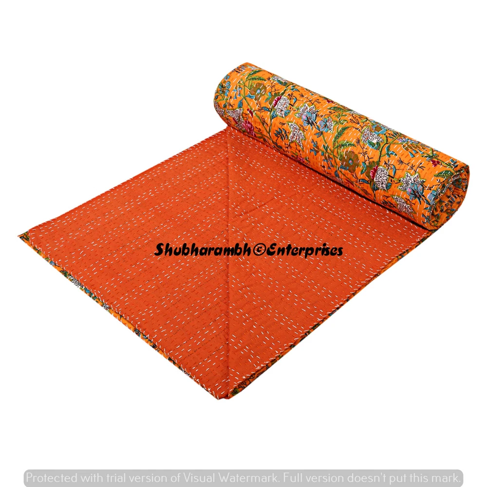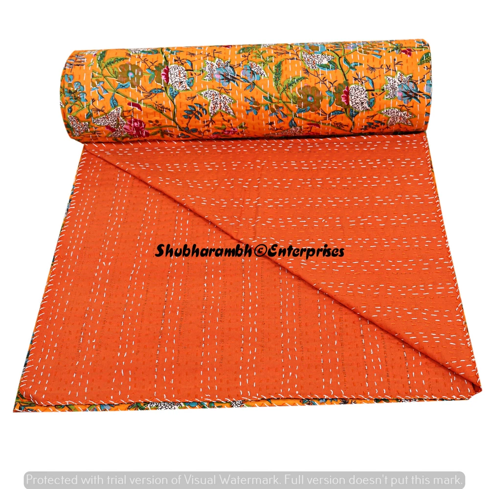Indian Orange Floral Kantha Throw Blanket Reversible Comforter Handmade Blanket