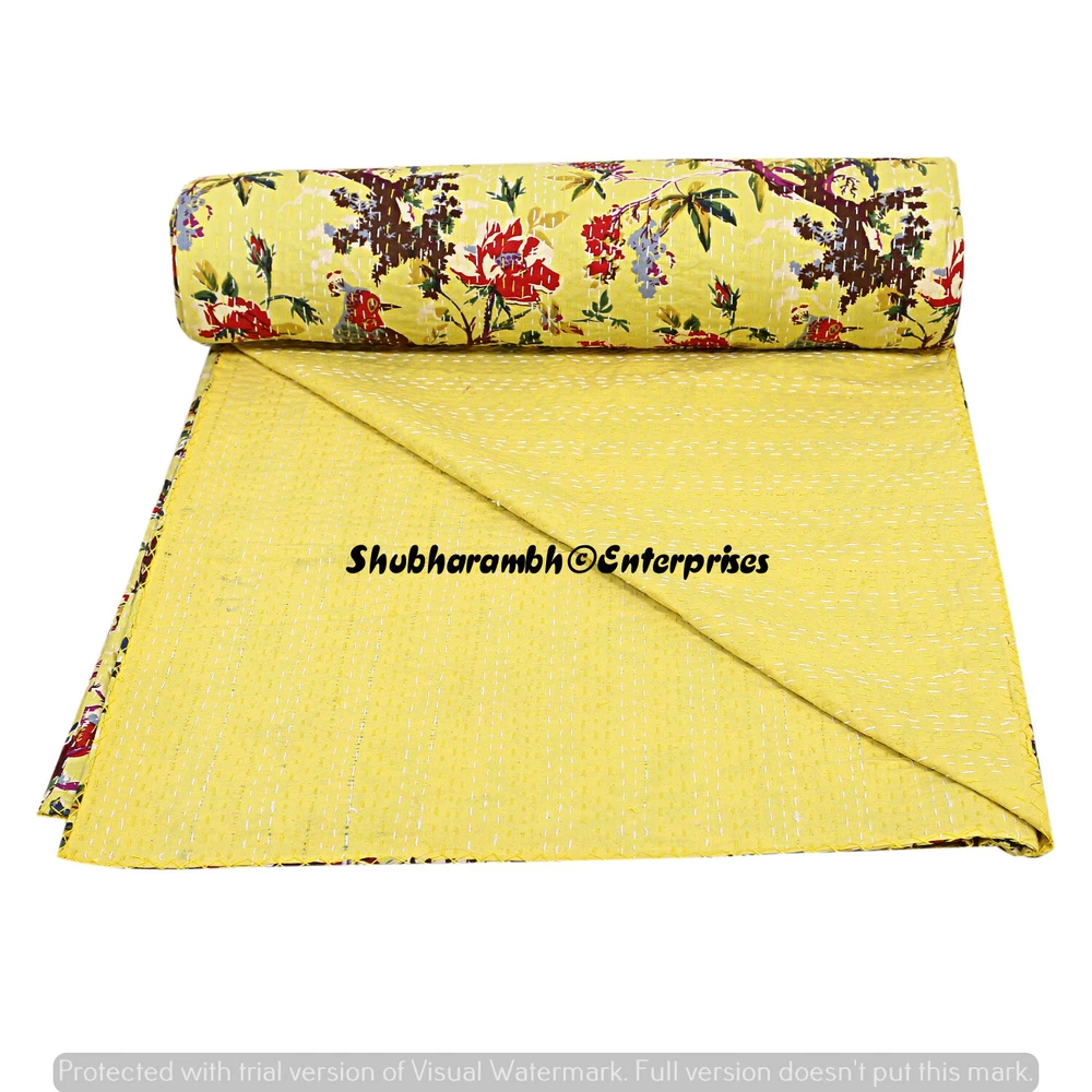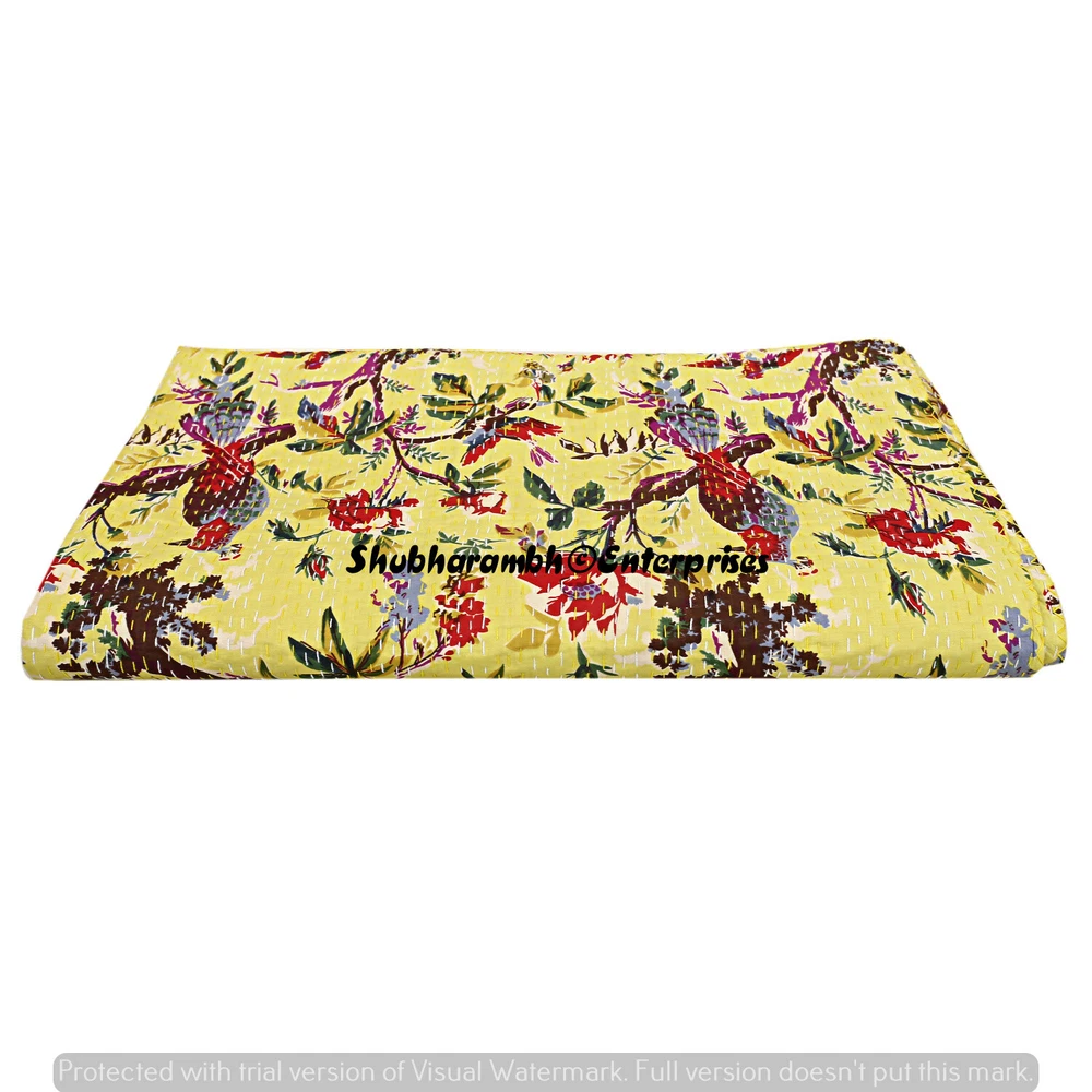 Indian Yellow Throw Blanket Indian Bird Print Kantha Quilt Cotton Boho Bedspread
