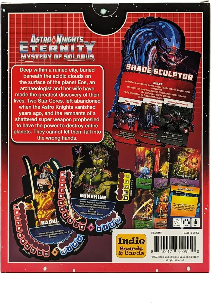 Further Details Title: Indie Boards & Cards Astro Knights Eternity: Mystery of Solarus, Strategy Games Condition: New Brand: Indie Boards and Cards Release Date: 03/20/2024 MPN: IBCIBCAKEMS1 Material: Cardstock Theme: Fantasy Language: English Age Level: 14 years and up Min. Number of Players: 1 to 4 Genre: Strategy Item Length: 203mm Item Width: 165mm Item Height: 2mm Description: Deep within a ruined city, buried beneath the acidic clouds on the surface of the planet Eos, an archaeologist and her wife have made the greatest discovery of their lives. Two Star Cores, left abandoned when the Astro Knights vanished years ago, and the remnants of a shattered super weapon prophesied to have the power to destroy entire planets. They cannot let them fall into the wrong hands. Astro Knights Eternity: Mystery of Solarus continues the battle from the exciting base game. It brings a new nemesis, new minions, two new Astro Knights, and a new homeworld. The battle continues across another system as the Astro Knights continue to defend the universe! Item Weight: 270g Country/Region of Manufacture: China Type: Board Games Color: Nicht Zutreffend Age Level: Ab 14 Jahren "Astro Knights Eternity: Mystery of Solarus" is an extension of the base game, continuing the battle with new elements. The expansion introduces a new nemesis, minions, two Astro Knights, and a new homeworld, expanding the universe and storyline. The ongoing battle spans across another system as the Astro Knights strive to protect the universe from impending danger. Deckbuilding with no shuffling Variable turn order Missing Information? Please contact us if any details are missing and where possible we will add the information to our listing.