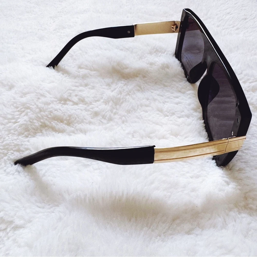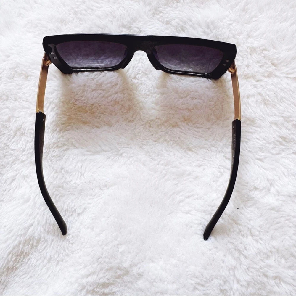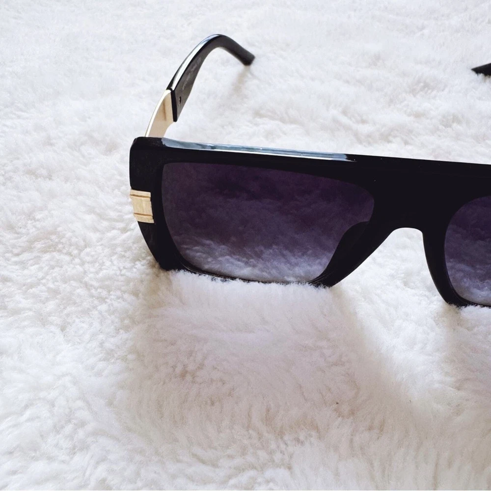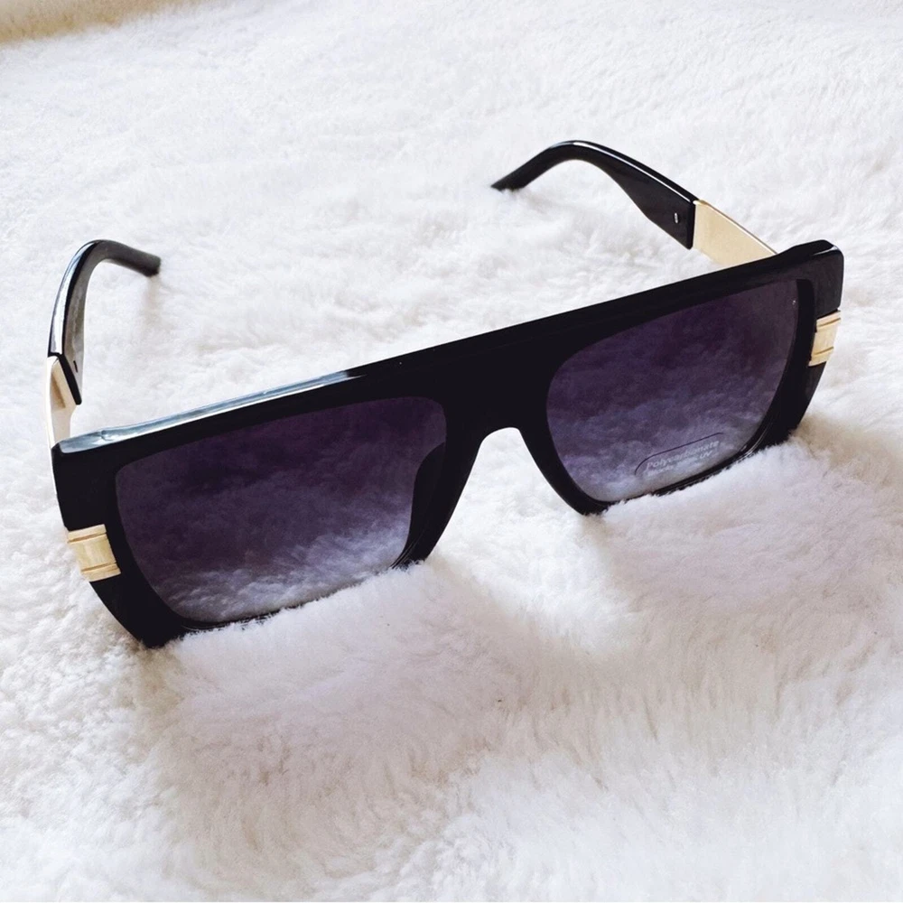These sophisticated Inez sunglasses boast a robust frame with striking gold accents, offering a sharp, modern look. Designed for those who appreciate a blend of luxury and functionality, they are the perfect accessory for enhancing any outfit from casual wear to more formal attire. These glasses comes with a fabric pouch and eyeglasses cloth wipe. Some reflections may be pictured due to the mirrored lenses - they are not flaws to the product. The sunglasses provides UV400 protection. Lens Width: 57mm Bridge Width: 10mm Temple Length: 147mm Height: 52mm