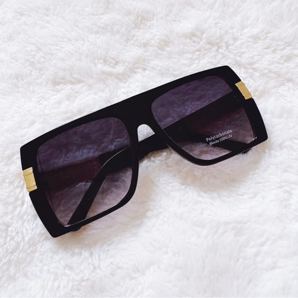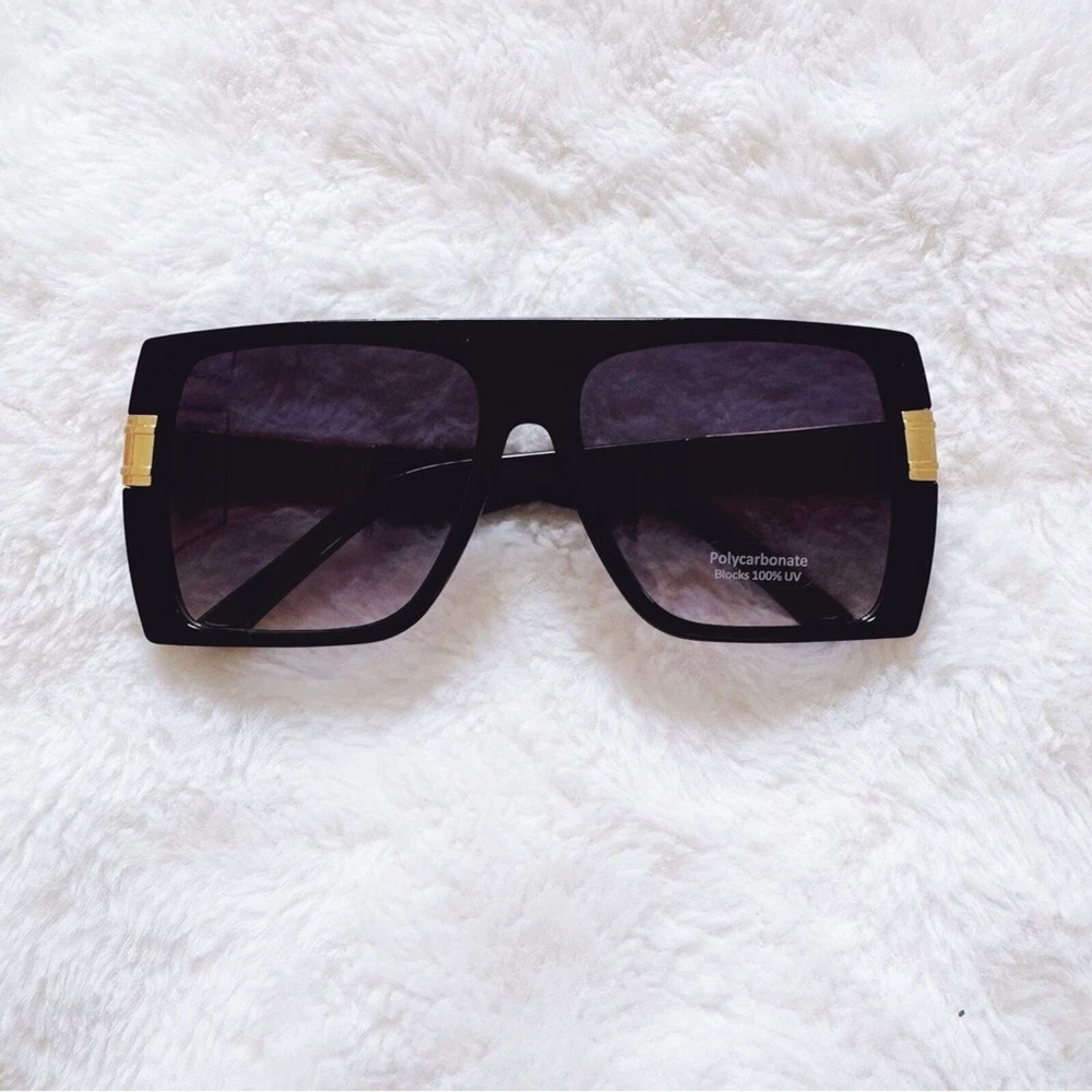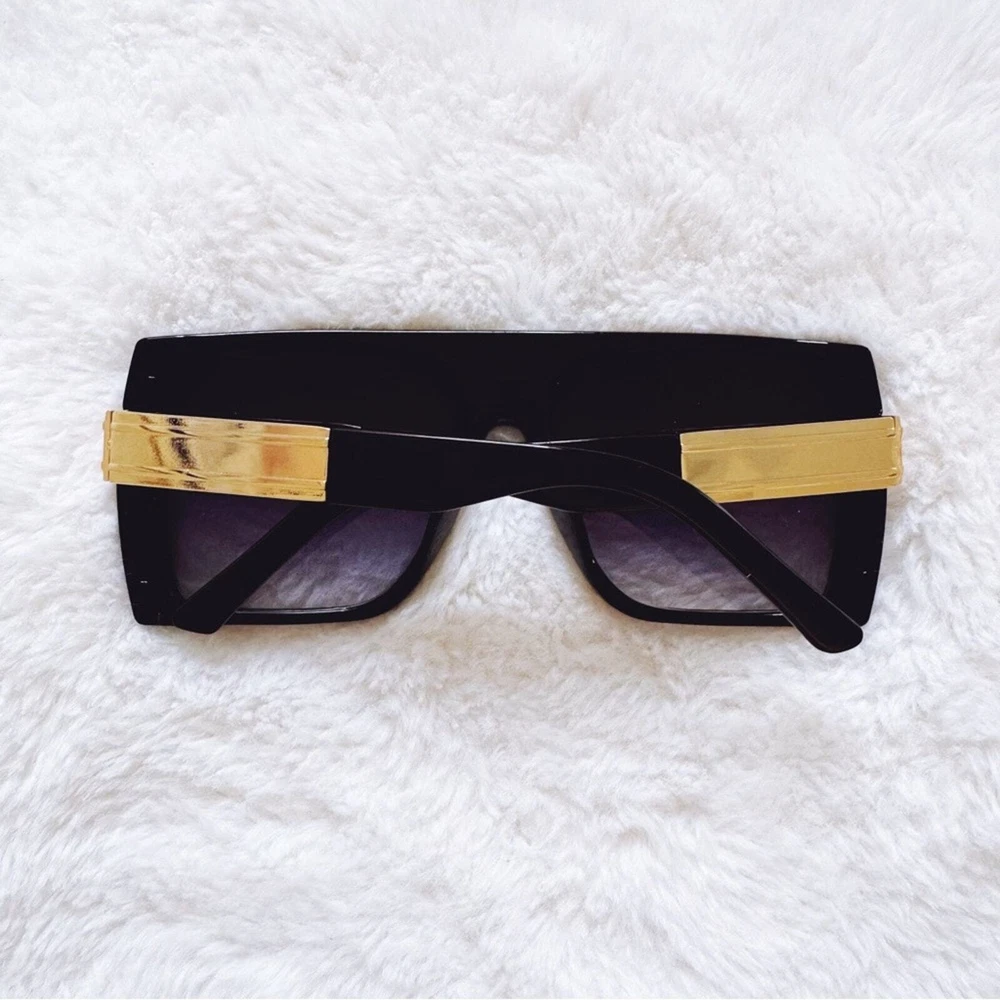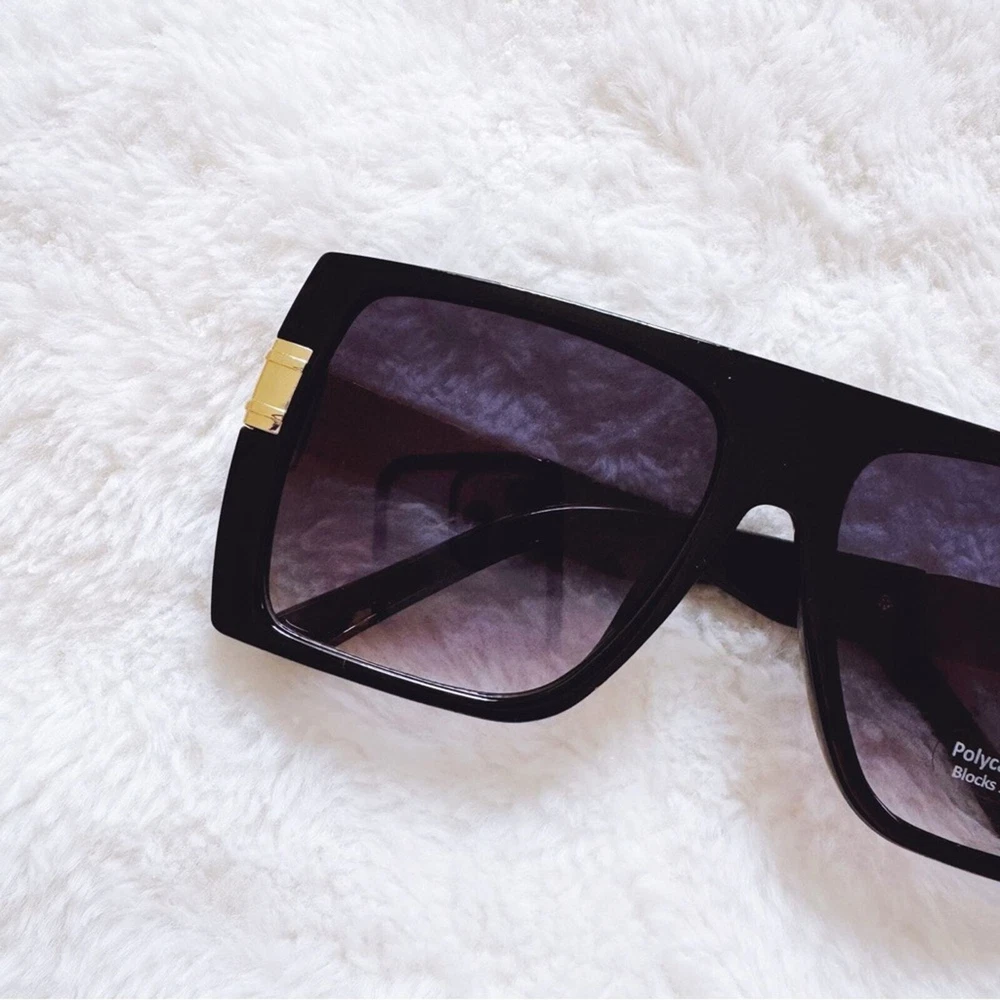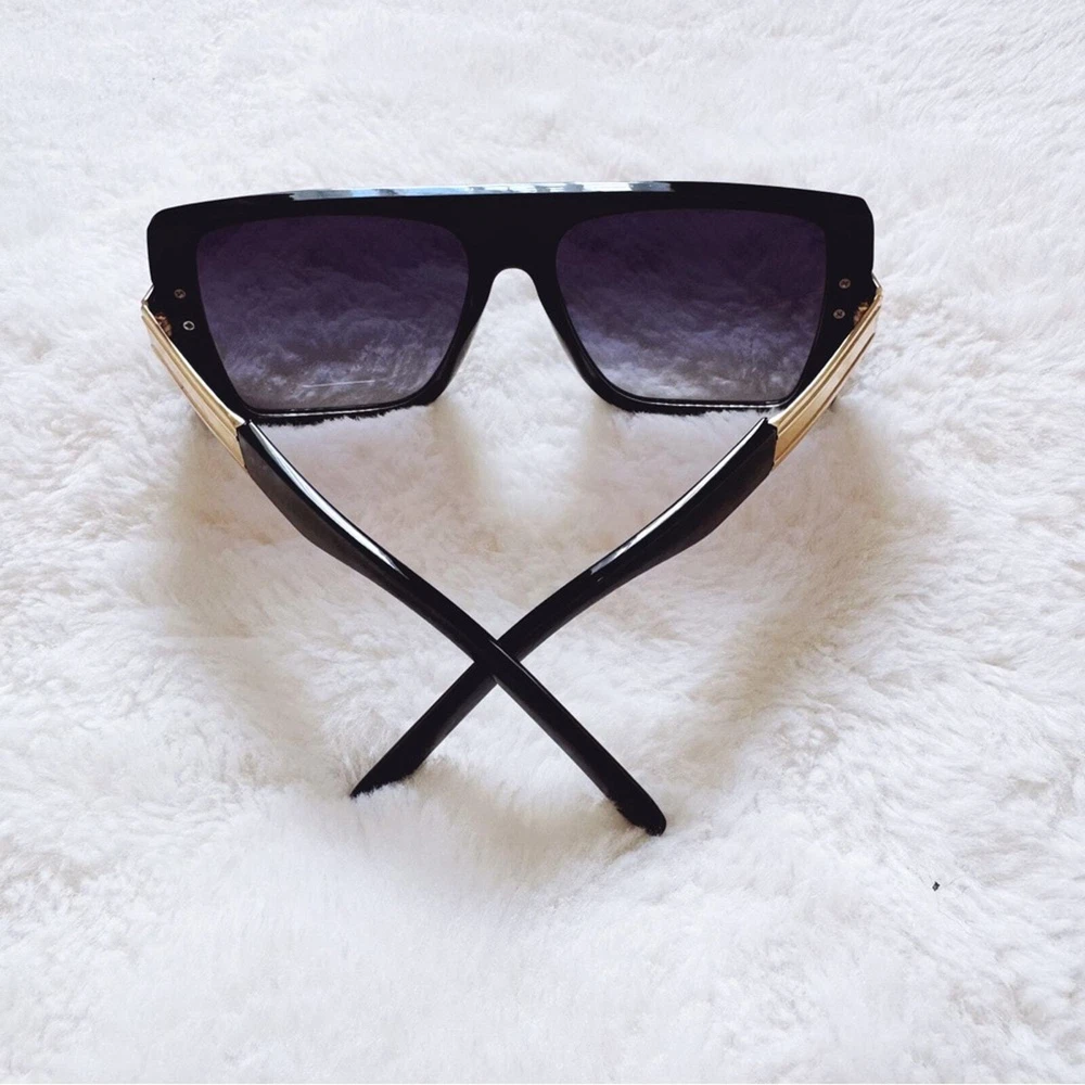 These sophisticated Inez sunglasses boast a robust frame with striking gold accents, offering a sharp, modern look. Designed for those who appreciate a blend of luxury and functionality, they are the perfect accessory for enhancing any outfit from casual wear to more formal attire. These glasses comes with a fabric pouch and eyeglasses cloth wipe. Some reflections may be pictured due to the mirrored lenses - they are not flaws to the product. The sunglasses provides UV400 protection. Lens Width: 57mm Bridge Width: 10mm Temple Length: 147mm Height: 52mm