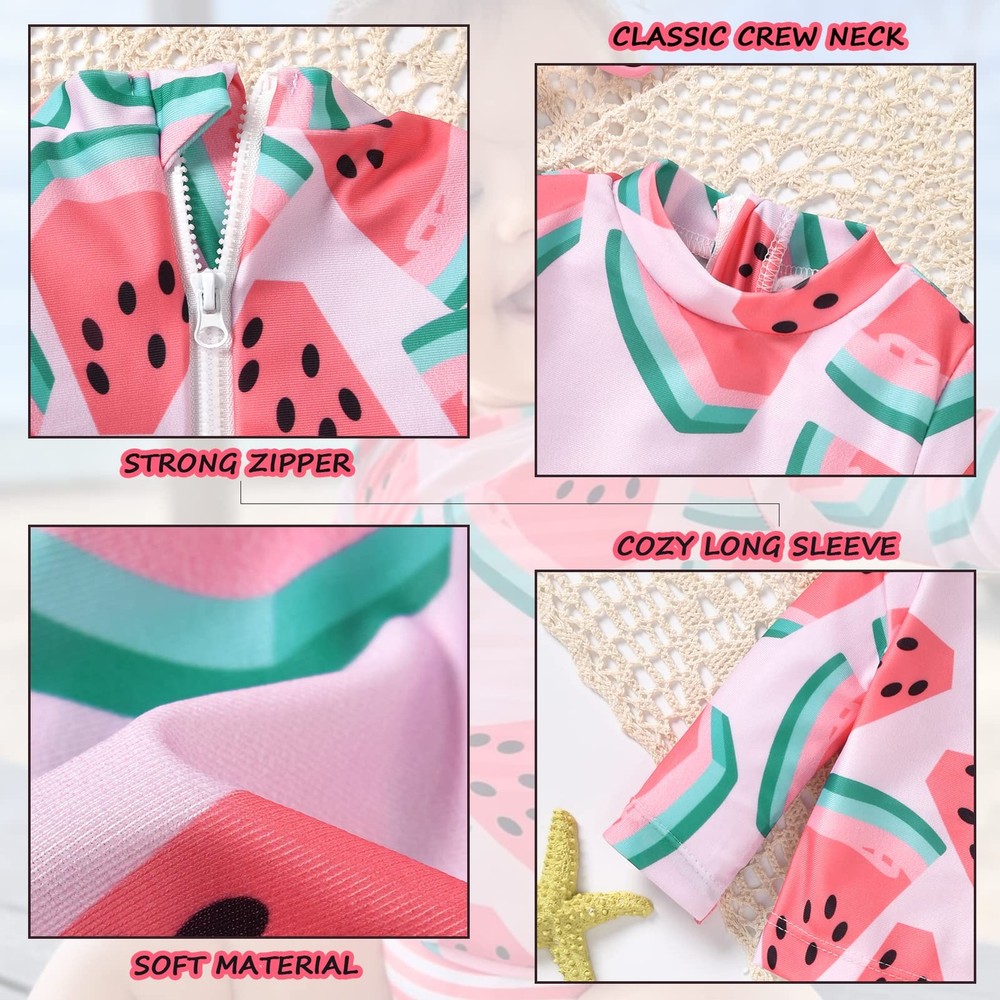 Newborn Baby Girl 3-Piece Rash guard Sets 🍉🍉【PREMIUM SWIMSUIT MATERIAL】3-pieces Baby girl swimwear sets is made of 89% Polyester, 11% Elastane, low water retention, breathable and extremely quick drying. Soft skin friendly fabric is perfect for little girls delicate skin. 🍉🍉【ADORABLE DESIGN】Adorable baby girl bathing suit has a back zip for convenience putting on and taking off. Watermelon printed long sleeve rashguard, halter swimsuit, matching a trunks, let your baby fall in love with swimming, best gift for your kid in summer. 🍉🍉【MULTISIZE TO CHOOSE】Baby rash guard is suit for newborn, 0-3 months, 3-6 months, 6-12 months, 12-18 months girls. Pls check the size detail on description before purchasing the rashguard swimsuits for your princess. 🍉🍉【BEST SUMMER GIFT】Your baby will be more attractive this summer wearing this adorable swimsuit. It is great for swimming lessons, summer vacation, pool parties, water parks, beach holidays, etc. Whenever you want to play in the water with your , swimsuit will always be with you. 🍉🍉【WHAT YOU GET】1 x rashguard + 1 x swimsuit + 1 x trunks. Machine wash with cold water and line dry away from heat.