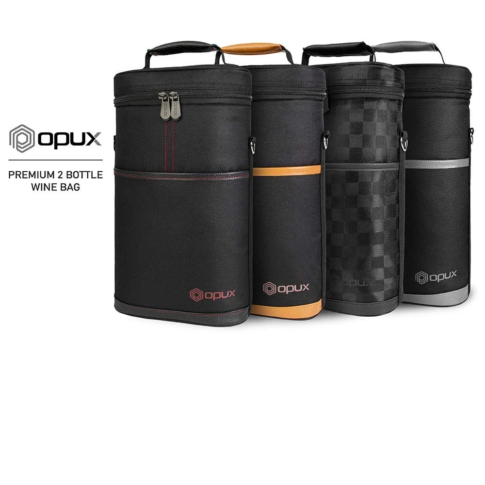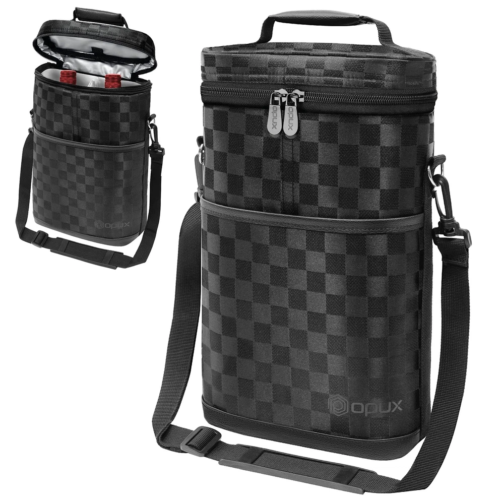 2 Bottle Wine Bag Tote Carrier | Leakproof Insulated Wine Cooler Bag for Travel, BYOB, Picnic | Padded Portable Wine Bottle Bag for Dinner Party, Christmas Gift for Wine Lovers, Women, Men Perfect for carrying wines with you while you're eating at a restaurant or a picnic, this Premium Insulated 2 Bottle Wine Tote Carrier by is equipped with dual zippers for easy opening. This wine tote carrier allows you to store more items with its front side pocket. It is lightweight and versatile, making it perfect to carry to any special occasion. A corkscrew is included with the tote carrier so you will never have to worry about bringing one from the house. This Premium Insulated 2 Bottle Wine Tote Carrier by measures 8 x 3.5 x 12.6 (L x W x H) creates quality products for your many lifestyles. Our Vision To provide premium kitchen and wine products that greatly simplifies your life. We will continue to innovate and bring exciting products to market so you can achieve more in life! Our Products At , we offer an extensive line of kitchen tools (such as salt & pepper mills), lunch bags, and wine bags/accessories made of highest quality for all occasions. Our products are meticulously designed with materials and functions that truly simplify your life so you can focus on creating your favorite meals or entertaining your guests. 2 BOTTLE WINE CARRIER TOTE: Our portable wine bag cooler is the ultimate wine bottle bag for your travel, parties, picnics, outdoor beach trips, and BYOB dinner events. Designed to transport two bottles, this padded double bottle wine carrier keeps your favorite wine chilled and protected. It's an essential accessory for wine lovers, making it an ideal gift for women, men, and drinkers who love a good glass of wine. Celebrate special days with stylish and functional wine holder bag. INSULATED & LEAKPROOF WINE COOLER BAG: Our thermal wine cooler bag keeps your wine at the perfect temperature for hours. Whether you're carrying the wine to a bar, restaurant, picnic, camping, or road trips, this wine side bag has three layers of insulating material, maintaining a steady temperature for your glass bottles, chilled wines, frozen liquor bottles and cool beer beverages. The leakproof lining ensures no spills, and it's easy to cleana must have item for wine lovers on the go! PROTECTIVE WINE BOTTLE PURSE: Safely travel with your precious wine bottles with our 2 bottle wine tote bag. Our padded wine travel bag is great for BYOB dining out at the restaurants, attending wine tastings, weddings, parties, or beach picnic trips. The thermal insulated padding provides extra protection against breakage. Its portable design makes it a wine suitcase luggage case for air plane travel. insulated wine carrier ensures proper storage and serves your favorite wine in style. WINE GIFTS FOR WINE LOVERS WOMEN: This checkered black wine tote bag is a great wine accessory gift for wine enthusiasts, sommeliers, and wine drinkers. Wine gift set idea for wine lovers, men, women, family and dad during Christmas, Valentines Day, Anniversary, Mothers, Fathers day and Birthday. The wine carrier is also a holiday present for mom, coworkers, couples during weddings, housewarmings, engagements, bridal shower, hostess, secret santa, white elephant and gift basket swap. PICNIC WINE BAG CHILLER: 2 bottle wine tote carrier kit measures 8.5 x 4 x 14 (L x W x H), it fits most standard 750ML wine bottles. Crafted from high-quality 600D polyester, this wine bag picnic essential is built to last, while the PU leather trim adds a touch of sophistication. Great wine gifts for women and wine accessories gifts for men, this classy wine bag can accommodate other alcohol bottles such as liquor, champagne, spirits, cabernet, pinot and even wine glasses.