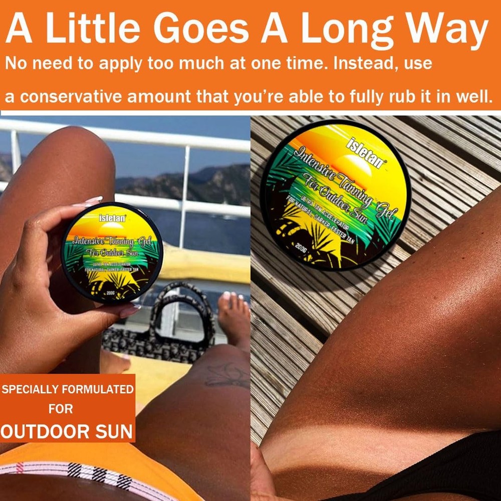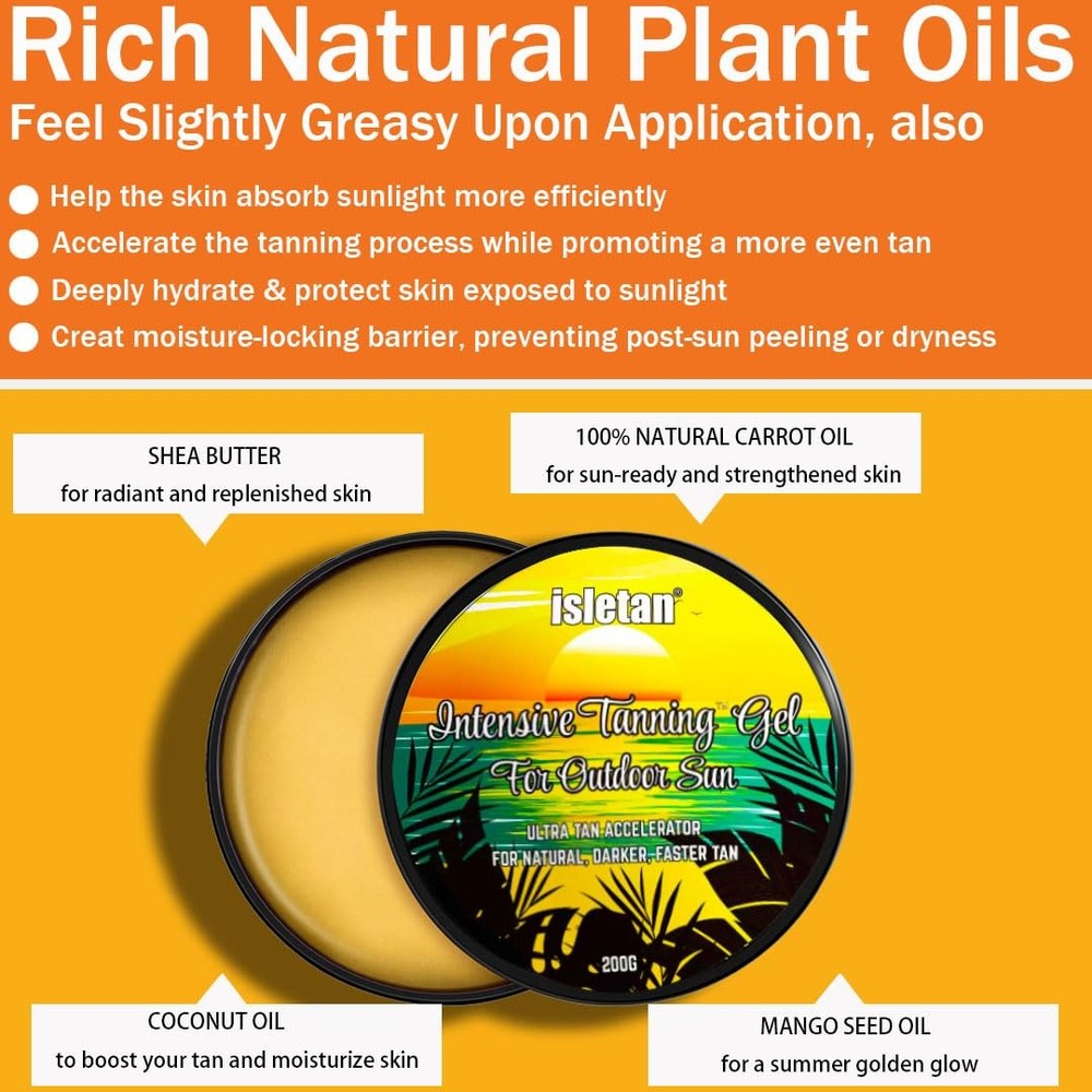 Achieve your natural, darker, long-lasting tan with less exposure to the sun with this intensive tanning gel. This ultra-tanning accelerator contains plant-based oils which effectively providing intense, deep skin hydration and stimulating, increasing melanin formation to accelerate the tanning process. Suitable for outdoor tanning. Quick Results - Specially formulated for outdoor use, this intensive tanning gel helps you develop a rich, natural-looking tan more quickly and evenly. Everything your skin needs is in one jar - 100% natural carrot oil in this natural sun tan gel for sun-ready and strengthened skin, organic coconut oil helps skin stay hydrated while tanning, sunflower oil for a summer golden glow and shea butter for radiant and replenished skin. Tattoo & Color Fade Protector Prolongs the life and radiance of your tattoos and tanning results. Premium combination of this sun tanning butter became popular for ultra dark tan lovers too! Easy to Use & suitable for all skin types - A "must have" works amazingly outdoors which is super effective in the sun. Rub it evenly & Expose yourself to sun rays to aid in skin absorption to have that glow! Regardless of skin type, you can use this product - however, you will achieve the effect if you have olive skin or with a base tan. A prefect choice sun tan enhancer even for people with pale skin. Ultimate Hydration & Skin Firming. People love how our sun tan gel for outdoor sun helps prevent against wrinkles and signs of ageing. Contains coconut oil and botanical extracts that lock in moisture to provide intense, deep skin hydration, all of which are powerful antioxidants, this tan enhancer for sun fights off free radicals, gently nourishes and cleanses your skin leaving it smooth, fresh, luxurious and supple, giving a maximum tanning experience. Natural & Vegan & Cruelty-free. tan accelerator for holiday takes no shortcuts in bringing you the best for your skin. Our products contain only the fine natural, nourishing ingredients loved by every skin type.
