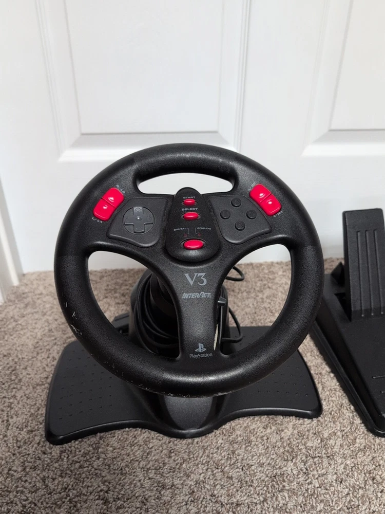 Enhance your racing game experience with the InterAct PlayStation PS1 V3 Racing Wheel. This wired controller is compatible with both Sony PlayStation 1 and Sony PlayStation 2. It features a sleek black design and is compatible with various racing games. The package comes with a steering wheel and pedal set, but please note that it has not been tested. Add this InterAct PlayStation PS1 V3 Racing Wheel to your collection of video game accessories and enjoy a more immersive racing experience.