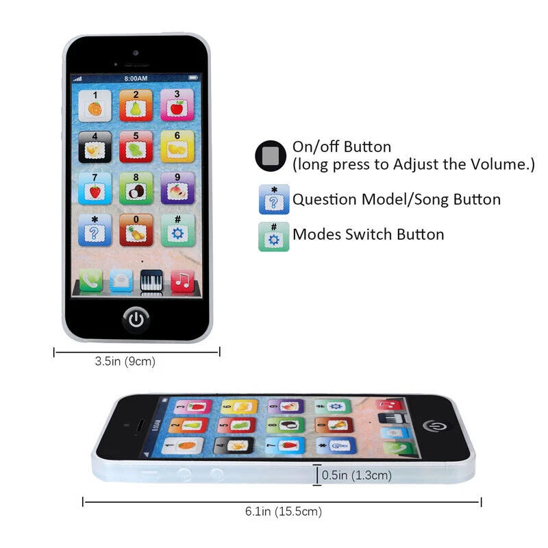 Educational Learning Toys Cell Phone for Kids Age 2 3 4 5 6 7 Years Old Boy Girl FEATURES: *Boasts 8 different modes and plenty of sound effects. *The Y Phone feeds curiosity to learn through touch, sound and sight. *The Toy Phone has the same appearance specifications as the iPhone *Rechargeable with Type-C USB (included). On/off switch on the bottom. *Lights flash in multi colors around the edges when a button is pressed, very visually stimulating. SPECIFICATIONS: Recommended Age Range: 3+ Feature: 8 Large Function Gender: Boy & Girl Theme: Role Play Cell Phone Style: Educational Toy, Musical Toy Material: Plastic Plastic Type: ABS Category: Phone Product size: 15.5*9*1.3cm /6.1*3.5*0.5inch Color: Black Language: English Charging : Type-C USB Connect (Included) Item name: Children touching screen English learning talking y-phone toy. PACKAGE INCLUDED: 1 x Toy Cellphone Payment Delivery details Terms of sales About us Contact us Payment Payments: Paypal, Google Pay, Visa, Master Card, Amerian Express, Discover. Delivery details All items are shipped from US warehouse located at NJ . We ship to your eBay or Paypal address. Please make sure your eBay or Paypal address is correct before you pay. Terms of sales Free return About us Pls contact our customer service firstly if have any problems , we will help to solve the issue, and could offer free return service for full refund or free replacement after confirming. You can buy from us with confidence Contact us If have any problems, please feel free to contact us.