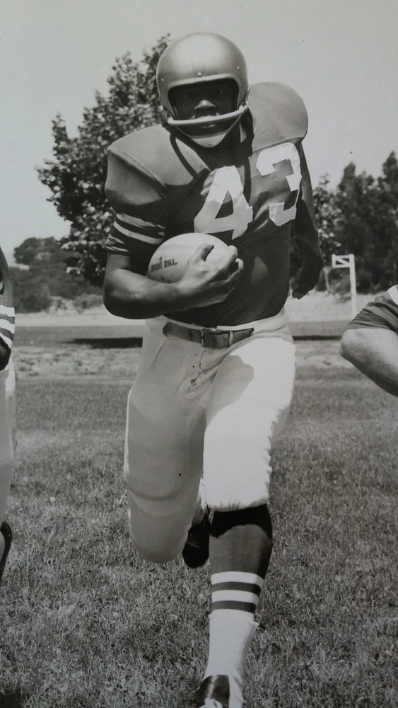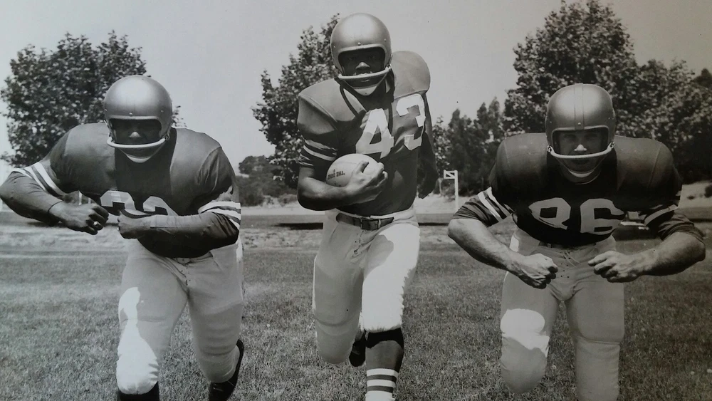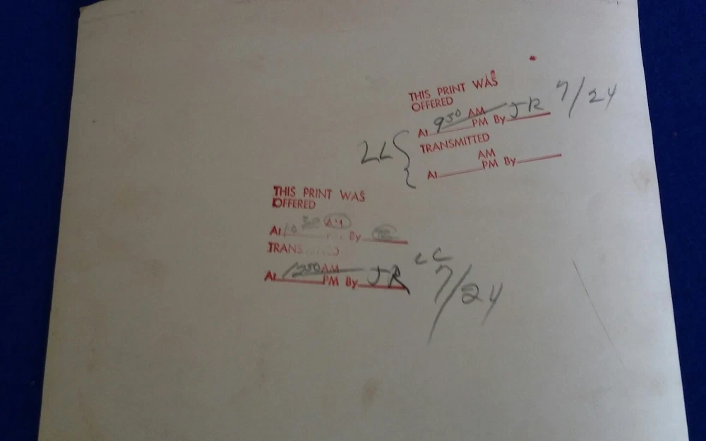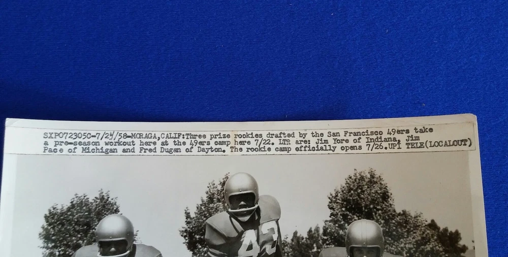 International news press photo of 49ers Rookies Jim Yore Jim Pace Fred Dugan from left to right. Dated 7-24-58. Rookie camp officially opens 7-6-58. Measurements are 9" by 7". Please refer to pictures for details.