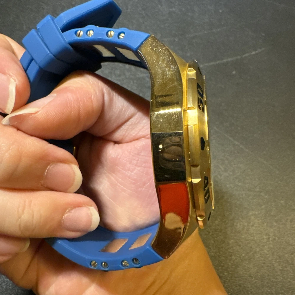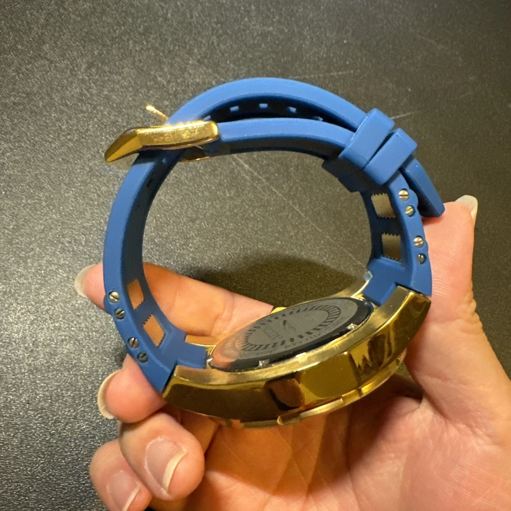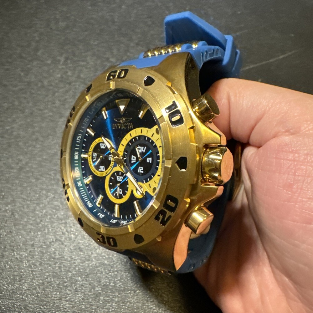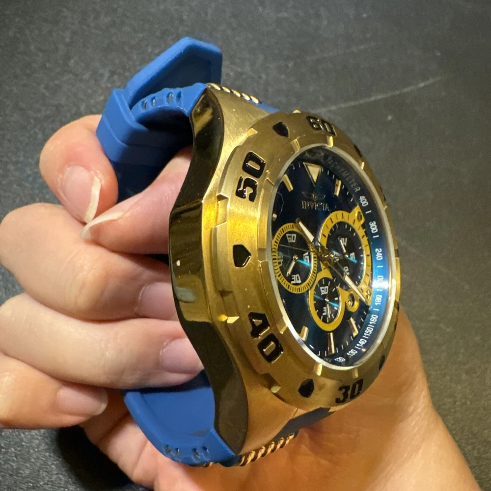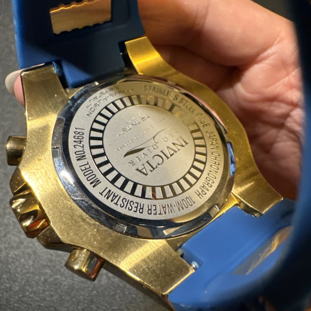 Introducing the Invicta Pro Diver 24681, a stunning men's wristwatch with a 52mm yellow gold-plated stainless steel case and a blue polyurethane band. This watch features a fixed blue bezel, a blue dial with minute, second, hour, date, chronograph, and tachymeter functions, and a solid caseback. With a water resistance of 100 meters/330 feet, this watch is perfect for professional divers and anyone who loves the ocean. The Invicta Pro Diver 24681 is a quartz movement watch that is suitable for left-handed men and has a tang clasp. This watch is an excellent addition to any collection and is sure to impress. Personal used condition in collection. Not currently running. NEEDS NEW BATTERIES! Bought couple years back and it's been in storage. No box. Just the watch itself with the band. Very good pristine condition. Currently sold out at retail value on official site: $199.00 very rare to find. offers welcome.