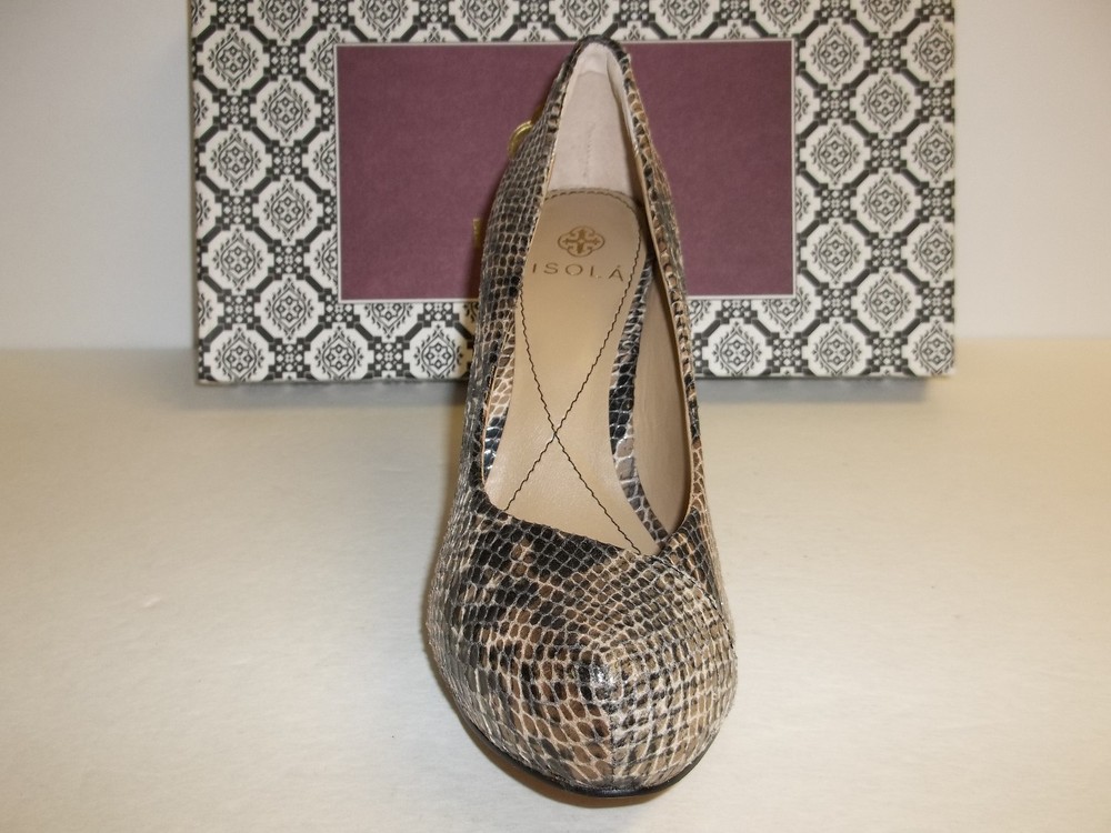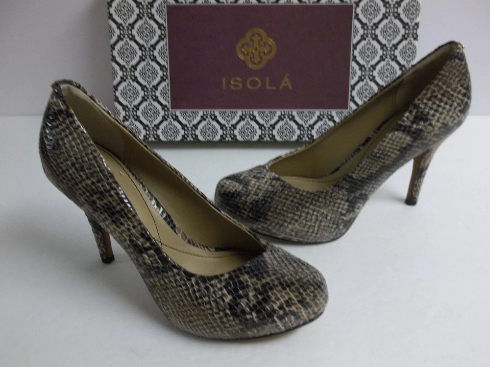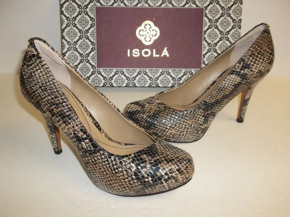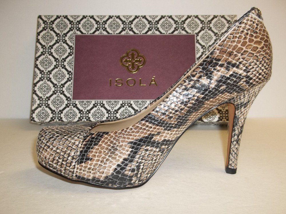 Isola Size 6.5 M Cagney Snake Print Sand Leather Platform Pumps New Womens Shoes. Leather snake print upper. Remainder is man made materials. Actual heel height is approx 4 inches. Platform is approx 3/4 inches. Euro 37.5.