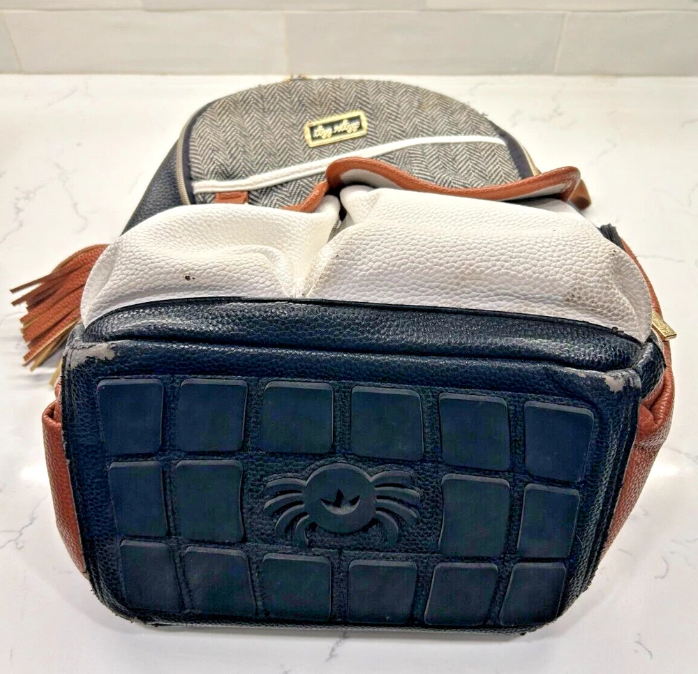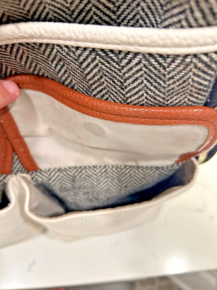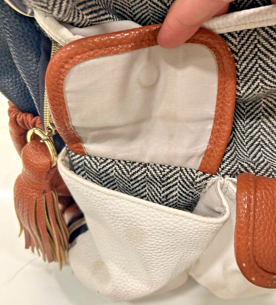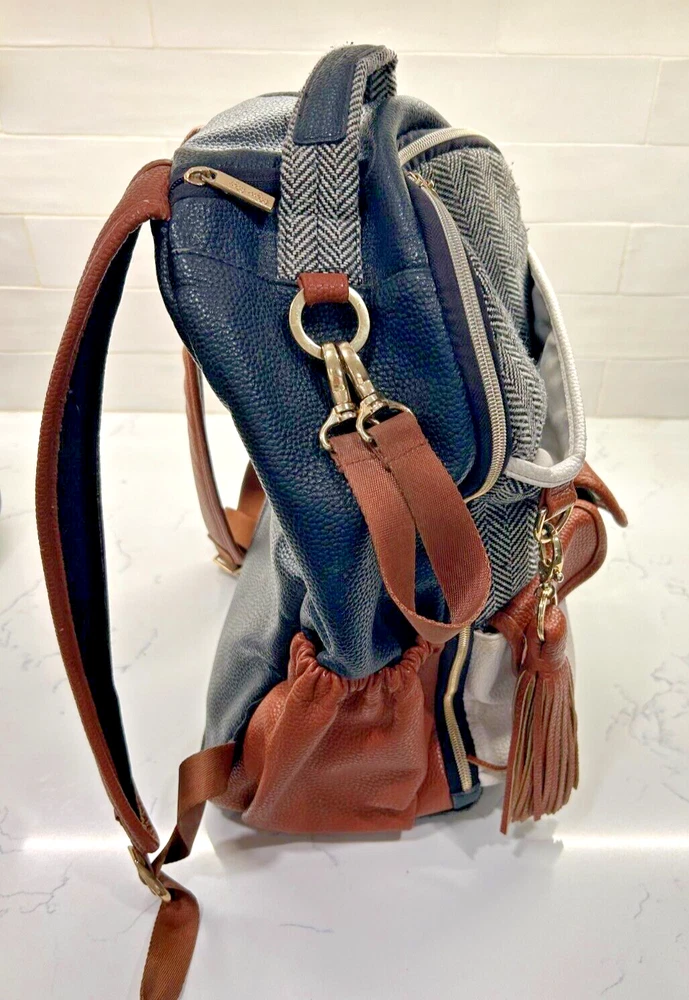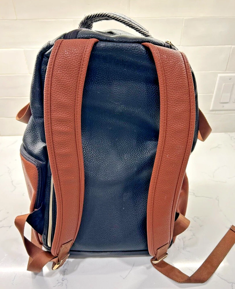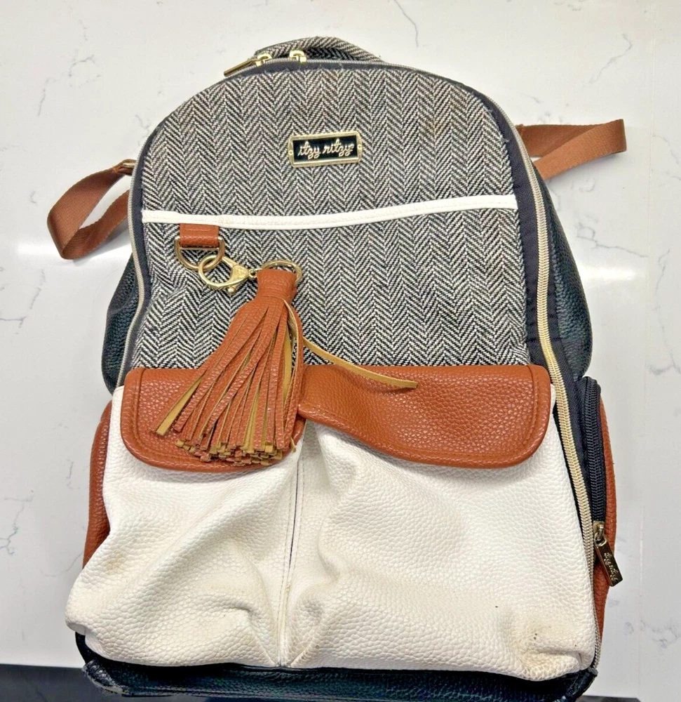 This Itzy Ritzy back pack is the perfect accessory for any parent on the go. With a stylish coffee and cream color combination, this large diaper bag is spacious enough to hold all your baby's essentials. The backpack features a zippered front pocket and two adjustable straps for a comfortable fit.Made from high-quality leather, this designer bag is durable and perfect for everyday use. The Itzy Ritzy brand is known for its stylish and functional baby accessories, and this back pack is no exception. Whether you're running errands or heading out for a day trip with your little one, this backpack is the perfect choice. Note: There is a small ink stain on the bottom of one the backpack straps. It is in the pictures above.