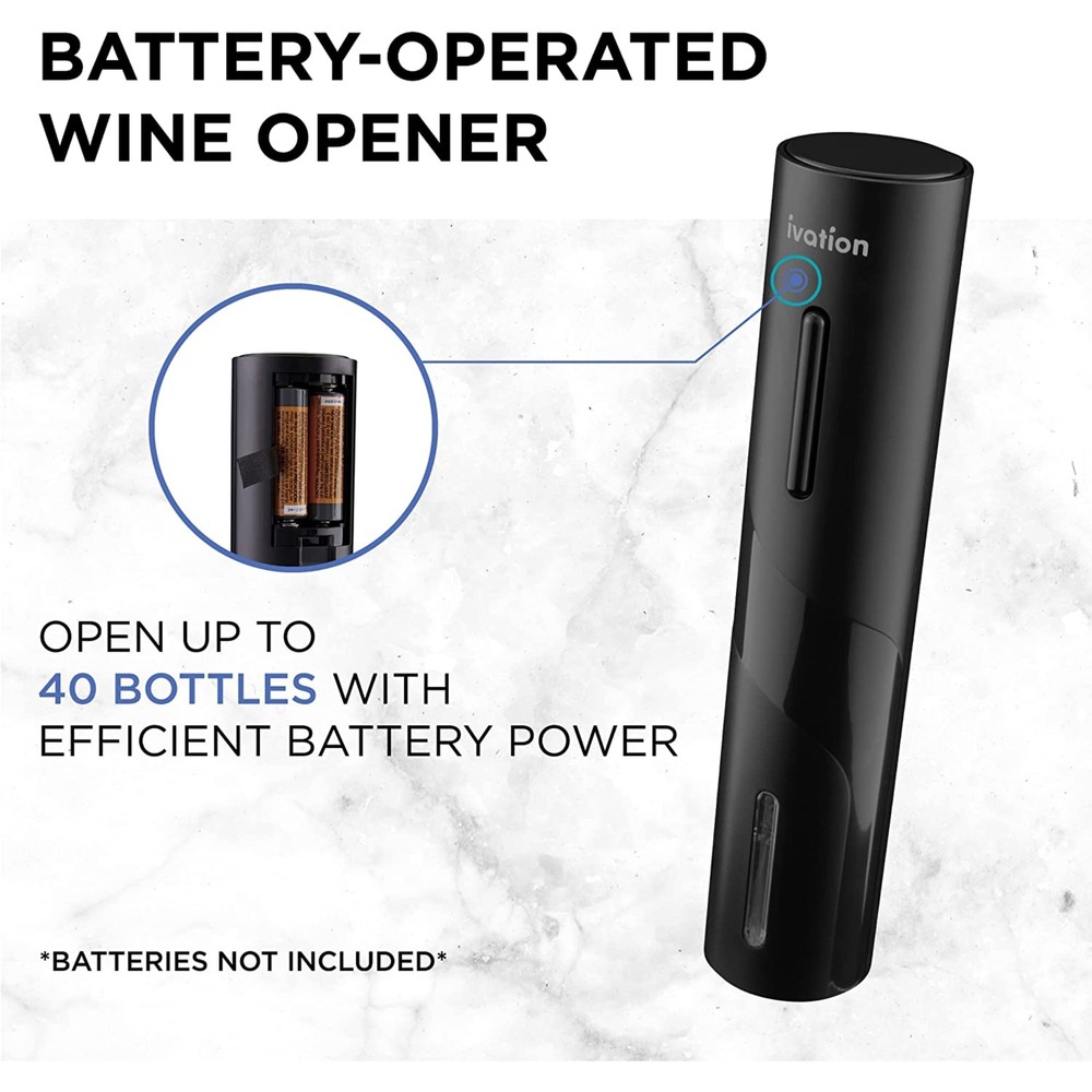 Have you sipping on flavor in seconds!Wine never tasted so sensationally with the electric wine bottle opener set. Featuring a curated list of opening, pouring, and more, this amazing electric wine opener set transforms your hosting prowess to the next level. This electric corkscrew wine opener is cordless fully battery-operated and compact, so bring the electric wine set whenever you go. Save Time & money with our wine gift set!Features: Perfect gift set for friends or family Preserve up to 2 bottles of wine Easily open bottles in seconds Long lasting on a single charge Keeps wine flavorful with aerator Open 40 bottles before needing to charge Aerator enhances the wine flavor with each pour WARNING: Cancer and Reproductive Harm www.P65Warnings.ca.govDimensions: 11.4" L x 10.8" W Free Shipping Over $49.99* Details Ivation 7-Piece Wine Gift Set, Electric Wine Opener, Wine Aerator Pourer Product Description: Have you sipping on flavor in seconds! Wine never tasted so sensationally with the electric wine bottle opener set. Featuring a curated list of opening, pouring, and more, this amazing electric wine opener set transforms your hosting prowess to the next level. This electric corkscrew wine opener is cordless fully battery-operated and compact, so bring the electric wine set whenever you go. Save Time & money with our wine gift set! Features: Perfect gift set for friends or family Preserve up to 2 bottles of wine Easily open bottles in seconds Long lasting on a single charge Keeps wine flavorful with aerator Open 40 bottles before needing to charge Aerator enhances the wine flavor with each pour WARNINGCancer and Reproductive Harm www.P65Warnings.ca.gov Dimensions: 11.4" L x 10.8" W x 17.7" H Technical Details: Power source4 x AA batteries Operating limit40 bottles per charge Compatible cork diameter0.79" - 0.94"