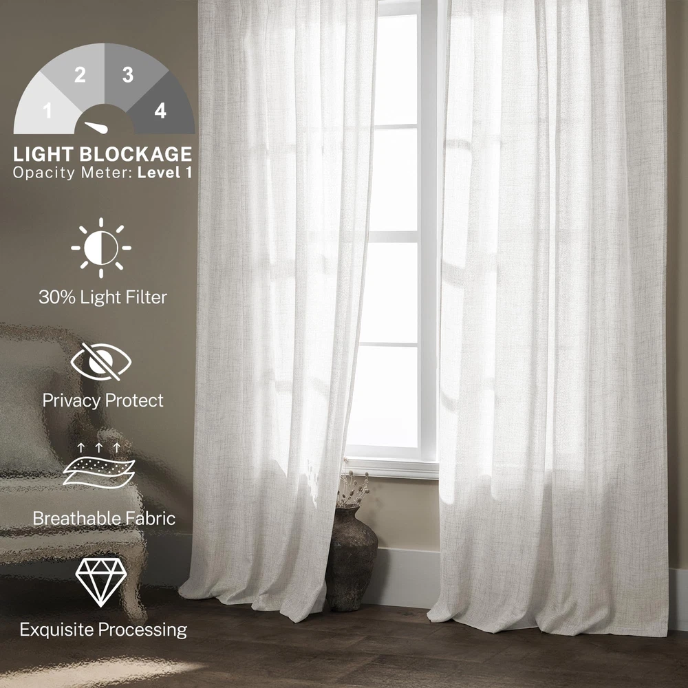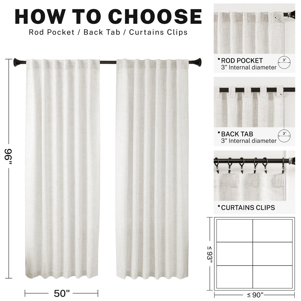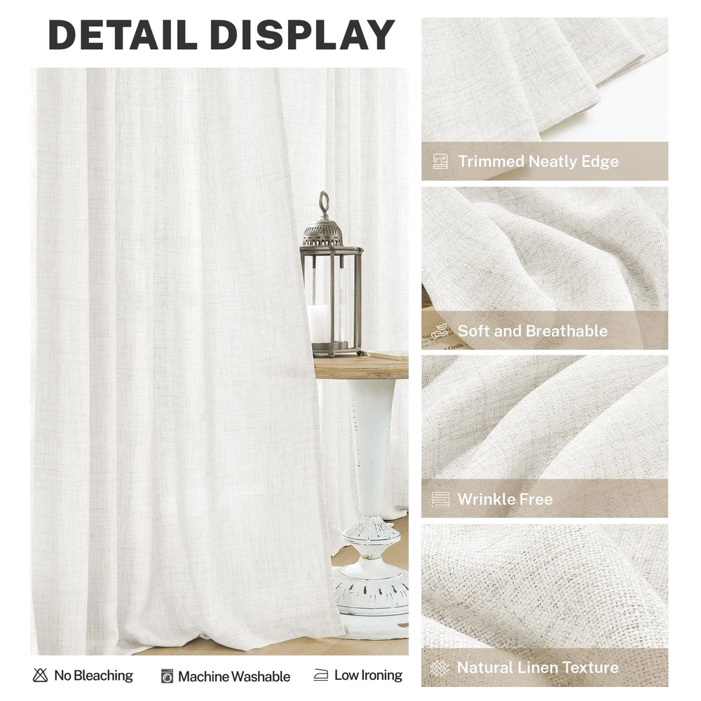 Exquisite Craftsmanship: Each panel is meticulously crafted by our professional workers, with neatly trimmed threads and seams. fabric designers are dedicated to developing affordable and high-quality fabrics, helping customers enjoying the lightweight and breathable linen polyester blend curtains with low budgets. Modern Aesthetics: With the look and texture of burlap, this faux linen curtains own the unique beauty of minimalism and modern art, which add a simple and fashionable style modern sense to your room. So these curtains are widely applicable to your living room, bedroom, farmhouse house, patio sliding glass door, dining room, home theater, closet door, nursery, room... Semitransparent Sheer: Protect your privacy while filtering out dazzling sunlight and let natural light flow into your room. Balance privacy and room lighting perfectly-this is the unique function of semi sheer curtains. Package Set: 2 panels in 1 package. Singel Panel measures: 50"W x 96"L|Set measures: 100"W x 96"L. 3 Hanging Options: Back Tab, Rod Pocket or Clip Rings(Not Included). The 3-in-1 construction makes these curtains easy to hang. You can hang them to decorate your modern minimalist house. Easy Care: Hand washable, no bleach, tumble dry low. Durable linen polyester blend curtains are not easily wrinkled, even if there are minor creases, they can be removed with a low temperature iron. ANY QUESTIONS, PLEASE FEEL FREE TO US!