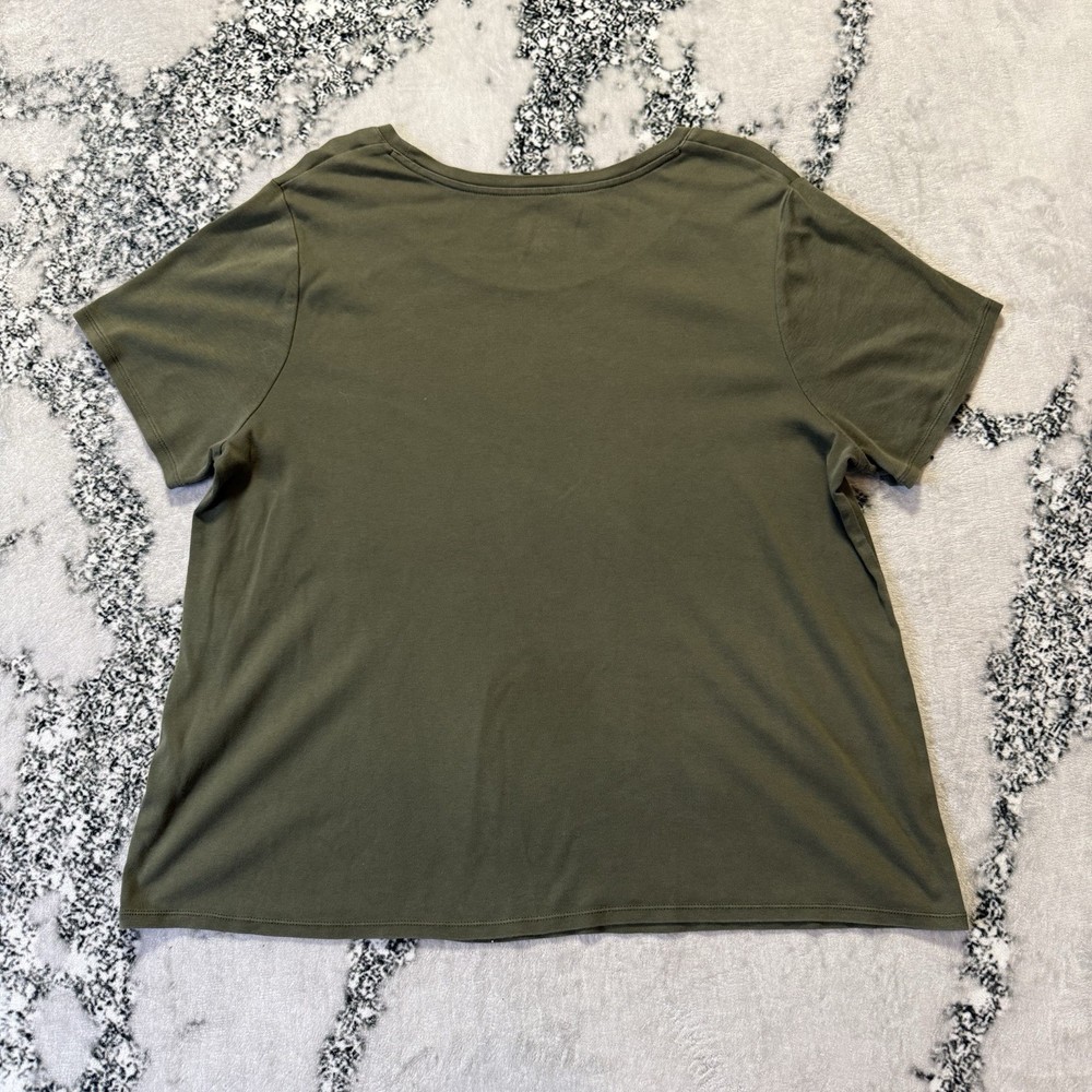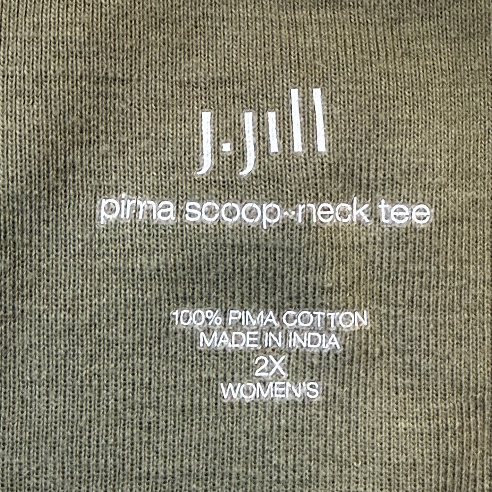 This J. Jill Tee is a women's size 2X green shirt made from 100% Pima cotton. It features a scoop neckline and short sleeves, making it perfect for casual occasions in the summer or spring. The pullover closure and regular fit provide comfort and ease of wear. Made in India, this basic t-shirt is machine washable for easy care. The solid green color and woven fabric give it a timeless and versatile look. Excellent Condition.